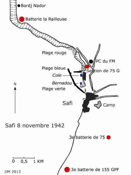Safi je důležitý rybářský přístav a přístav pro nerostné suroviny, který vyváží především fosfáty z dolů v regionu. Jeho obrana je během první světové války velmi lehká, protože ho v roce 1917 brání pouze dvě děla. V listopadu 1942 má přístav pro Američany strategický význam, protože právě zde mají vylodit své obrněné jednotky. Místo je v té době bráněno třemi bateriemi: