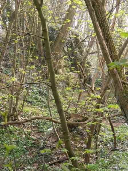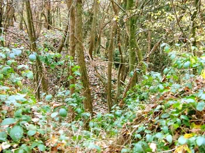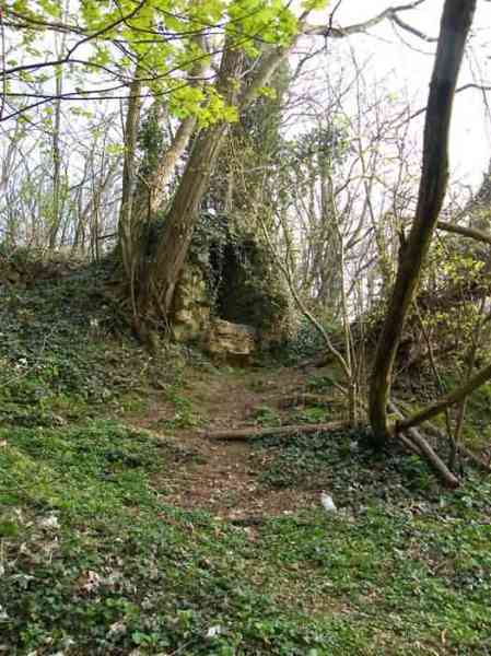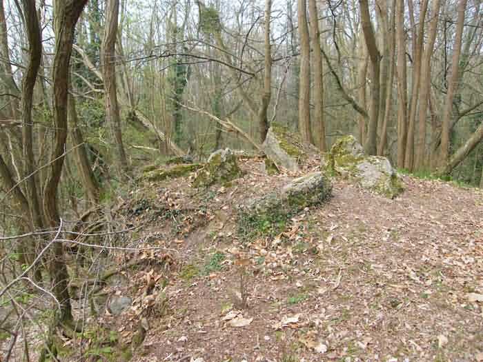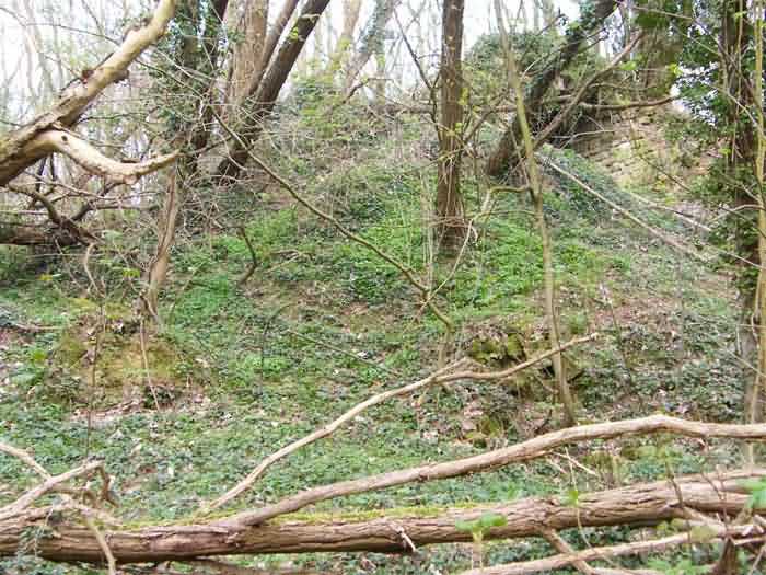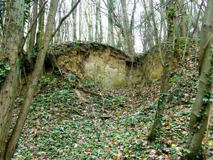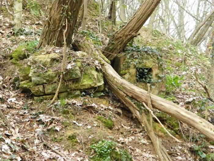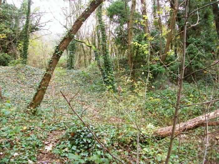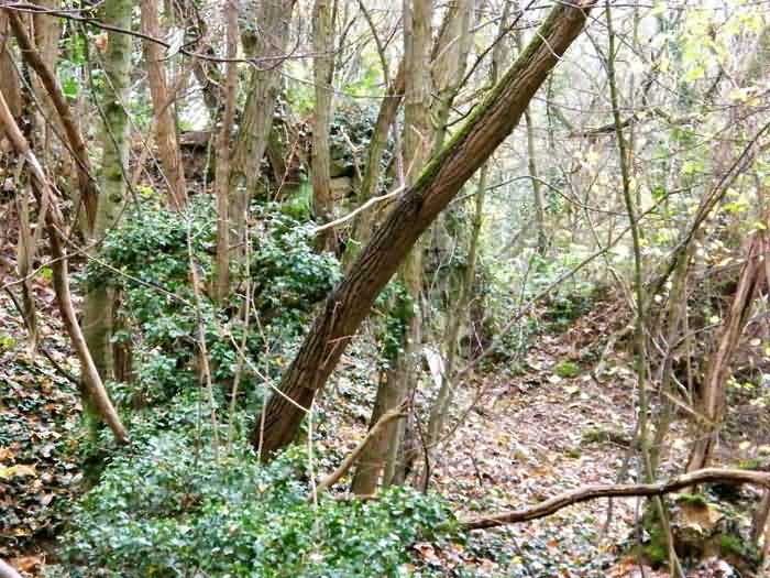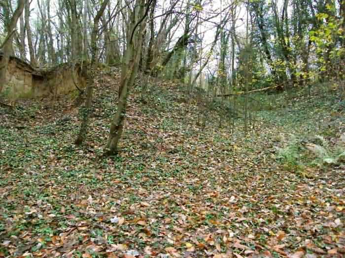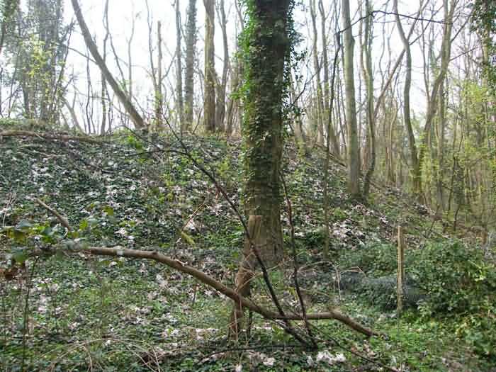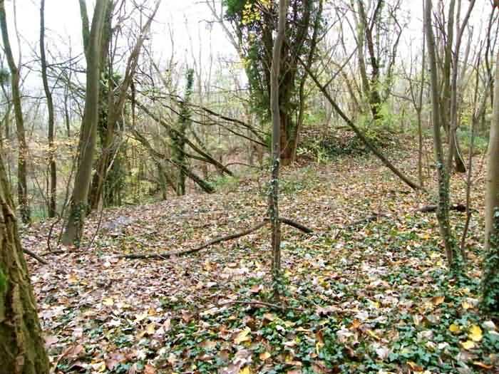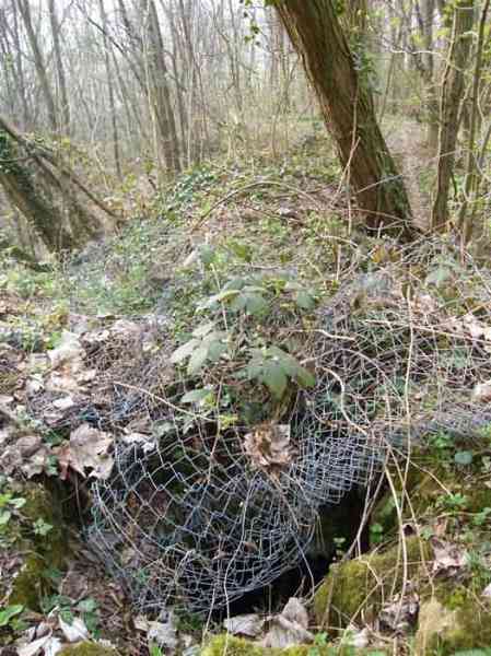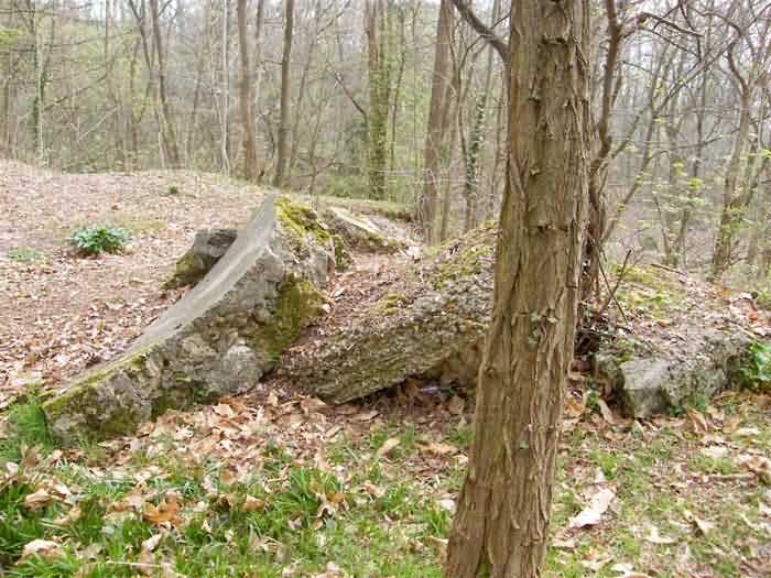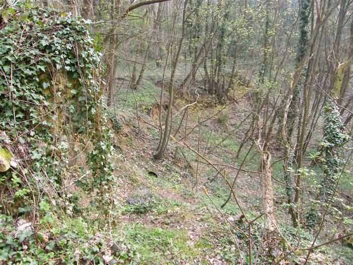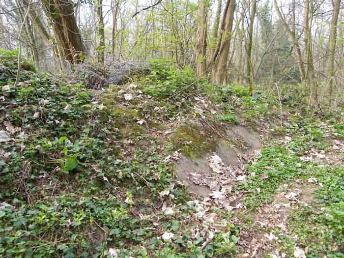 Fortress Paris, NNE of the city, 1877-1878. Annex battery of the fort of Écouen located near the V salient of this fort. Without a ditch and with an open gorge, it is almost square in shape, the western front extending into a firing parapet almost to the access road of the neighboring fort. It housed only 3 guns and three hollow traverses, of which No. 3 (northwest) served as a shelter for the men and a small ammunition store. It had actions to the south and flanked the rear of the Moulin battery, located on the other side of the N 16. Built on unstable ground due to underground quarries, only the badly damaged remains of a sheltered crossing remain. The site has been abandoned and particularly affected by collapses.
