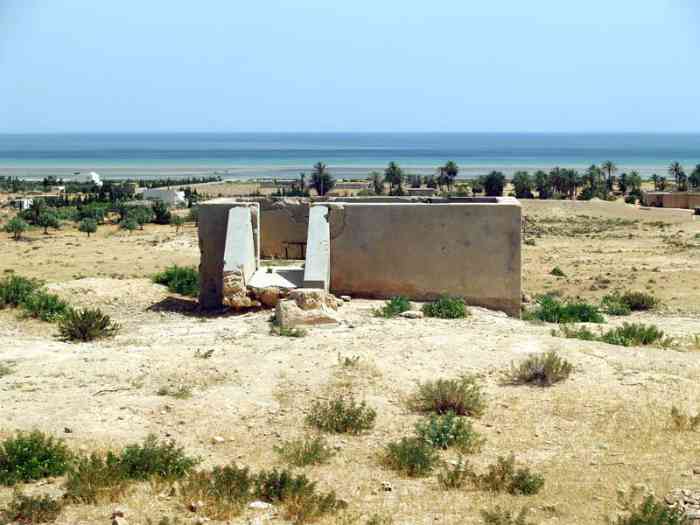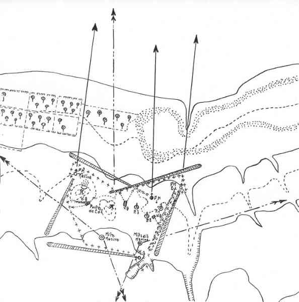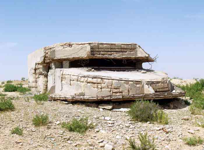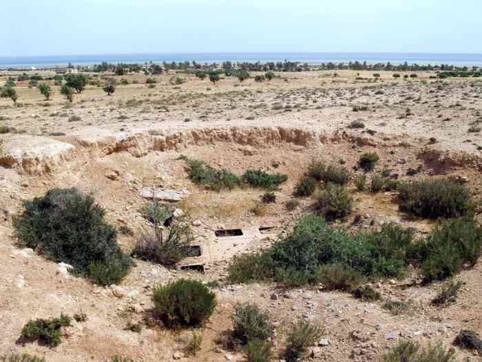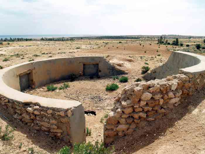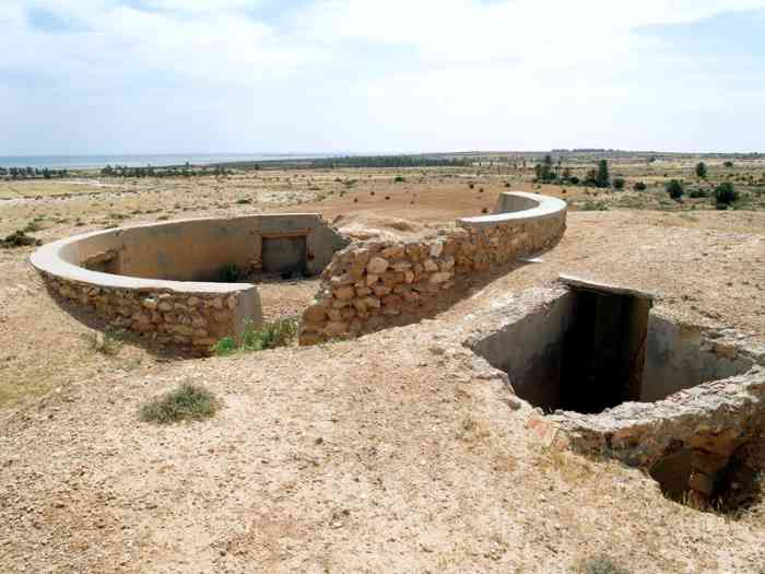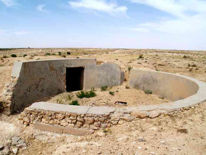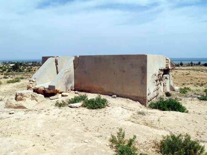Mareth. Il s’agit d’une batterie d’artillerie secondaire semi-fixe, armée de trois canons de 138 Mle 1910 sur affût Mle 1919-25, réalisée en 1939, à 10 000 mètres au nord-nord-est de Mareth, et à 2 000 mètres au nord de Zarat. Elle a deux missions, défense du golfe de Gabès, et appui de la ligne Mareth. Ses pièces sont installées sur plateformes en tôle T Mle 1935. Les munitions sont emmagasinées dans des soutes en tôle métro, recouvertes de terre. Le poste directeur de tir, protégé par une dalle en béton de 150 cm, est équipé d’un conjugateur C Mle 26 et d’un télémètre C de cinq mètres OPL Mle 1937. La batterie dispose d’un projecteur de 150 GP Bréguet. Sa défense contre avions est assurée par deux mitrailleuses de 8 mm. Étant donné sa position très isolée, et sa double mission, elle est protégée par un réseau barbelé de cinq mètres de profondeur, et sa défense est assurée par une section d’infanterie, fournie par les unités du sous-secteur de Zarat, avec son armement organique. Après l’armistice de juin 1940, les canons de Sidi-Marmora sont évacués sur Sfax, mais la commission d’armistice italienne exigera leur livraison, au prétexte que ces matériels, clairement identifiés, faisaient partie de l’armement fixe de la ligne Mareth. Les canons seront livrés à la frontière libyenne en décembre 1940. On n’en entendra plus jamais parler. Ce sont les seuls matériels de la ligne Mareth récupérés par l’armée italienne. De nos jours, le poste directeur de tir est toujours présent, de même que les emplacements de pièces. Mais seul l’emplacement N°1, réalisé en moellons cimentés, peut-être qualifié de « cuve ». Les autres ne sont que des alvéoles en terre. Es handelt sich um eine halbstationäre Sekundärartilleriebatterie, bewaffnet mit drei 138-mm-Kanonen Mle 1910 auf Lafette Mle 1919-25, errichtet 1939, 10 000 Meter nordnordöstlich von Mareth und 2 000 Meter nördlich von Zarat. Sie hat zwei Aufgaben: Verteidigung des Golfs von Gabès und Unterstützung der Mareth-Linie. Ihre Geschütze sind auf Plattformen aus Blech T Mle 1935 installiert. Die Munition wird in Wellblechbunkern gelagert, die mit Erde bedeckt sind. Der Feuerleitstand, geschützt durch eine 150 cm dicke Betonplatte, ist mit einem Konjugator C Mle 26 und einem 5-Meter-Entfernungsmesser C OPL Mle 1937 ausgestattet. Die Batterie verfügt über einen 150-cm-Scheinwerfer GP Bréguet. Ihre Flugabwehr wird durch zwei 8-mm-Maschinengewehre sichergestellt. Angesichts ihrer sehr isolierten Lage und ihrer Doppelaufgabe ist sie durch einen fünf Meter tiefen Stacheldrahtverhau geschützt, und ihre Verteidigung wird von einer Infanteriesektion mit ihrer organischen Bewaffnung übernommen, die von den Einheiten des Unterabschnitts Zarat gestellt wird. Nach dem Waffenstillstand vom Juni 1940 werden die Kanonen von Sidi-Marmora nach Sfax evakuiert, aber die italienische Waffenstillstandskommission wird ihre Auslieferung fordern, unter dem Vorwand, dass diese klar identifizierten Geschütze zur festen Bewaffnung der Mareth-Linie gehörten. Die Kanonen werden im Dezember 1940 an der libyschen Grenze übergeben. Man wird nie wieder von ihnen hören. Dies sind die einzigen von der italienischen Armee erbeuteten Geschütze der Mareth-Linie. Heutzutage ist der Feuerleitstand noch vorhanden, ebenso wie die Geschützstellungen. Aber nur Stellung Nr. 1, aus Zementbruchsteinen ausgeführt, kann als „Grube“ bezeichnet werden. Die anderen sind nur Erdstellungen. Het betreft een halfvaste secundaire artilleriebatterij, bewapend met drie 138 mm-kanonnen Mle 1910 op affuit Mle 1919-25, gerealiseerd in 1939, op 10 000 meter ten noordnoordoosten van Mareth, en op 2 000 meter ten noorden van Zarat. Zij heeft twee taken, verdediging van de golf van Gabès, en ondersteuning van de Marethlinie. Haar stukken zijn geïnstalleerd op platformen van plaatstaal T Mle 1935. De munitie wordt opgeslagen in bunkers van golfplaat, bedekt met aarde. De vuurleidingspost, beschermd door een betonnen plaat van 150 cm, is uitgerust met een conjugator C Mle 26 en een vijf-meter afstandsmeter C OPL Mle 1937. De batterij beschikt over een zoeklicht van 150 cm GP Bréguet. Haar luchtverdediging wordt verzorgd door twee 8 mm mitrailleurs. Gezien haar zeer geïsoleerde positie en haar dubbele taak, wordt zij beschermd door een vijf meter diep prikkeldraadnetwerk, en haar verdediging wordt verzorgd door een infanteriesectie, geleverd door de eenheden van de subsector Zarat, met haar organieke bewapening. Na de wapenstilstand van juni 1940 worden de kanonnen van Sidi-Marmora geëvacueerd naar Sfax, maar de Italiaanse wapenstilstandscommissie zal hun uitlevering eisen, onder het voorwendsel dat deze duidelijk geïdentificeerde stukken deel uitmaakten van de vaste bewapening van de Marethlinie. De kanonnen zullen in december 1940 aan de Libische grens worden overgedragen. Men zal er nooit meer iets van horen. Dit zijn de enige stukken van de Marethlinie die door het Italiaanse leger zijn teruggevorderd. Tegenwoordig is de vuurleidingspost nog aanwezig, evenals de stukopstellingen. Maar alleen opstelling nr. 1, uitgevoerd in gecementeerde breuksteen, kan worden gekwalificeerd als „kazemat“. De andere zijn slechts aarden cellen. This is a semi-fixed secondary artillery battery, armed with three 138 mm guns Mle 1910 on mounting Mle 1919-25, built in 1939, 10,000 metres north-north-east of Mareth, and 2,000 metres north of Zarat. It has two missions, defence of the Gulf of Gabès, and support of the Mareth Line. Its pieces are installed on sheet metal platforms T Mle 1935. Ammunition is stored in corrugated iron magazines, covered with earth. The fire control post, protected by a 150 cm concrete slab, is equipped with a conjugator C Mle 26 and a five-metre rangefinder C OPL Mle 1937. The battery has a 150 cm searchlight GP Bréguet. Its anti-aircraft defence is provided by two 8 mm machine guns.