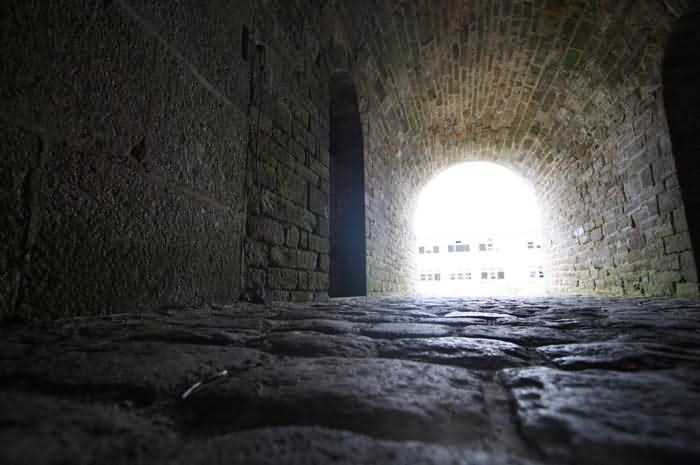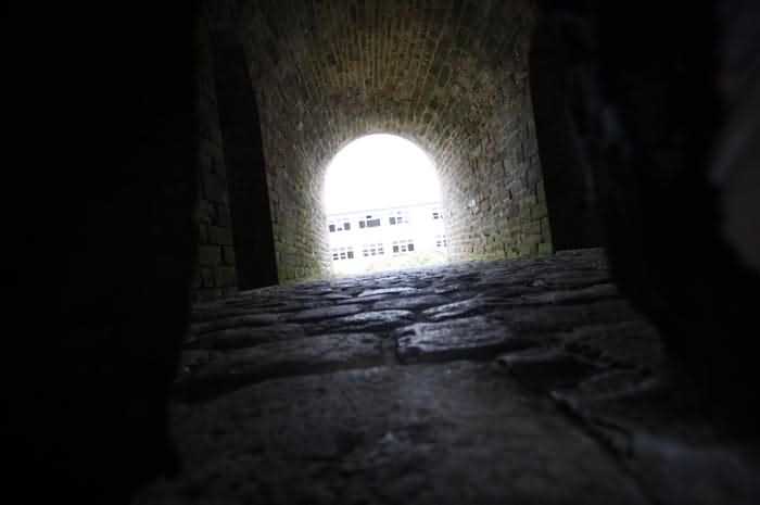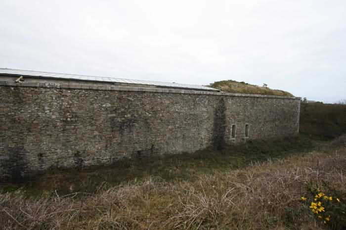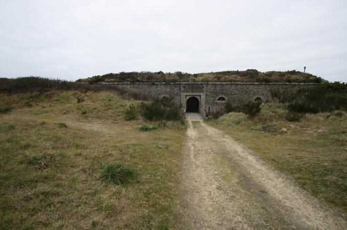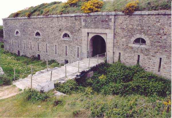 Place de Brest, dispositif des Blancs Sablons. Implanté en arrière du cordon dunaire, cinq cent mètres au sud du réduit nord des Blancs Sablons, ce fort a été érigé en 1850. Il est de forme carrée et est cerné d'un fossé sec, non défendu. Les murs d'escarpe ont environ 45 m de longueur. L'intérieur, occupé, ne nous a pas été accessible, mais l'agencement est manifestement différent des deux autres redoutes carrées voisines. Autre différence, le pont-levis ne comporte qu'une seule poulie de relèvement de chaque côté. Les extérieurs sont assez bien dégagés. Tout comme pour les deux autres redoutes carrées, nous ne pouvons nous prononcer sur la période opérationnelle de ce fort en tant qu'ouvrage d'artillerie. Voir dispositif des Blancs Sablons.