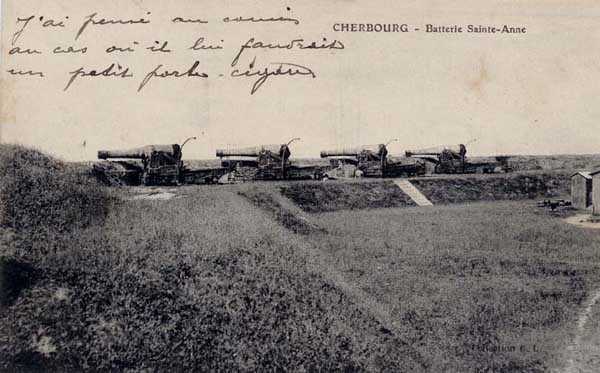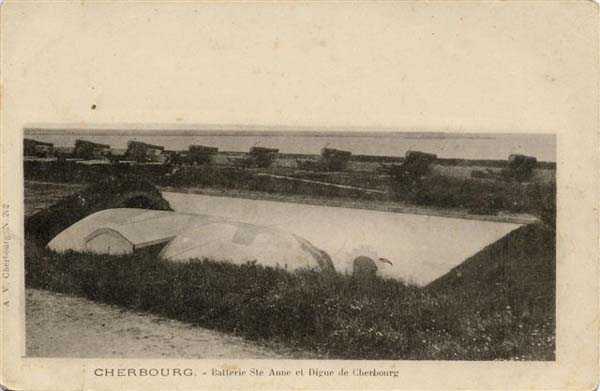 Place de Cherbourg, NO de la ville. Ancienne batterie côtière datant de 1851 et réorganisée en 1877-1878. En 1881, son armement était de 4 canons de 24 c et 8 autres de 19 c. Un plan nous montre deux emplacements supplémentaires pour canons de 19 c, à la gauche des 4 emplacements des canons de 24 c, ce qui porte l'armement à 4 x 24 c + 10 x 19 c. La batterie affecte la forme d'une crosse de hockey, le petit côté se trouvant à l'ouest. L'extrémité de ce petit coté couvrait de ses terres un petit magasin à poudre avec sas. La ligne des emplacements de tir commençait alors avec 2 x 19 c, l'angle de la crosse était suivi d'une ligne de 4 x 24 c puis de 8 x 19 c. Une seule traverse existait, elle séparait les canons de 19 c n° 8 et 9. Au-delà du dixième canon de 19 c, on construisit sous le niveau des plates-formes de tir un magasin à munitions bétonné dont le local de stockage faisait 12,6 m de longueur. En arrière des canons de 19 c n° 6 à 8, se trouvait le tertre protégeant le magasin à poudre initial auquel, en 1896, on accolera un nouveau en béton. Enfin, en arrière des canons de 24 c, on trouvait un réduit maçonné. Cette batterie ne possédait pas d'enceinte et son front de tête était en terre croulante. Le 12 juin 2005, nous n'avons pu que constater l'arasement total et très récent des infrastructures de cette batterie.