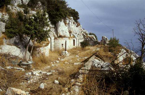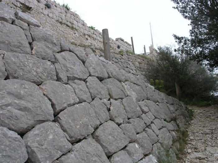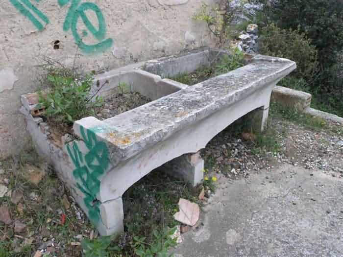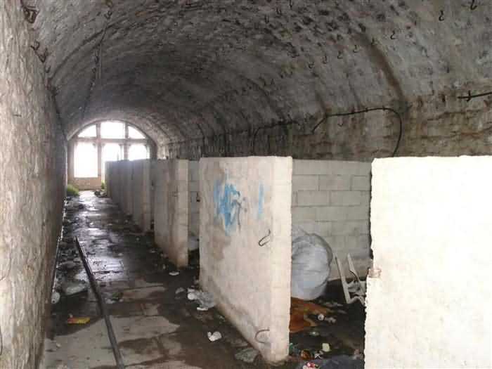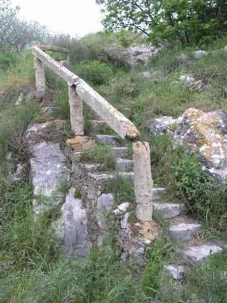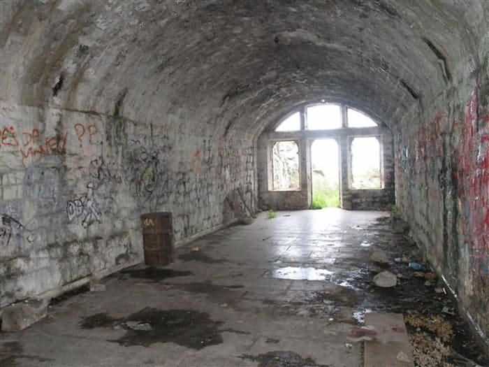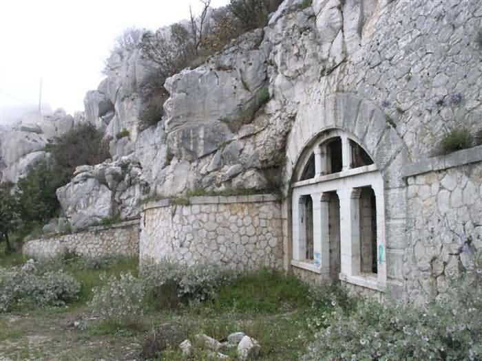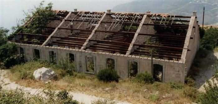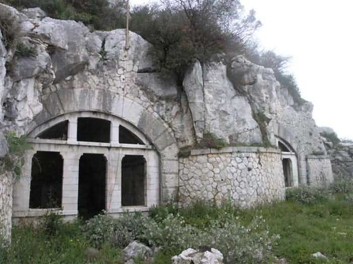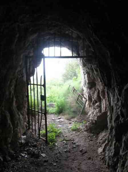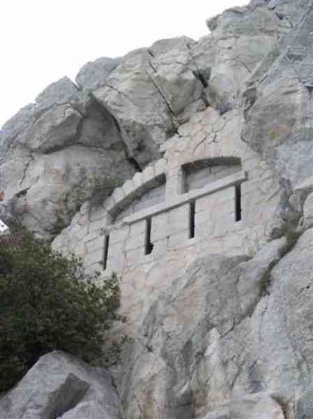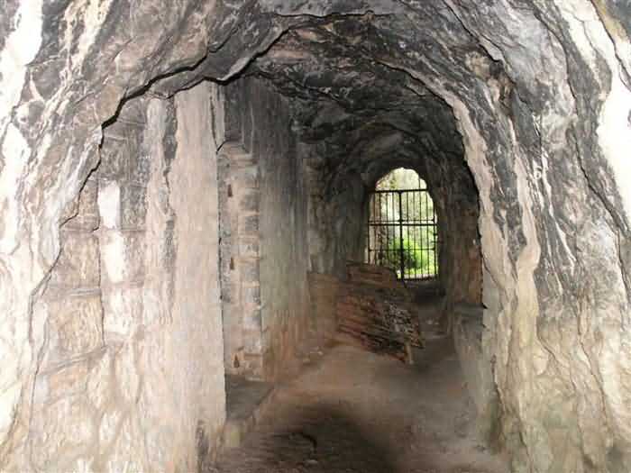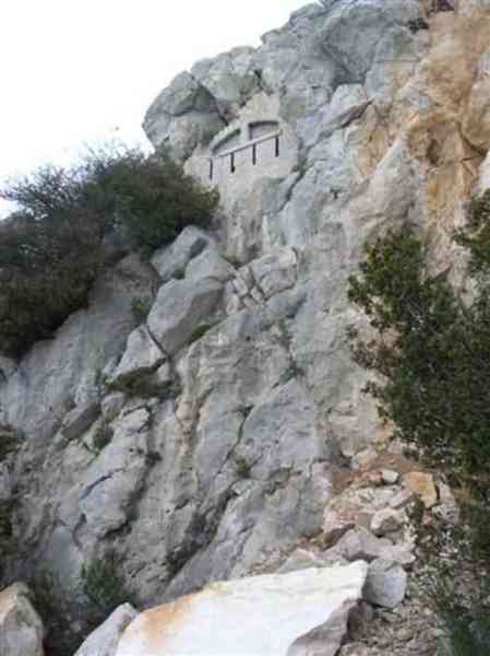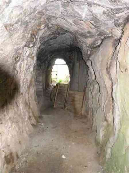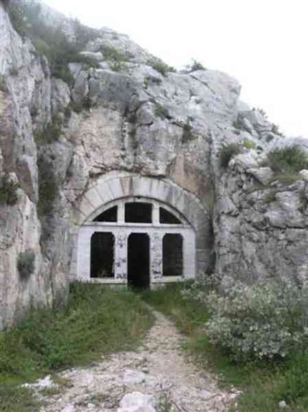Fortress of Nice, east-northeast of the city, ± 1890. 550 m/alt. Let us take advantage of this small article to briefly mention the peacetime barracks located slightly below the fort. Unfortunately, today (04/2008) it has lost its wall paintings representing insignia (76 B.A.F. in particular) and honor boards which, in August 1997, were still defying time and the elements. To reach the rock shelter, one should take the path dominating this barracks, a path sinking as a trench into the rock up to a tunnel pierced in the mountain. In the hollow of this tunnel, a room, probably a guardhouse, threatens with its embrasures a path climbing the Barre de Loubière and sometimes designated as the emergency path, meaning thereby the possible withdrawal route or route for bringing reinforcements, as the case may be. Immediately beyond the tunnel, on the left, a narrow path leads to another tunnel about fifteen meters long, having in its center and on its left a single room of dimensions 6 x 4 m. This room had a ceiling in metal sheets, but the latter have disappeared (04/2008). Opposite this room, a large niche has been arranged in the tunnel flank. The original grilles prevent continuing the path, which led to the rock magazine and then to the fort. One must retrace one's steps and reach the esplanade at the exit of the first tunnel to approach the emergency path. Note that it is possible, if not probable, that it is on this esplanade that the 4 coast guns of 95 mm mentioned by Lieutenant-Colonel Truttmann in his reference book "La barrière de fer" were placed. Nevertheless, a doubt remains, which is why we have not created, with these two rooms under tunnel and this esplanade, a separate article for an annex battery. Let us now take the path; after a few hairpin turns, it leads you below in front of the rock shelter. The latter is composed of three casemates having respectively 30, 26, and 20 m in length by 4.5 m in width. These casemates are separated by a merlon of in-situ rock about 6 m wide. A gallery, left as raw rock, joins the rear of the barracks rooms. The difference in length of these rooms is explained by an offset of the façades. The esplanade in front of the barracks rooms is still provided with its grille, but it is lying down. The places being abandoned and freely accessible, garbage and wild fires have not spared them.