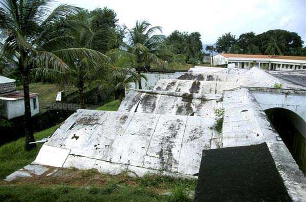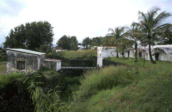 Fort-de-France. Auf dem Morne Tartenson in einer Höhe von 88 Metern erbaut, war dieses Werk ursprünglich dazu bestimmt, die Landfront von Fort-de-France nach Westen hin zu verstärken. Der erste Plan wird 1845 genehmigt, aber die Arbeiten beginnen erst 1858. Mangels Mittel werden sie sich bis 1873 hinziehen und sukzessiven Änderungen unterworfen. Am Ende präsentiert es sich als Fort mit polygonalem Grundriss, der nicht mehr viel mit dem ursprünglichen Projekt zu tun hat. Zu diesem Zeitpunkt ist man sich nicht recht im Klaren, was man damit anfangen soll, noch mit welchem Material es zu bewaffnen ist. Man plant, eine Küstenbatterie mit 4 gezogenen 30-cm-Kanonen dort zu installieren? Aber das Werk war zunächst zur Verstärkung der Landfront vorgesehen, und um diese Aufgabe zu erfüllen, erwägt man den Bau von drei Kasematten, jede mit einer 16-cm-Kanone bewaffnet. Eine davon wäre auf Fort Desaix ausgerichtet, eine andere auf Fort Saint-Louis, und die letzte auf die Route de Case Navire. Fünf 12-cm-Kanonen auf Platzlafette und zwei 32-cm-Plattenmörser würden die Bewaffnung vervollständigen. Nichts davon wird realisiert werden, und das Fort bleibt bis 1894 in Verwahrung. In diesem Jahr, und bis 1898, beherbergt es den König von Dahomey, Béhanzin, im Exil auf Martinique. Das Fort findet endlich seine wahre Bestimmung nach der Faschoda-Krise. Mit seiner erhöhten Lage und der Zunahme der Reichweite der Artillerie ist es ideal platziert, um Küstenbatterien aufzunehmen, die die gesamte Bucht unter Feuer halten können. Aber wegen Platzmangels werden diese Batterien außerhalb des Werks installiert. Sie werden über ein Netz von 40-cm-Bahnen von einem unter dem Fort gegrabenen Felsenmagazin versorgt. Dieses wird mit einer Kriegskaserne aus Beton ausgestattet. 1912 ist die Lage der Seefront wie folgt:
