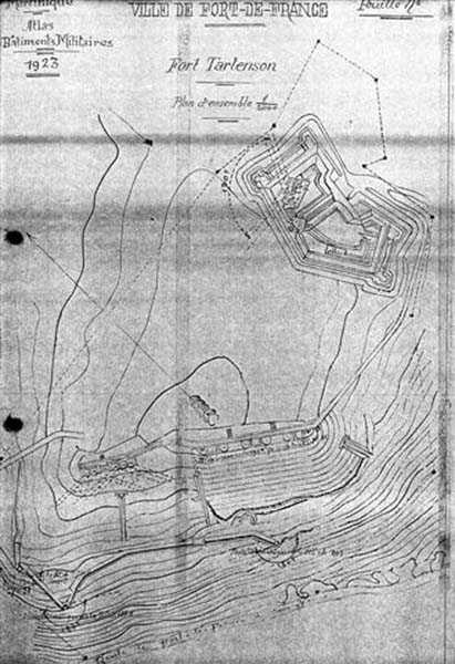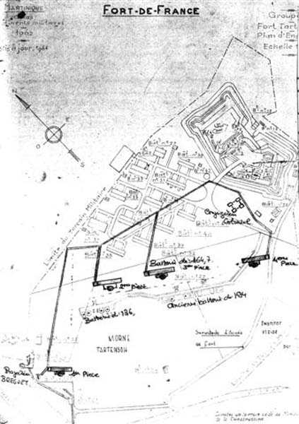 Fort-de-France. Construit sur le morne Tartenson, à l'altitude de 88 mètres, cet ouvrage était, à l'origine, destiné à renforcer le front de terre de Fort-de-France, face à l'ouest. Le premier plan est approuvé en 1845, mais les travaux ne commencent qu'en 1858. Par manque de crédits, ceux-ci vont se poursuivre jusqu'en 1873, soumis à des modifications successives. À terme, il se présente sous la forme d'un fort au tracé polygonal, qui n'a plus grand-chose à voir avec le projet d'origine. À ce moment, on ne sait pas trop quoi en faire, ni avec quels matériels l'armer. On prévoit d'y installer une batterie de côte, armée de 4 canons de 30 rayés ? Mais l'ouvrage a été d'abord prévu pour étoffer le front de terre et, pour assurer cette mission, on envisage de construire trois casemates, armées chacune d'un canon de 16 cm. Une de celles-ci serait orientée vers le fort Desaix, une autre vers le fort Saint-Louis, et la dernière vers la route de Case Navire. Cinq canons de 12 cm sur affût de place, et deux mortiers à plaque de 32 cm complèteraient l'armement. Rien de tout cela ne sera réalisé, et le fort sera laissé en gardiennage jusqu'en 1894. Cette année-là, et jusqu'en 1898, il accueille le roi du Dahomey, Béhanzin, exilé à la Martinique. Le fort trouve enfin sa véritable vocation, après Fachoda. Avec son altitude élevée, et l'augmentation de la portée de l'artillerie, il se trouve idéalement placé pour recevoir des batteries de côte, qui tiendront toute la baie sous leurs feux. Mais l'espace manquant, ces batteries sont installées à l'extérieur de l'ouvrage. Elles sont ravitaillées par un réseau de voie de 40, à partir d'un magasin caverne, creusé sous le fort. Celui-ci se voit doté d'une caserne de guerre en béton. En 1912, la situation du front de mer est la suivante :
