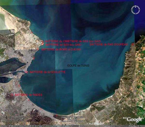 Na konci 19. století je námořní obrana Tunisu zajištěna bateriemi Radès, Bordj el Djedid a Sidi Bou Saïd, každá vyzbrojená 4 děly 19 cm Mle 1878. Tyto baterie jsou v roce 1900 odzbrojeny, přičemž priorita je dána výzbroji Bizerty. Čtyři kusy materiálu na lafetách PC jsou mimochodem tam odeslány a slouží pak dočasně k vybavení baterie Djebilet Rara. V roce 1939 obrana zahrnuje dvě sekundární dělostřelecké baterie :