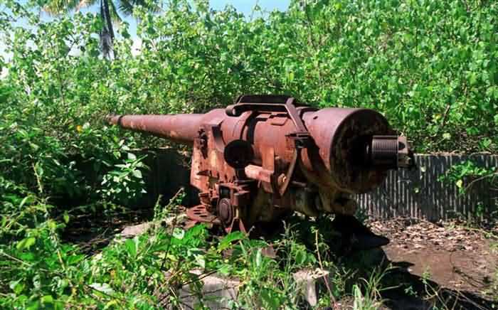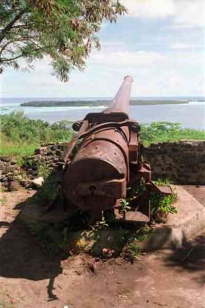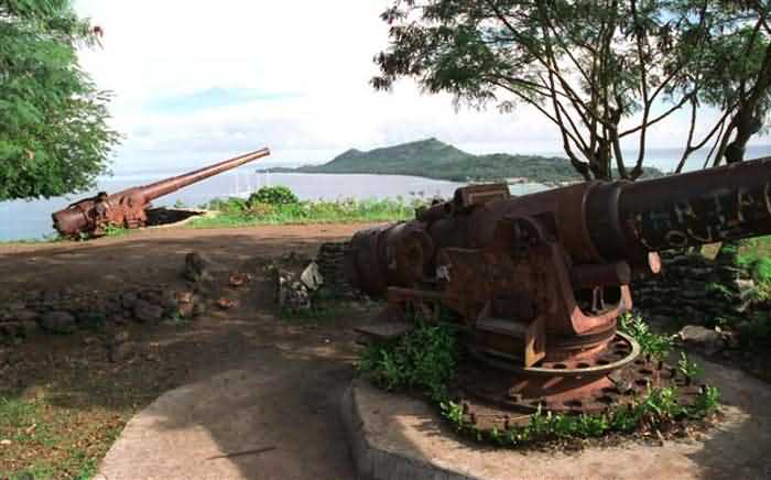 The first is established at water level, facing the pass. It no longer has any military value, as it is subject to direct fire. The second is located on a lagoon islet, with the same disadvantages as the first. The third is situated on the hill overlooking the town, at an altitude of 90 metres. It is an earthen redoubt. The fortifications committee recommends establishing a bastioned work there to accommodate the 16 cm guns and two 22 cm mortars available in Papeete. In 1889, the situation has hardly changed. The Motu Outa battery is downgraded, and they consider establishing a control post for submerged torpedoes there. Fort Faieré has been built, but it still has its obsolete armament. It is a very basic work, two of its aged pieces of which need to be replaced by barely newer 24 cm guns Mle 1864-66. This is done the following year, when they decide that Papeete is definitely not defensible. The two guns hoisted with great difficulty onto Faieré are abandoned. In August 1914, the situation is unchanged, and Papeete is devoid of any defence, except for about sixty marines, recently arrived from Nouméa, and the gunboat Zélée, armed with two 100 mm guns, four 65 mm guns and four 37 mm guns. But this ship is commanded by a determined man, Lieutenant Destremau. The potential enemy is not negligible, as it is the German East Asia and Pacific Division, commanded by Admiral Von Spee. This includes mainly the armoured cruisers Scharnhorst and Gneisenau, each armed with eight 210 mm guns, six 150 mm guns, twenty 88 mm guns and four 37 mm guns. Three lighter cruisers, Emden, Nürnberg and Leipzig, armed with six 105 mm guns, accompany them. Destremau knows he has no chance against this armada if it ever comes by Tahiti. But he judges, in opposition to part of the population, that Papeete is defensible and must be defended. On 7 August, taking up the post of weapons commander, he begins the defence works and has the guns from his ship, except for the 100 mm chase gun, landed and installed on Faieré. Then he has the destruction of the beacons that allow ships to align in the pass prepared, and prepares charges in the stockpile of 5,000 tonnes of coal, which he thinks will certainly attract Von Spee's covetousness. On the 11th, he sets sail for Makatea in the Tuamotus, where he has been informed of the presence of a 10,000-tonne German freighter, the Walküre. He boards it and brings it back to Papeete. On 22 September, after a stopover at Bora Bora, which lacks communication means, Von Spee appears before Papeete, which he believes to be undefended and where he hopes to get his hands on the coal and procure supplies. At 2,000 metres from the pass, his two armoured cruisers are greeted by three warning salvos from the 65 mm guns, commanded by Destremau's second-in-command, Ensign Charron. The ships then fly the small flag, which removes all doubt about their nationality from Destremau, who blows up the alignment beacons, sets fire to the coal stockpile and sinks the Walküre in the channel. The Germans, who have not spotted the guns, then waste their 210 mm and 150 mm shells trying to destroy the battery, which carefully refrains from returning fire. In doing so, they destroy part of Papeete. Finally, Von Spee, not daring to enter the pass, which he may think is mined, and furthermore without landmarks, gives up and moves away. His only victory is the destruction of the Zélée, which Destremau intended to sink in the pass, but which is destroyed before it can set sail. Von Spee's squadron will make headlines again when it destroys Admiral Cradock's ships on 1 November at Coronel, Chile. It will itself be annihilated in the Falklands on 8 December by Admiral Sturdee's armoured cruisers. As for Destremau, he will die in March 1915 upon his return to mainland France, unjustly attacked for his initiative by the Governor of Tahiti. The barrel of the 100 mm gun Mle 1895 from the Zélée is nowadays exhibited at Square Bougainville in Papeete. The 65 mm guns, which were enough to repel Von Spee's ships, are preserved in Fort Taravao, a small surveillance work that currently serves as barracks for the Régiment d’Infanterie de Marine du Pacifique Polynésie. Let us also recall that on Bora Bora one can still admire the 7-inch guns that the Americans installed for coastal defence during the Second World War.