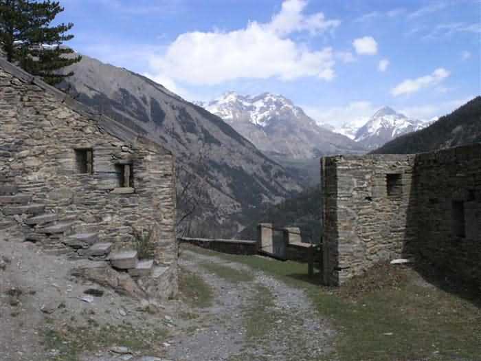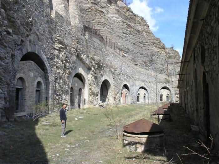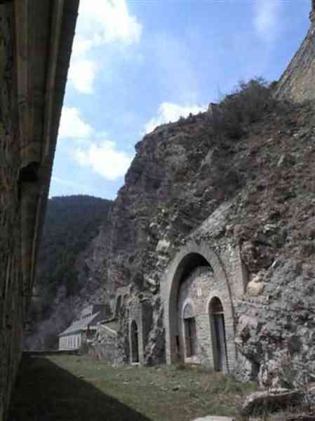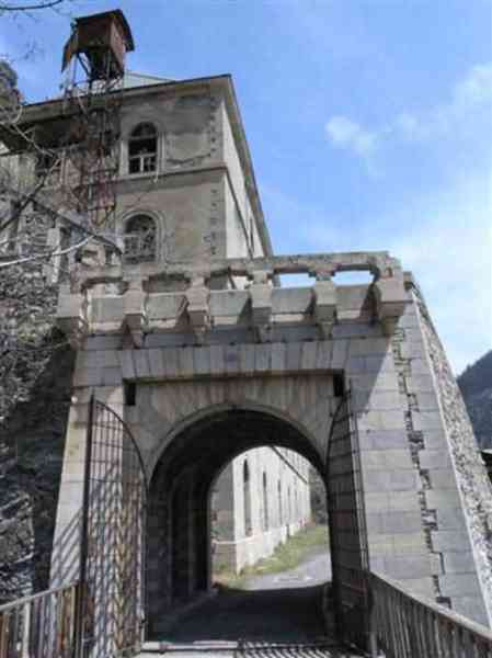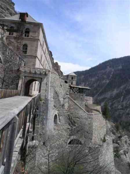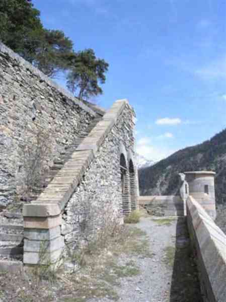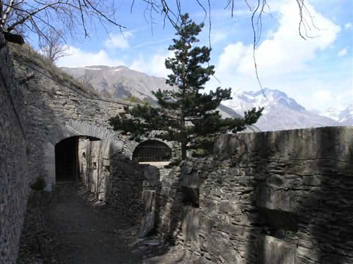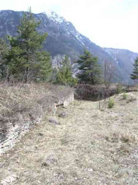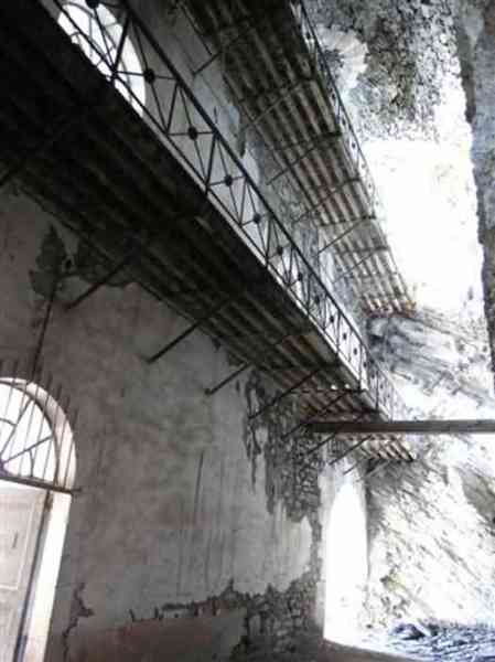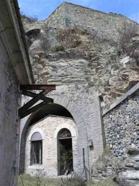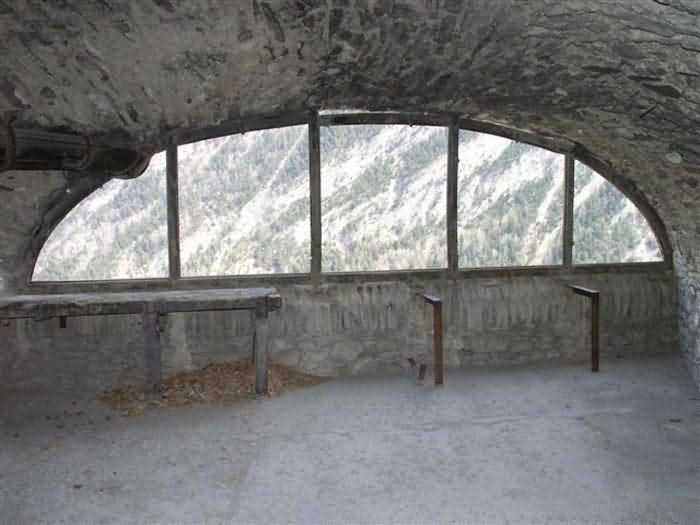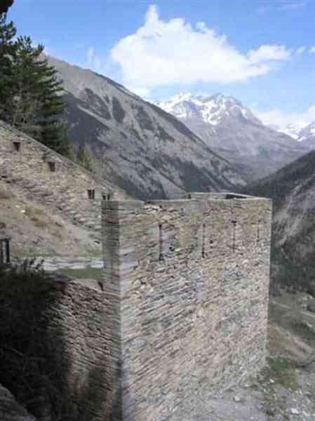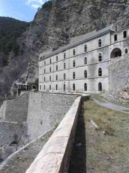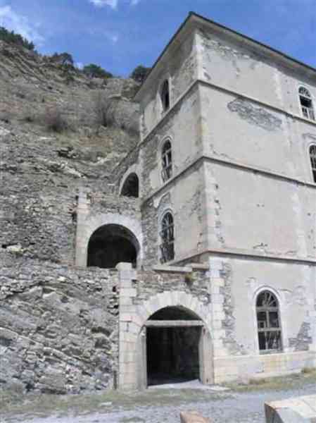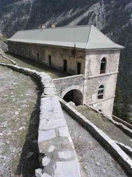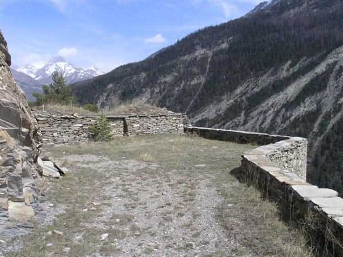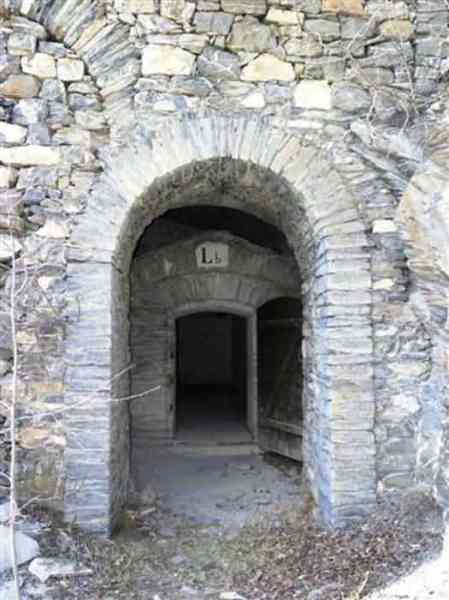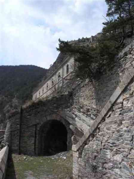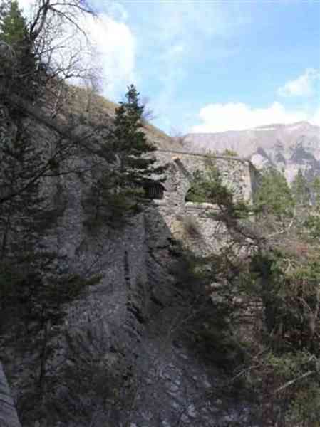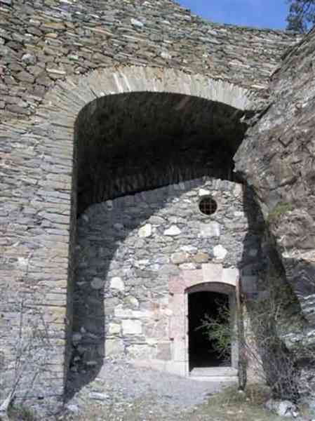 Fortress of Tournoux, component of the fort or fortress of Tournoux, located at 1514 m/alt (west entrance), between the battery B XII and the upper fort (see fort of Tournoux), 1845-1863. Seen from afar, the middle fort is distinguished by its two barracks built in elevation, on four levels a few meters from the rock face cut for the occasion. Two sets of masonry, alternating round arch and piers, very high, stand out at the rear of the west barracks. These sets actually support a platform intended to be the receptacle for rock falls. These barracks are sheltered behind the rocky ridge on which the fortress stretches. From the Pellegrin barracks, a road goes up to the middle fort. Shortly before the entrance, on the left of the path, stables were dug out. The west entrance of the fort is preceded by a long wooden bridge crossing a ditch gained on the mountain. The entrance porch is surmounted by a cartouche indicating 1852 (itself formerly surmounted by a murder hole) and the wheels of a drawbridge of the Derché type remain. Once the entrance porch is crossed, one finds oneself on a fairly vast esplanade running along the two barracks and where a cableway ends. On postcards from the beginning of the 20th century, this cableway does not appear. At the other end of this esplanade, a gate with a similar drawbridge (but with counterweight of a different shape) gives onto the rising path, enemy side, to the upper fort. To the right of this second gate, remains a forge, as rare as it is pretty with a breathtaking view of the upstream Ubaye. We are here on the head front of the middle fort. The scarp, preceded by a ditch dug in the rock, consists of a wall of little thickness (50 to 60 cm on average) pierced with loopholes. Everything here is sloping. Both upwards and downwards, one finds artillery platforms with naturally thicker parapets and cave powder magazines. The central part of this scarp, halfway between the two forts, is provided with seven square towers housing spiral stairs making up for the significant difference in level. It is on this side that the artillery of the middle fort was placed, sometimes on platforms, sometimes in casemates reminiscent of Haxo-type ones (but not open at the rear). The plans in our possession are incomplete and, on site (05/2008), the multiplicity of levels made us lose track of the counting of firing positions, all the more so as certain casemates (mainly the four above the entrance) seemed to us to have too narrow accesses to receive artillery. However, if it is undeniable that there was artillery in this fort, the essential part of the garrison must have been composed of infantrymen so long, tortuous and studded with loopholes is the scarp to be manned. Besides, shortly before the First World War, the middle fort was only armed with four 95 c guns and two 120 c guns of de Bange. The two barracks are roughly similar; the western one being a bit longer. Both share the fact of having four levels plus attics. Their width relative to their length is insignificant. Both are raised about four meters from the rock face and are connected to the latter at the level of the ceiling of the second floor. The fourth level (third floor) is only accessible at ground level from the extrados of this vaulted connection. Between building and rock, footbridges resting on consoles allow circulation from one room to another on the first and second floors. This configuration is astonishing, unexpected and, with a bit of luck, the sun will allow you to take superb photos there. A staircase in the center of each building allows changing level. On the ground floor of the west barracks, one finds, in a remarkable state of preservation, one of the most famous wall frescoes, representing the blue thistle of the 154th Foot Artillery Regiment. The gallery dug in the rock and coming from battery B XII, emerges at the ground floor of the other barracks. From the second floor of each of the barracks, an access, always dug in the rock, allows reaching the esplanades on which the rooms of the third floors open. These esplanades also give access to "dug in the rock" alveoli (the expression is redundant, certainly, but necessary) which are as many powder magazines. If behind the eastern barracks one counts only two, behind the western one, with seven alveoli garnishing a concave arc and to take up the expression of our guide, it is a veritable shopping gallery. Equidistant, all are raised in rubble masonry in a cavity left rough, except on the facade where the opening is underlined by a beautiful round arch. These are what we commonly call nested powder magazines. The leftmost alveolus houses two bread ovens which are of a model that we do not remember having spotted elsewhere and, a priori, of low capacity. A gallery allows access to the rear of the ovens and, at its height, a hoist made it possible to shortcut the maze to join the entrance esplanade and that of the powder magazines. The fort was abandoned in 1948, after having served, during the fighting of 1940, as a command post for the artillery of the Ubaye/Ubayette subsector, as well as for the 293rd R.A.L. Today (05/2008), the two barracks have received a new roof and the degradations of the walls seemed to us here relatively minor, although worsening as one approaches the upper fort.