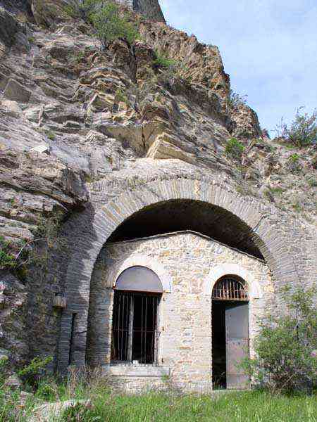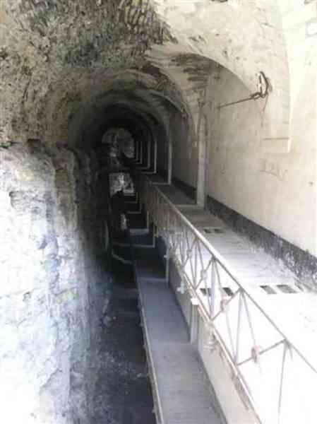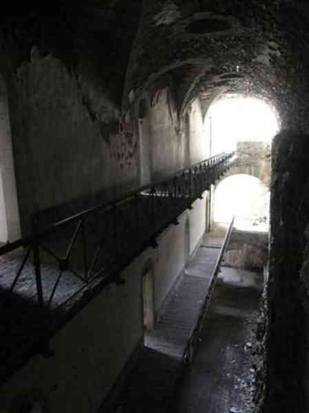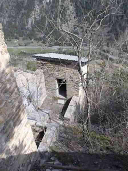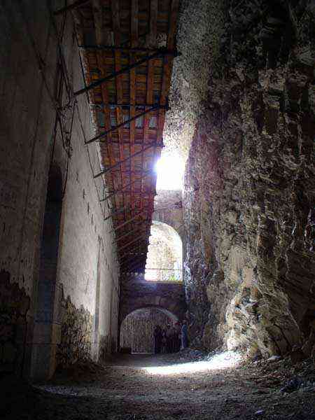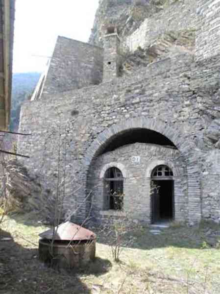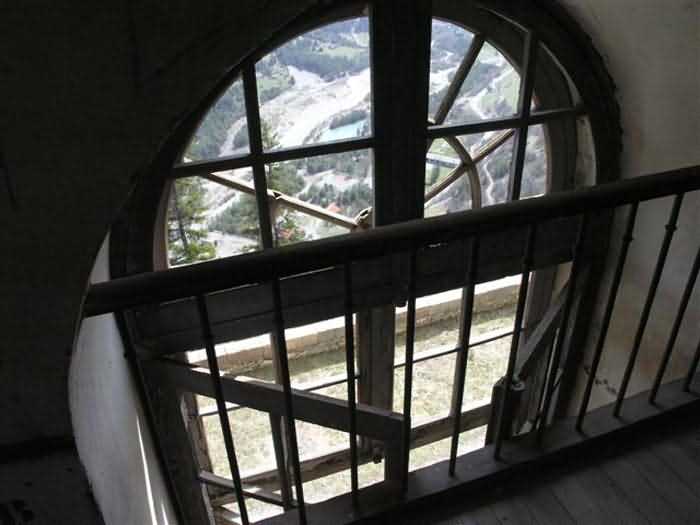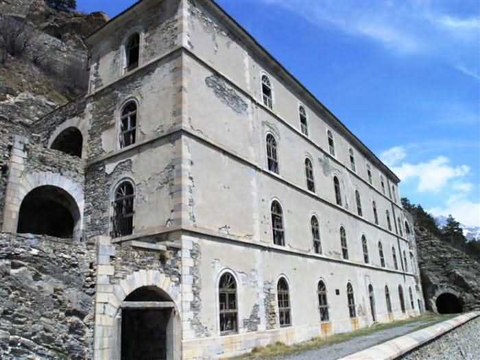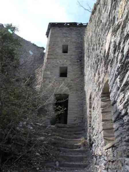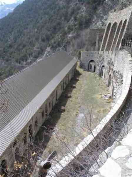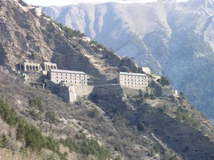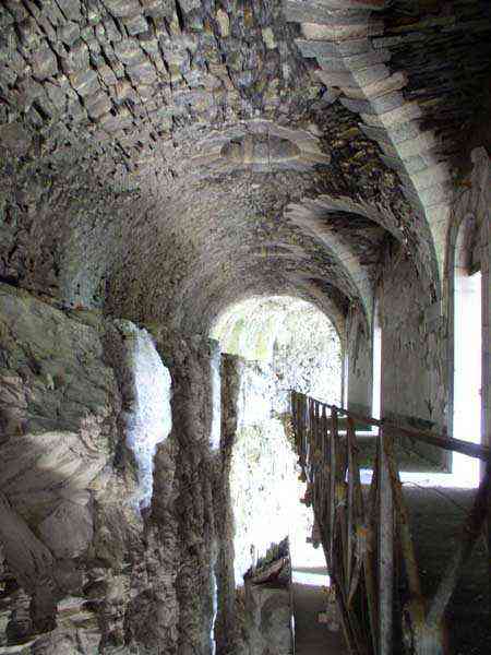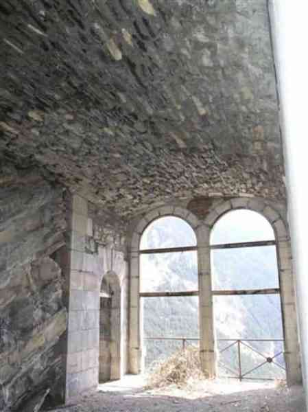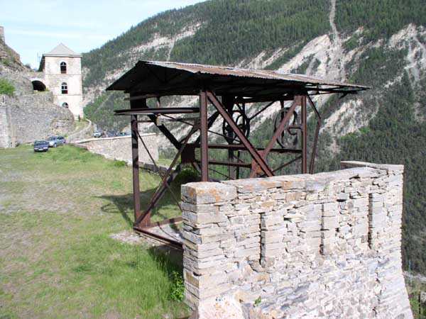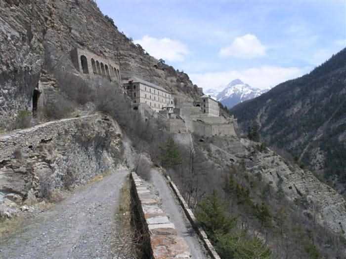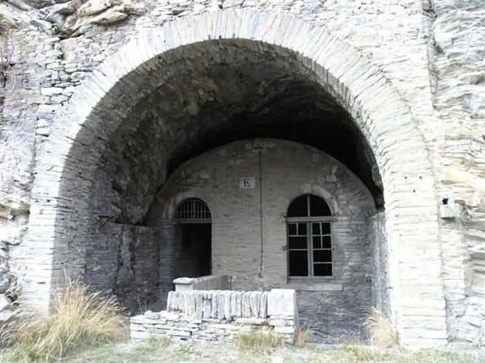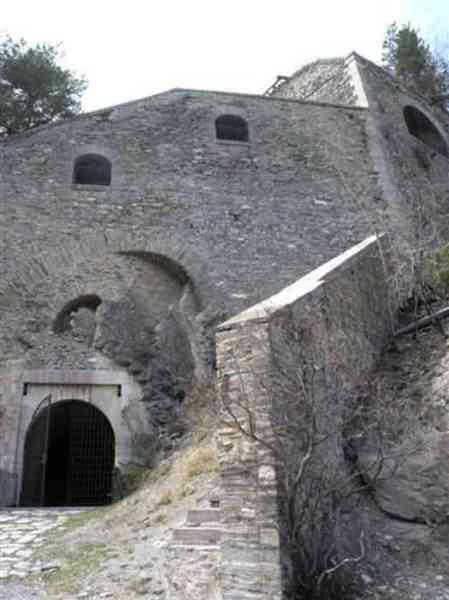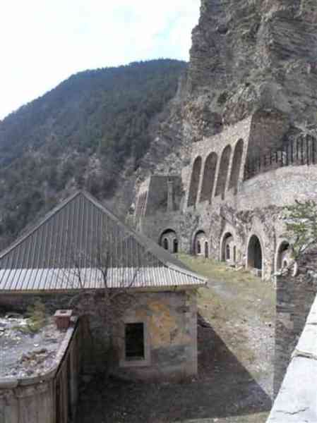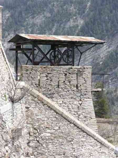 Fortress of Tournoux, component of the fort or fortress of Tournoux, located at 1514 m/alt (west entrance), between the battery B XII and the upper fort (see fort of Tournoux), 1845-1863. Seen from afar, the middle fort is distinguished by its two barracks built in elevation, on four levels a few meters from the rock face cut for the occasion. Two sets of masonry, alternating round arch and piers, very high, stand out at the rear of the west barracks. These sets actually support a platform intended to be the receptacle for rock falls. These barracks are sheltered behind the rocky ridge on which the fortress stretches. From the Pellegrin barracks, a road goes up to the middle fort. Shortly before the entrance, on the left of the path, stables were dug out. The west entrance of the fort is preceded by a long wooden bridge crossing a ditch gained on the mountain. The entrance porch is surmounted by a cartouche indicating 1852 (itself formerly surmounted by a murder hole) and the wheels of a drawbridge of the Derché type remain. Once the entrance porch is crossed, one finds oneself on a fairly vast esplanade running along the two barracks and where a cableway ends. On postcards from the beginning of the 20th century, this cableway does not appear. At the other end of this esplanade, a gate with a similar drawbridge (but with counterweight of a different shape) gives onto the rising path, enemy side, to the upper fort. To the right of this second gate, remains a forge, as rare as it is pretty with a breathtaking view of the upstream Ubaye. We are here on the head front of the middle fort. The scarp, preceded by a ditch dug in the rock, consists of a wall of little thickness (50 to 60 cm on average) pierced with loopholes. Everything here is sloping. Both upwards and downwards, one finds artillery platforms with naturally thicker parapets and cave powder magazines. The central part of this scarp, halfway between the two forts, is provided with seven square towers housing spiral stairs making up for the significant difference in level. It is on this side that the artillery of the middle fort was placed, sometimes on platforms, sometimes in casemates reminiscent of Haxo-type ones (but not open at the rear). The plans in our possession are incomplete and, on site (05/2008), the multiplicity of levels made us lose track of the counting of firing positions, all the more so as certain casemates (mainly the four above the entrance) seemed to us to have too narrow accesses to receive artillery. However, if it is undeniable that there was artillery in this fort, the essential part of the garrison must have been composed of infantrymen so long, tortuous and studded with loopholes is the scarp to be manned. Besides, shortly before the First World War, the middle fort was only armed with four 95 c guns and two 120 c guns of de Bange. The two barracks are roughly similar; the western one being a bit longer. Both share the fact of having four levels plus attics. Their width relative to their length is insignificant. Both are raised about four meters from the rock face and are connected to the latter at the level of the ceiling of the second floor. The fourth level (third floor) is only accessible at ground level from the extrados of this vaulted connection. Between building and rock, footbridges resting on consoles allow circulation from one room to another on the first and second floors. This configuration is astonishing, unexpected and, with a bit of luck, the sun will allow you to take superb photos there. A staircase in the center of each building allows changing level. On the ground floor of the west barracks, one finds, in a remarkable state of preservation, one of the most famous wall frescoes, representing the blue thistle of the 154th Foot Artillery Regiment. The gallery dug in the rock and coming from battery B XII, emerges at the ground floor of the other barracks. From the second floor of each of the barracks, an access, always dug in the rock, allows reaching the esplanades on which the rooms of the third floors open. These esplanades also give access to "dug in the rock" alveoli (the expression is redundant, certainly, but necessary) which are as many powder magazines. If behind the eastern barracks one counts only two, behind the western one, with seven alveoli garnishing a concave arc and to take up the expression of our guide, it is a veritable shopping gallery. Equidistant, all are raised in rubble masonry in a cavity left rough, except on the facade where the opening is underlined by a beautiful round arch. These are what we commonly call nested powder magazines. The leftmost alveolus houses two bread ovens which are of a model that we do not remember having spotted elsewhere and, a priori, of low capacity. A gallery allows access to the rear of the ovens and, at its height, a hoist made it possible to shortcut the maze to join the entrance esplanade and that of the powder magazines. The fort was abandoned in 1948, after having served, during the fighting of 1940, as a command post for the artillery of the Ubaye/Ubayette subsector, as well as for the 293rd R.A.L. Today (05/2008), the two barracks have received a new roof and the degradations of the walls seemed to us here relatively minor, although worsening as one approaches the upper fort.