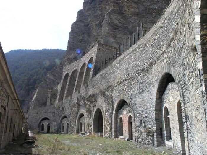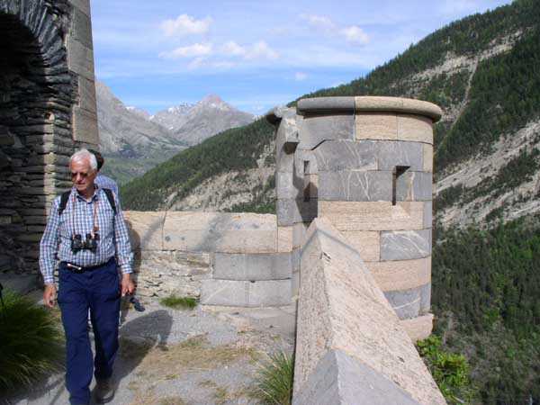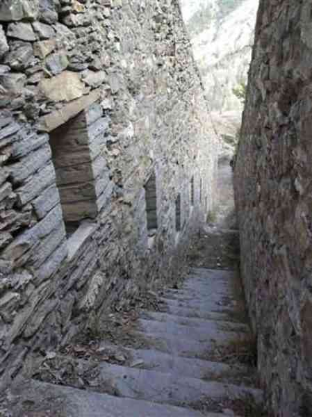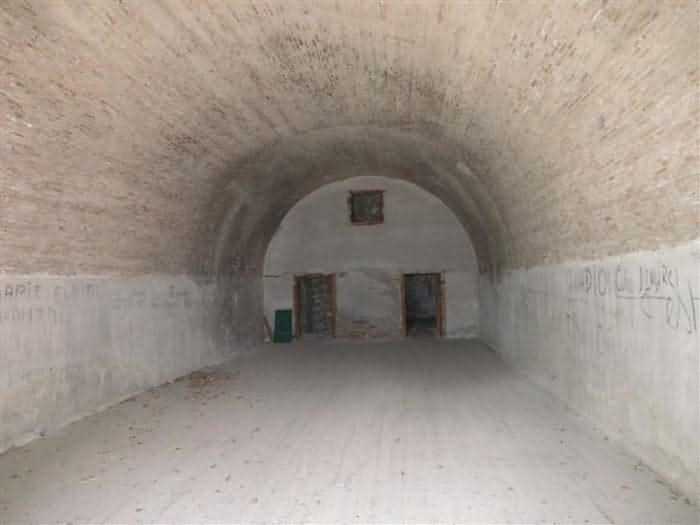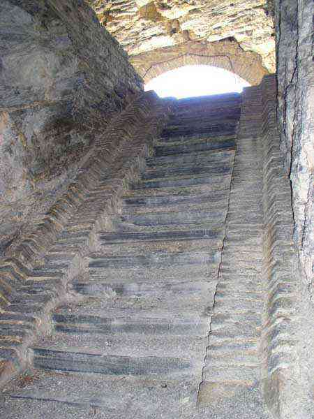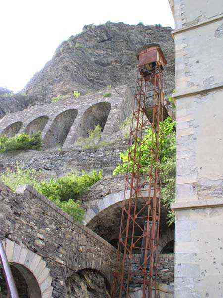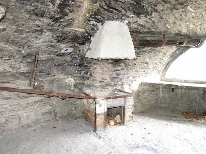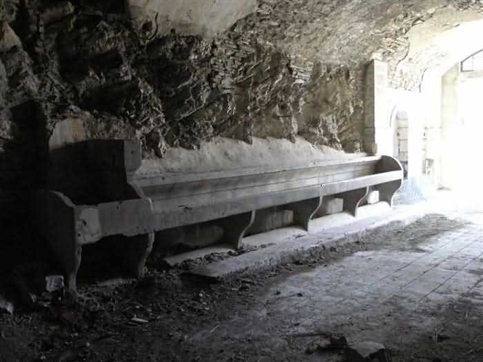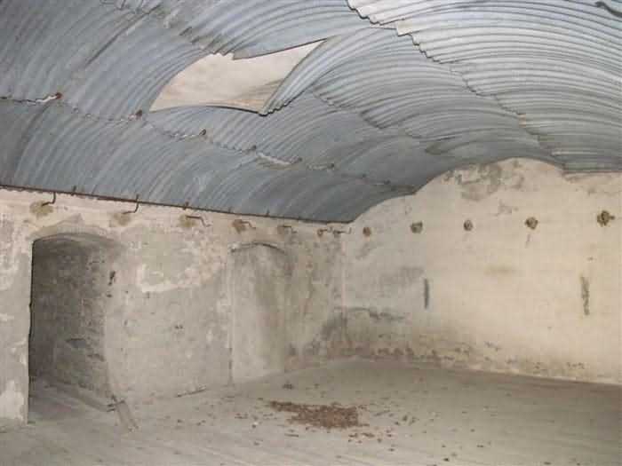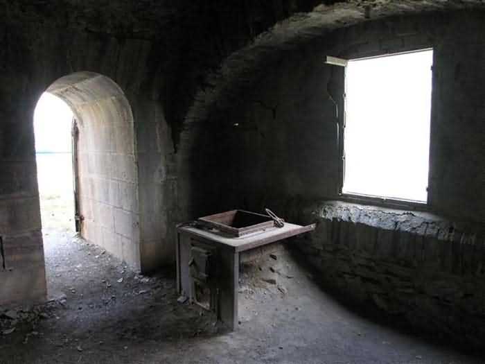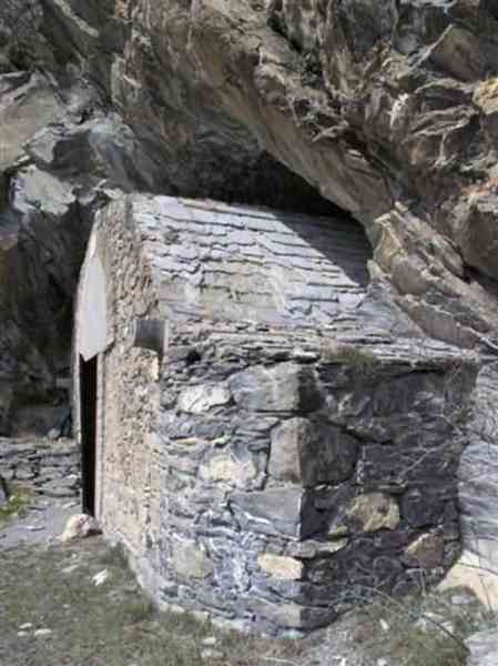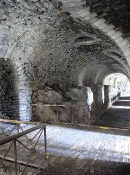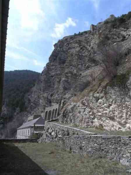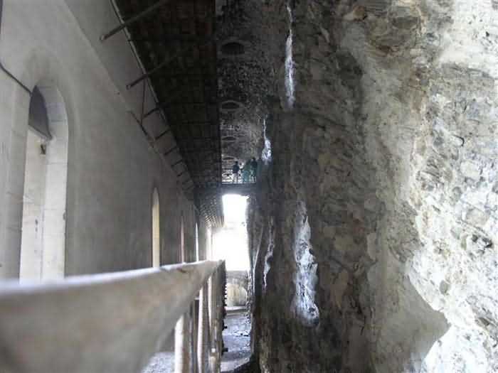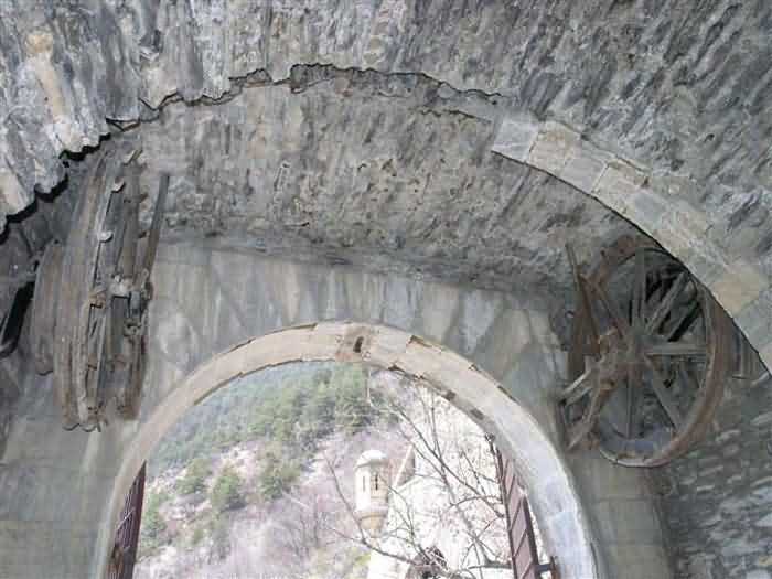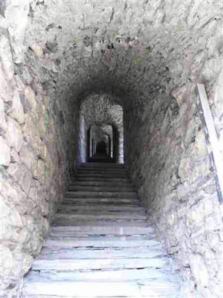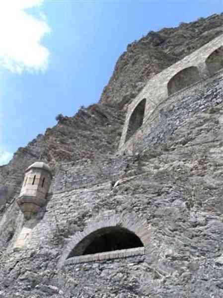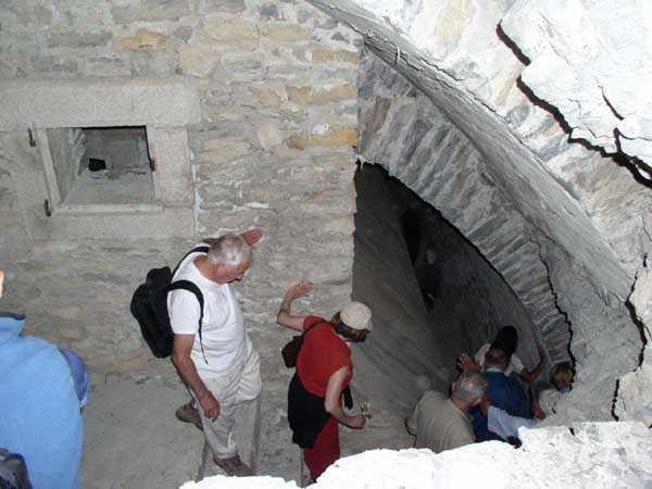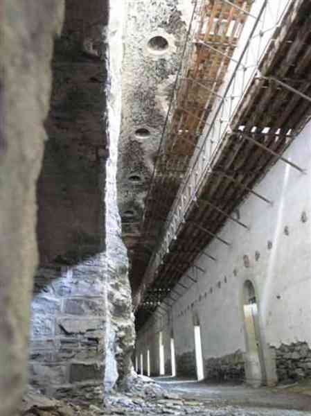 Fortress of Tournoux, component of the fort or fortress of Tournoux, located at 1514 m/alt (west entrance), between the battery B XII and the upper fort (see fort of Tournoux), 1845-1863. Seen from afar, the middle fort is distinguished by its two barracks built in elevation, on four levels a few meters from the rock face cut for the occasion. Two sets of masonry, alternating round arch and piers, very high, stand out at the rear of the west barracks. These sets actually support a platform intended to be the receptacle for rock falls. These barracks are sheltered behind the rocky ridge on which the fortress stretches. From the Pellegrin barracks, a road goes up to the middle fort. Shortly before the entrance, on the left of the path, stables were dug out. The west entrance of the fort is preceded by a long wooden bridge crossing a ditch gained on the mountain. The entrance porch is surmounted by a cartouche indicating 1852 (itself formerly surmounted by a murder hole) and the wheels of a drawbridge of the Derché type remain. Once the entrance porch is crossed, one finds oneself on a fairly vast esplanade running along the two barracks and where a cableway ends. On postcards from the beginning of the 20th century, this cableway does not appear. At the other end of this esplanade, a gate with a similar drawbridge (but with counterweight of a different shape) gives onto the rising path, enemy side, to the upper fort. To the right of this second gate, remains a forge, as rare as it is pretty with a breathtaking view of the upstream Ubaye. We are here on the head front of the middle fort. The scarp, preceded by a ditch dug in the rock, consists of a wall of little thickness (50 to 60 cm on average) pierced with loopholes. Everything here is sloping. Both upwards and downwards, one finds artillery platforms with naturally thicker parapets and cave powder magazines. The central part of this scarp, halfway between the two forts, is provided with seven square towers housing spiral stairs making up for the significant difference in level. It is on this side that the artillery of the middle fort was placed, sometimes on platforms, sometimes in casemates reminiscent of Haxo-type ones (but not open at the rear). The plans in our possession are incomplete and, on site (05/2008), the multiplicity of levels made us lose track of the counting of firing positions, all the more so as certain casemates (mainly the four above the entrance) seemed to us to have too narrow accesses to receive artillery. However, if it is undeniable that there was artillery in this fort, the essential part of the garrison must have been composed of infantrymen so long, tortuous and studded with loopholes is the scarp to be manned. Besides, shortly before the First World War, the middle fort was only armed with four 95 c guns and two 120 c guns of de Bange. The two barracks are roughly similar; the western one being a bit longer. Both share the fact of having four levels plus attics. Their width relative to their length is insignificant. Both are raised about four meters from the rock face and are connected to the latter at the level of the ceiling of the second floor. The fourth level (third floor) is only accessible at ground level from the extrados of this vaulted connection. Between building and rock, footbridges resting on consoles allow circulation from one room to another on the first and second floors. This configuration is astonishing, unexpected and, with a bit of luck, the sun will allow you to take superb photos there. A staircase in the center of each building allows changing level. On the ground floor of the west barracks, one finds, in a remarkable state of preservation, one of the most famous wall frescoes, representing the blue thistle of the 154th Foot Artillery Regiment. The gallery dug in the rock and coming from battery B XII, emerges at the ground floor of the other barracks. From the second floor of each of the barracks, an access, always dug in the rock, allows reaching the esplanades on which the rooms of the third floors open. These esplanades also give access to "dug in the rock" alveoli (the expression is redundant, certainly, but necessary) which are as many powder magazines. If behind the eastern barracks one counts only two, behind the western one, with seven alveoli garnishing a concave arc and to take up the expression of our guide, it is a veritable shopping gallery. Equidistant, all are raised in rubble masonry in a cavity left rough, except on the facade where the opening is underlined by a beautiful round arch. These are what we commonly call nested powder magazines. The leftmost alveolus houses two bread ovens which are of a model that we do not remember having spotted elsewhere and, a priori, of low capacity. A gallery allows access to the rear of the ovens and, at its height, a hoist made it possible to shortcut the maze to join the entrance esplanade and that of the powder magazines. The fort was abandoned in 1948, after having served, during the fighting of 1940, as a command post for the artillery of the Ubaye/Ubayette subsector, as well as for the 293rd R.A.L. Today (05/2008), the two barracks have received a new roof and the degradations of the walls seemed to us here relatively minor, although worsening as one approaches the upper fort.