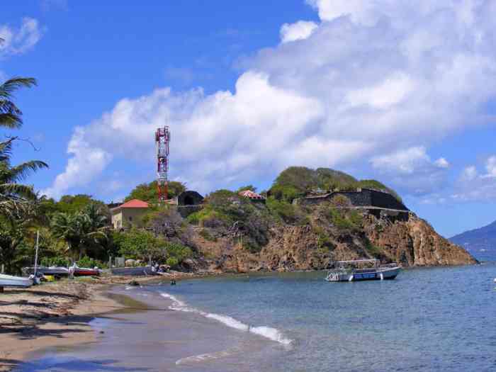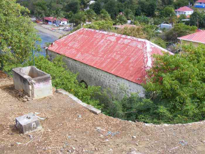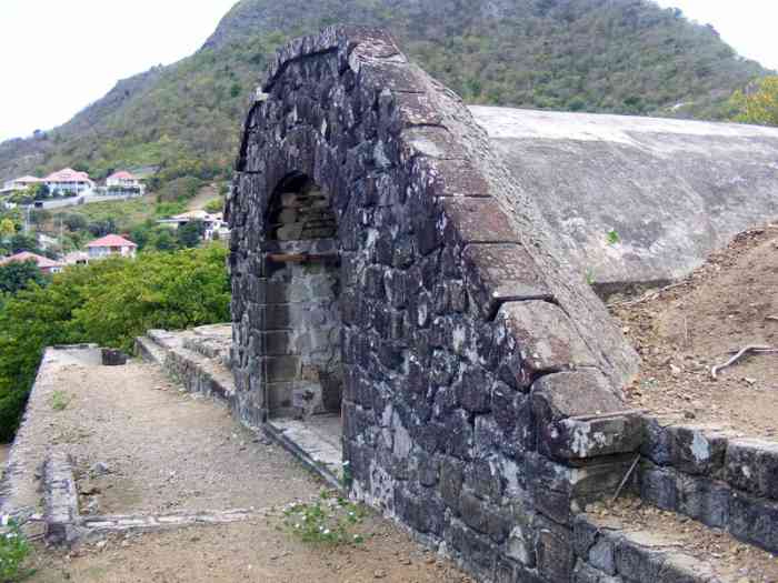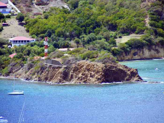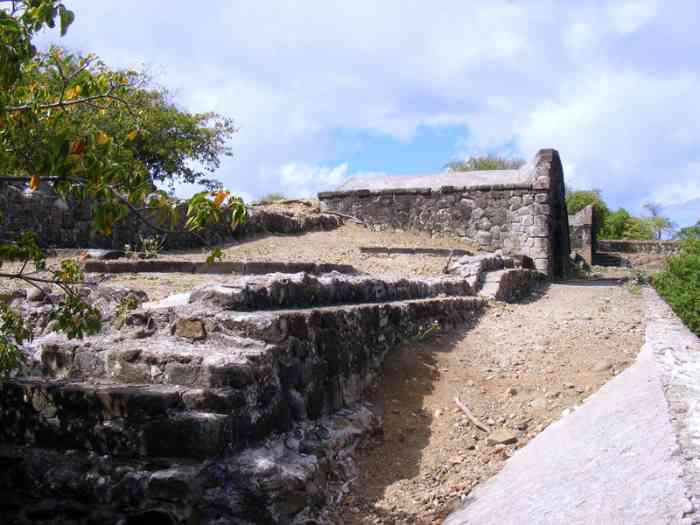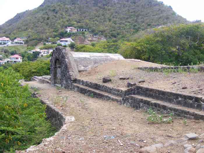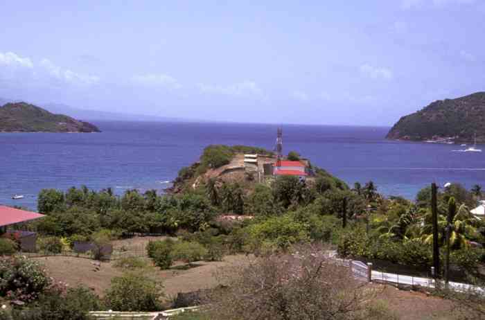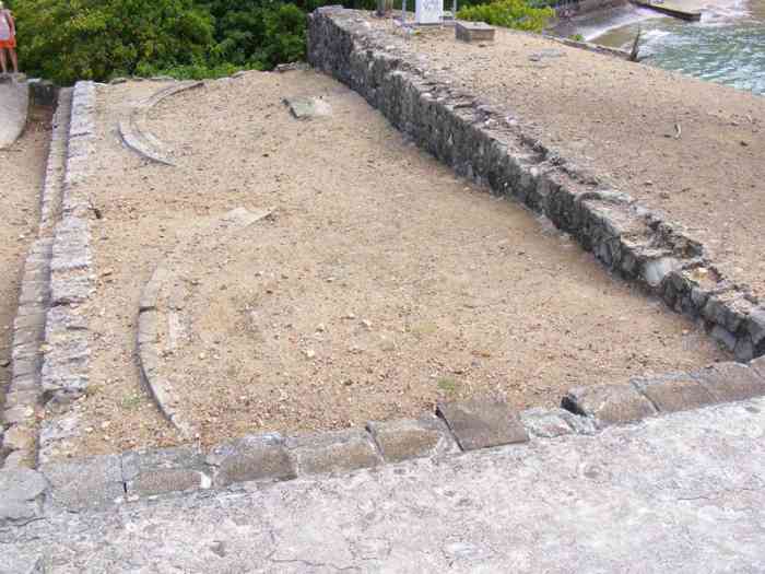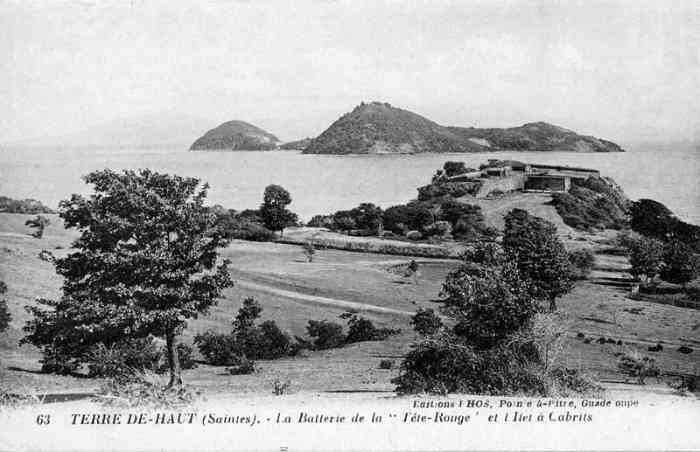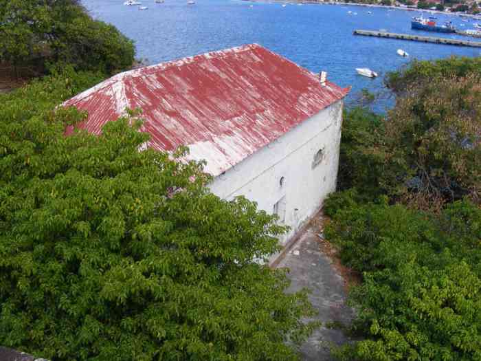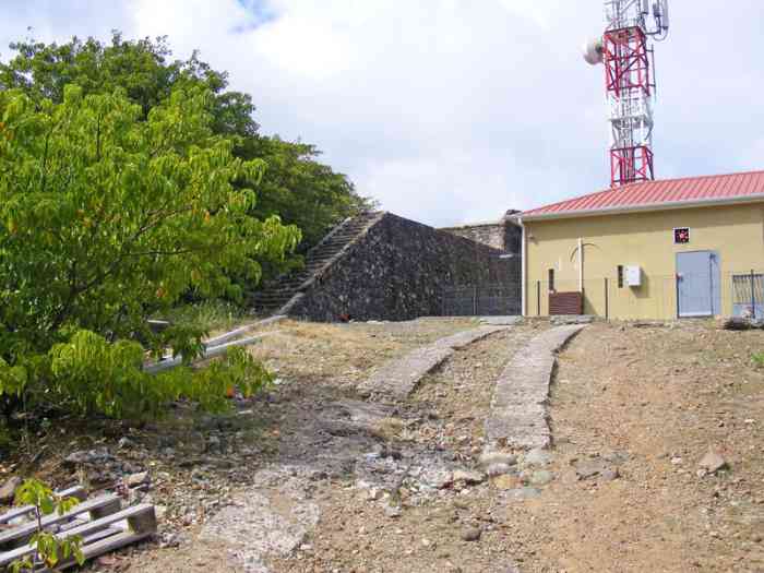 Les Saintes. Ouvrage contemporain du fort Napoléon, terminé en 1870, et dont on peut considérer qu'il constitue sa batterie basse. C'est un ouvrage maçonné, comportant deux plateformes de tir. Celle de gauche, axée vers la passe ouest, entre Terre-de-Haut et l'îlet à Cabrits, peut recevoir quatre canons, séparés par un abri-traverse. Un autre abri-traverse sépare la première plateforme de la seconde, placée à 90°, et axée vers la passe nord. Elle peut recevoir deux pièces. L'armement était certainement à base de canons de 30, sur affût dit des Colonies. L'ouvrage sert actuellement de central téléphonique. Werk aus der Zeit des Fort Napoléon, fertiggestellt 1870, das als seine untere Batterie betrachtet werden kann. Es ist ein gemauertes Werk mit zwei Feuerplattformen. Die linke, ausgerichtet auf die Westpassage zwischen Terre-de-Haut und der Îlet à Cabrits, kann vier Kanonen aufnehmen, getrennt durch einen Traversenunterstand. Ein weiterer Traversenunterstand trennt die erste Plattform von der zweiten, die im 90°-Winkel steht und auf die Nordpassage ausgerichtet ist. Sie kann zwei Geschütze aufnehmen. Die Bewaffnung bestand sicherlich aus 30-Pfünder-Kanonen auf sogenannter Kolonien-Lafette. Das Werk dient derzeit als Telefonzentrale. Werk uit de tijd van fort Napoléon, voltooid in 1870, dat kan worden beschouwd als de lagere batterij ervan. Het is een gemetseld werk met twee vuurplatformen. Het linker, gericht op de westelijke vaargeul tussen Terre-de-Haut en de Îlet à Cabrits, kan vier kanonnen herbergen, gescheiden door een traversenonderkomen. Een ander traversenonderkomen scheidt het eerste platform van het tweede, geplaatst onder een hoek van 90°, en gericht op de noordelijke vaargeul. Het kan twee stukken herbergen. De bewapening bestond zeker uit 30-pondskanonnen op zogenaamde Koloniën-affuit. Het werk dient momenteel als telefooncentrale. Work contemporary with Fort Napoléon, completed in 1870, which can be considered as its lower battery. It is a masonry work with two firing platforms. The left one, oriented towards the western passage between Terre-de-Haut and Îlet à Cabrits, can accommodate four guns, separated by a traverse shelter. Another traverse shelter separates the first platform from the second, placed at 90°, and oriented towards the northern passage. It can accommodate two pieces. The armament was certainly based on 30-pounder guns on so-called Colonies mounting. The work currently serves as a telephone exchange. Dílo současné s pevností Napoléon, dokončené v roce 1870, které lze považovat za její spodní baterii. Je to zděné dílo se dvěma palebnými platformami. Levá, orientovaná na západní průplav mezi Terre-de-Haut a Îlet à Cabrits, může pojmout čtyři děla, oddělená traverzovým krytem. Další traverzový kryt odděluje první platformu od druhé, umístěné pod úhlem 90°, orientované na severní průplav. Může pojmout dva kusy. Výzbroj byla jistě založena na 30liberních dělech na takzvané koloniální lafetě. Dílo v současnosti slouží jako telefonní ústředna. © JJM 31/03/2026