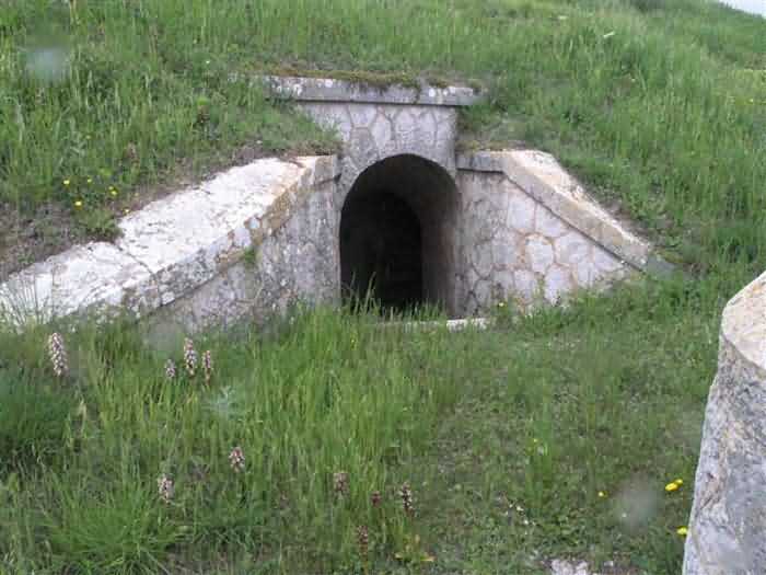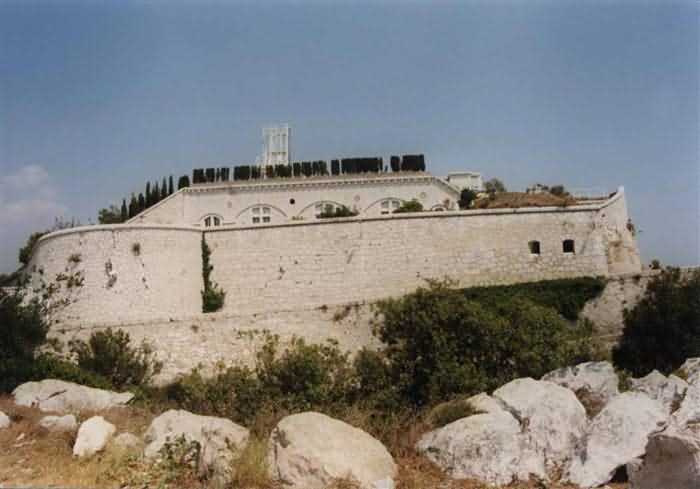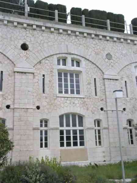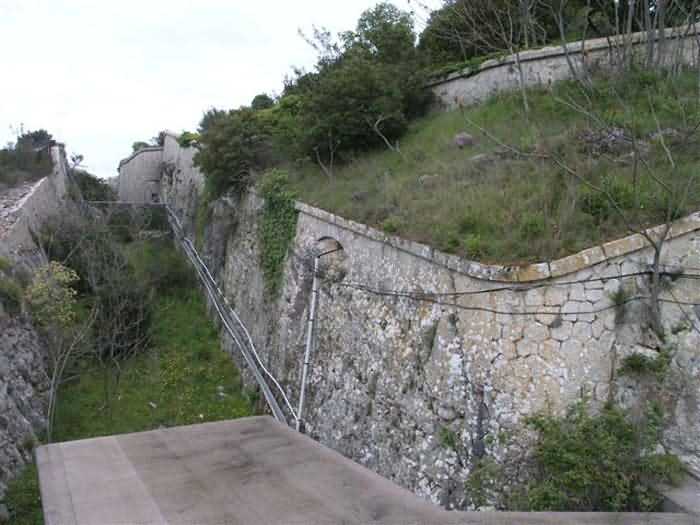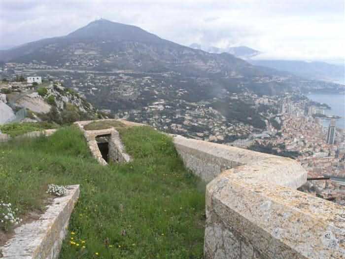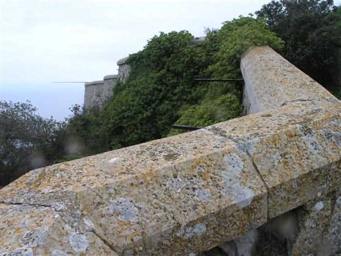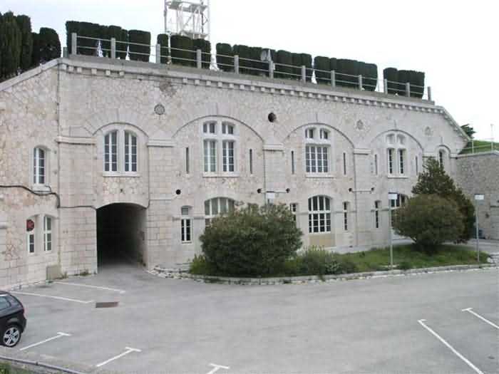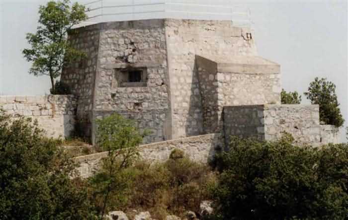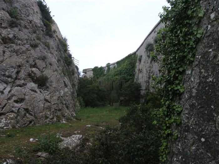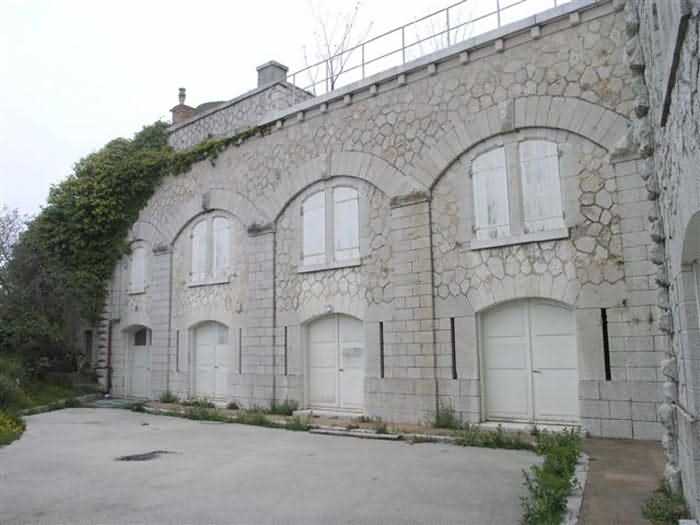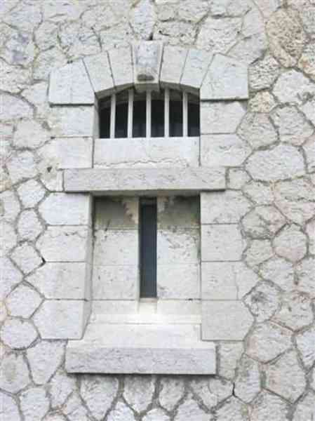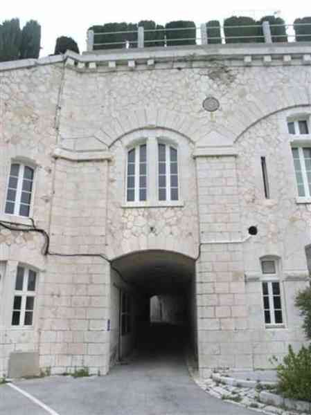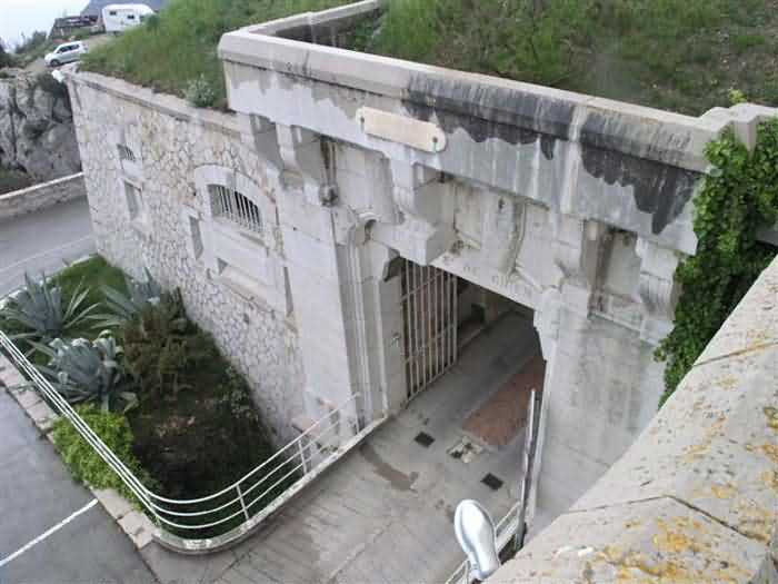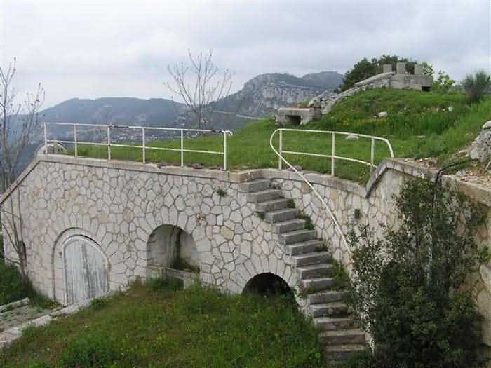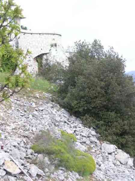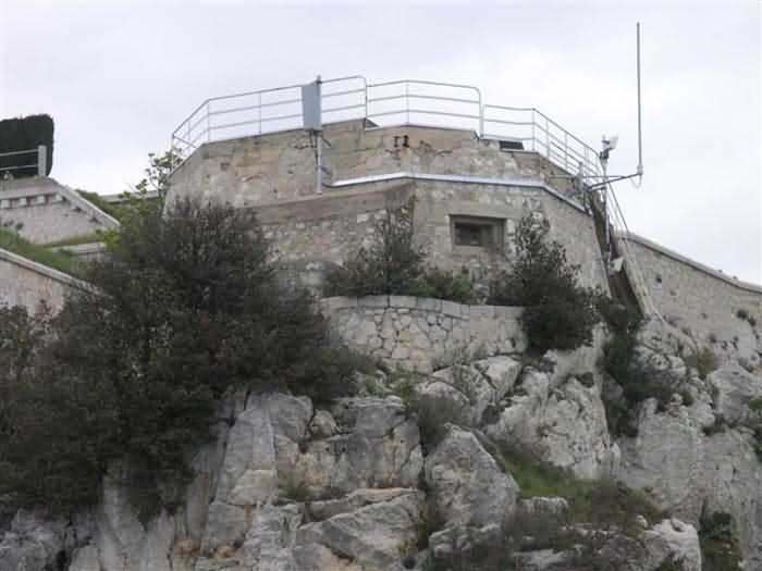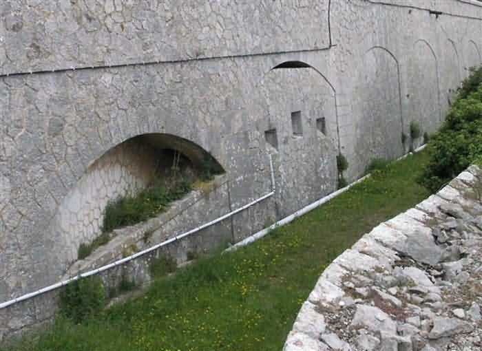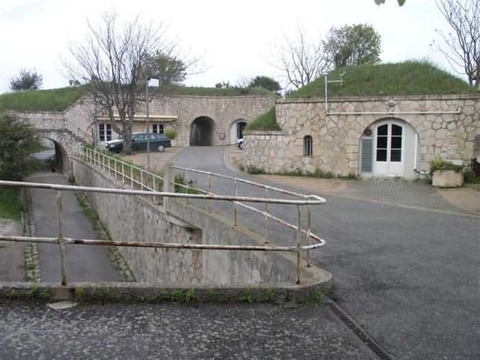 Fortress of Nice, east-northeast of the city, 1879-1884. 574 m/alt. 206 men and 22 guns. Named fort Masséna. Overall trapezoidal, with its largest front in the east following the rocky ridge, this fort has a dry ditch only on its north and west fronts, to which must be added an embryo in the northeast, to make the connection with the precipice of the eastern front. The gorge and front I-II have no ditch except in front of the entrance where a narrow pit, like an English courtyard, was arranged to be surmounted by the movable deck of the bascule drawbridge with assisted movement. This type of bridge is found only in the places of Nice and Albertville. No ditch, we write? Everything is relative; a notch in the cliff bypasses the gorge and runs along front I-II. It was used to excavate a rock magazine there (see separate article) and its top was rock-cut and leveled for the passage of the access road to the fort. In front of the entrance, an esplanade was thus arranged and if one did indeed take advantage of it to dig a small shelter in the rock to the right of the entrance (for a gun to be placed behind the parapet of the said esplanade; this room now houses an old gasoline pump), on the other hand, the angular construction whose concreted embrasures threaten the approaches of the fort does not appear on any plan. In fact, it is seated on the outlet of the path coming from the rock magazine and its workmanship leaves little doubt about its posteriority. In fine weather, the entrance of the fort shines in the light; the whiteness of its limestone, the same as that used for the oceanographic museum of Monaco, is dazzling. The entrance porch is one of the most majestic of all contemporary French forts. An imposing parapet crowns it over its entire width. This parapet rests on curved consoles that leave openings, murder holes or embrasures for plunging fire as needed. The embrasures of the two rooms to the left of the porch, guardroom and optical telegraphy room, add value to the whole by the care with which they were designed. The outlet of two optical embrasures is visible on the reverse of salient I; one is aimed at Revère fort, the other at Cauférat and/or Mont Boron. There is no shelf to seat the equipment and we do not find in the ceiling the shaft of the heliostat. The basement of this guardroom is entirely devoted to cisterns. In the entrance porch, the plaque affixed in 1886 following the decree of General Boulanger for the attribution of the name Masséna to the fort still exists but it has become illegible. The mechanism of the drawbridge is practically complete, arch and operating lever are there, as well as all its axles and counterweights. When one emerges into the courtyard, on the reverse right, a stair-ramp allows reaching the parapet dominating the entrance. After a landing, a second staircase of the same type, on the right of the barracks, allows reaching a platform. According to the width, only pieces of 80, 90 or maximum 95 mm could have accessed it. The troop barracks align three bays on two levels, framed by a half bay on the left and an even narrower one on the right. The masonry, in opus incertum, surrounds the openings, doors, windows, oculi and embrasures whose stones of all corner bonds are cut to a point. This gives the whole a character as singular as it is unique. The largest oculi are additionally closed by openwork and nicely worked grilles. The oculus that all enthusiasts wish to see, the one reputed to be surrounded by stones whose shape and relief evoke a Cross of the Legion of Honour, gives onto this same courtyard, but in the return of the façade on the left. Remarkable, this orifice is encircled by a round stone, cut from a single block, on the outside of which five other stones cut into thick chevrons lean. This is a unique work. It surmounts a passage forming a tunnel parallel to front II-III serving no less than nine rooms on its left. The latter concern mainly artillery, including one with a lamp embrasure with a singularly short flare, but also cisterns. An old plaque even indicates the presence of a "wartime pump"! In one of these magazines, the occupant of the Second World War left a wall inscription testifying to having stored fuel and oil there. Twice, the rooms are separated by a passage debouching behind the parapet of the semi-detached escarp and another staircase, descending this time, leads to... an escarp cofferdam. It is necessary to resort to an old plan to understand somewhat the justification for the presence here of such a defensive organ. The west ditch (II-III, oriented south-north) includes a slight break that orients its northern part to NNW. The angle of this break is occupied by a gun emplacement taking charge of the protection of the ditch towards salient II. On the other hand, the small front behind this gun emplacement remained undefended. It was therefore necessary to arrange a defensive cofferdam in front of the gun emplacement, but with the imperative of not projecting from the escarp. We thus have a cofferdam totally integrated into the escarp with an obliquely pierced embrasure. We know of no other example. This embrasure was preceded by a pit –today disappeared– preventing its approach. For the visitor another enigma, even more intriguing, presents itself. The cofferdam comprises a second embrasure, probably for a revolver cannon, firing straight into the counterscarp wall. We omitted to ask to go see this wall more closely from the ditch, alas; that being said, the pit protecting the embrasure aimed at salient III did not extend in front of the perpendicular embrasures. A plan indicates to us the presence of a cistern under the ditch to the right of this cofferdam, when facing it. Manifestly, the counterscarp was pierced opposite the cofferdam with a relatively wide opening requiring appropriate defense. Why put a cistern there? Why want to access it by a passage made in the counterscarp when it sufficed to use 