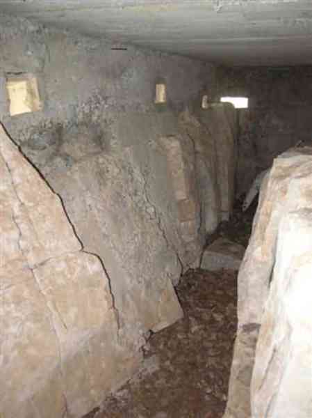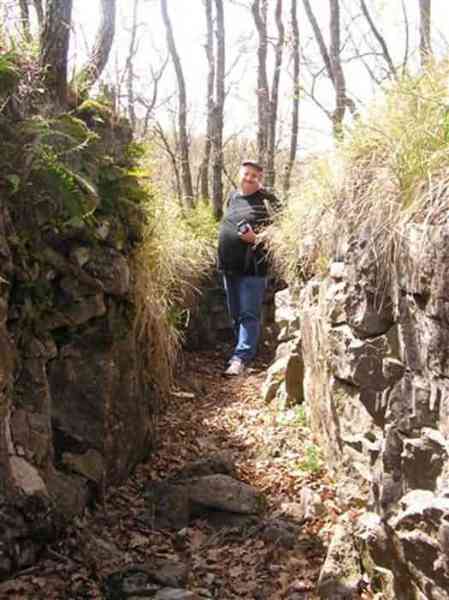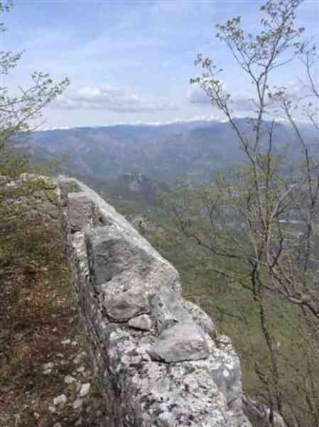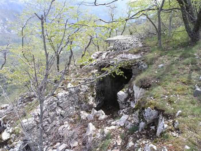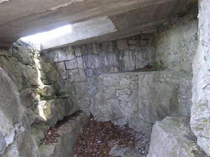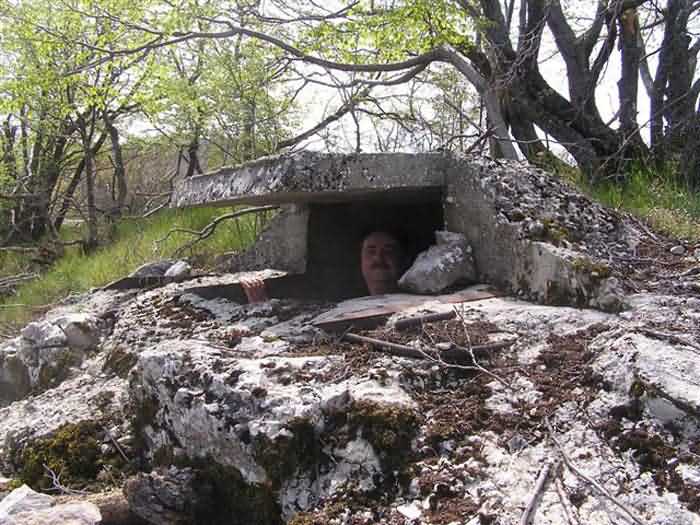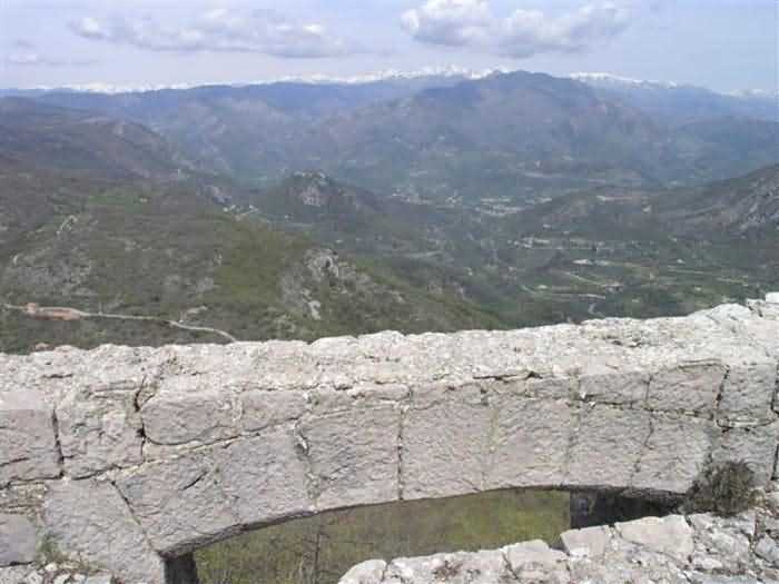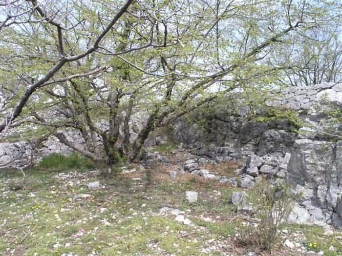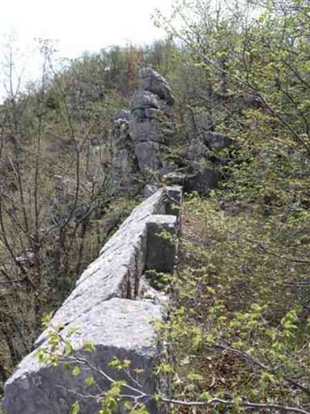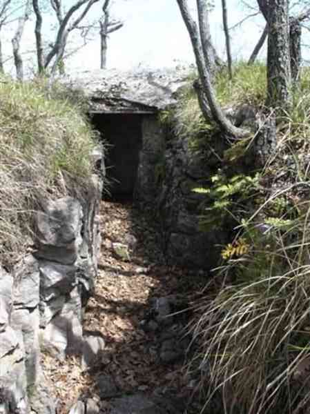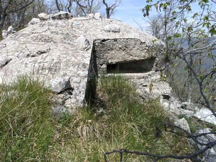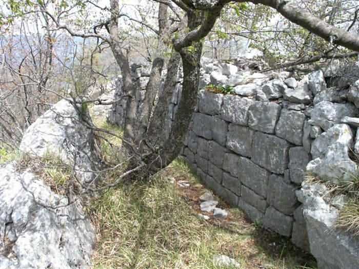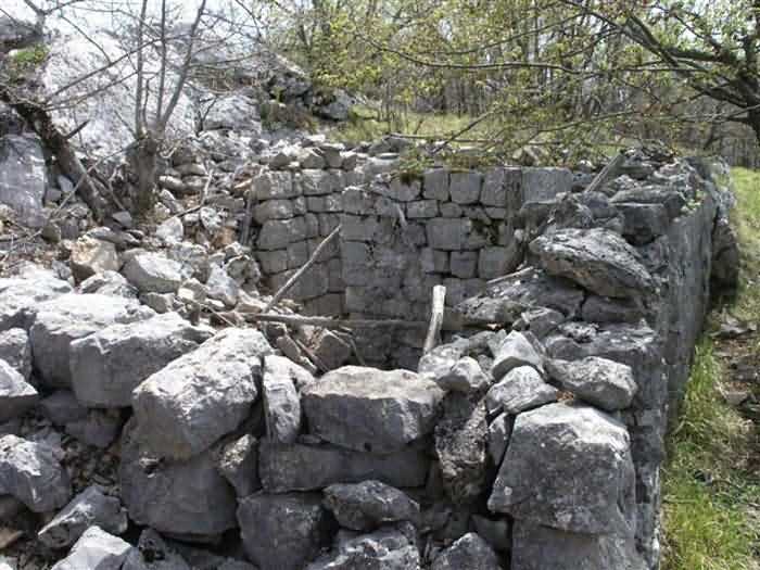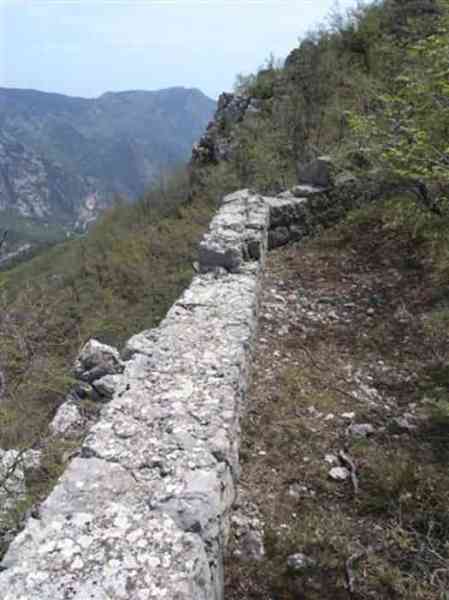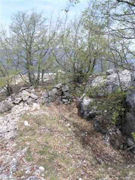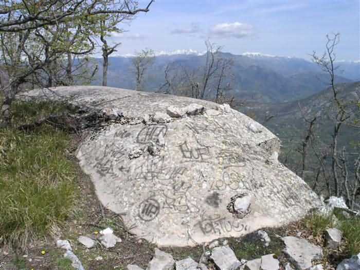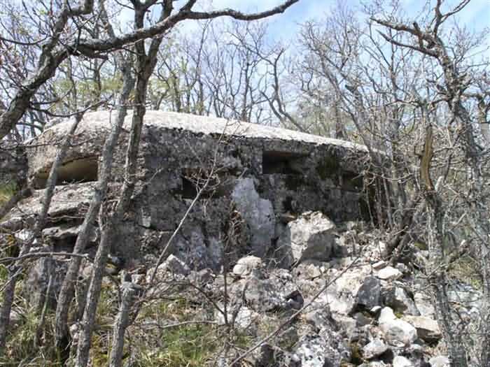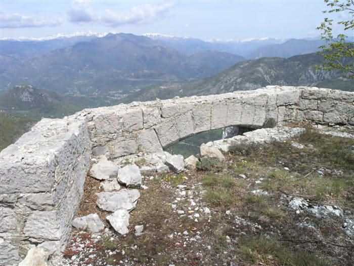 North-eastern avancées of Nice, 5,200 m south of Sospel, 189? 1,171 m/alt. The visitor who, as we have done, approaches one after the other the batteries of these avancées, will not fail to note that it is - finally - a relatively elaborate battery. It is located not far from the strategic path originating in a bend of the road climbing to the work of Mont Ours. This strategic path can only be used on foot or then in a very small 4x4 vehicle, so narrow it is. Behind the battery, it uses a defile which allows it to go serve the other works of the ridge, up to the peak of Garuche. The path leading to Tête de Loup detaches from it on the left and, quickly, one arrives at a hairpin bend. On the outside of the latter, a trench leads to a Military Labour Force observatory (Interwar period) very well preserved and with multiple embrasures. The battery is not far. One must continue to climb the path until a fork. The left branch, slightly descending, will lead you to remnants of a building whose masonry is in squared dry stones. It was divided into two unequal rooms, for a total surface of about forty square meters maximum. A few meters further, one emerges onto an area on the mountainside which, like an eagle's nest, offers views of Barbonnet, Sospel and the Sambora valley. An infantry parapet, in beautiful masonry and relatively elaborate (arch, coping stones, tablets, chamfers, …), dominating a precipice, extends on the right. If one returns to the fork and climbs the right branch, one arrives at the level of a quarried area that was to shelter horses or mules and caissons. The path bypasses this area and emerges onto a surprising platform, all in length (at least six to eight cannons could be aligned there) and devoid of parapet. From Mont Ours dominating it, one becomes better aware that the platform in fact comprises two angles, having the shape of an inverted "U" whose lateral branches are very divergent. On its left front, another Military Labour Force observatory, clearly more modest than the first, blends into the rock. The views of the Maginot work of Castillon are superb. Numerous counter-slope walls of this battery are covered with stone slabs. The place is superb and of totally free access (05/2008). See Nice (north-eastern avancées of).