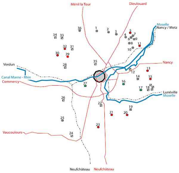 Dept 54 (Meurthe-et-Moselle). One of the four large squares of the East, closing the curtain of the highlands of the Meuse to the south. Blocks the gap in the Meuse-Rhine canal. 12 forts, 16 works, 3 redoubts, numerous batteries, shelters and magazines under rock. In fact, there is such a density of military constructions in this square that there is more to see outside the forts than inside, particularly due to the fact that concrete continued to be poured there during the First World War, in case the front gave way. Data from 1914 give no fewer than 402 cannons distributed in 82 batteries (+ at least 34 in the forts – excluding the armor and casemates of Bourges – not counting ± 140 12-breech cannons). These batteries, taken in groups and followed by a number, often have several names within which it is very difficult to find one's way. Important barracks in the city and outside (Sevastopol). Note that in 1944, the US troops carried out several explosive tests in this place in order to test the resistance of the concrete before going to rub shoulders with the Siegfried Line. This is how they blew up the work of La Cloche and at least two counterscarp coffers of the fort of Bruley, which they fired on the shelter of the Cutine,… but on the other hand, the damage to the throat coffer of the fort of Vieux Canton and the concrete barracks of the fort of Tillot, are reputed to be German. Toul is, after Verdun, the place that has preserved the greatest percentage of its armor. Finally, due to its proximity to the front, anyone walking through the place will likely come across some buildings dating from the First World War. For example, between October 1914 and February 1915, 12 164.7 mm naval guns were placed in battery in the entrenched camp, some in tanks, others in casemates. Colonel François cites the locations of Laneuveville, Lucey, Vieux-Canton, Villey-Saint-Etienne, Jaillon, Fontenoy, Chaudeney, La Chalatte, Bois-sous-Roche, Blénod, Charmes and Romont. Likewise, several anti-aircraft positions are distributed throughout the entrenched camp: Point-du-Jour, Villey-le-Sec (southwest of the redoubt), Bruley, Pagney, Blénod and on the fort of Domgermain. But, as we have often repeated during our escapades, we have not managed to see everything there. The dissimilarity between its forts is astonishing and we had some great moments there in Villey-le-Sec, Écrouves and Saint-Michel. As chance would have it, we started the inventory there that would lead to this index. It was a good thing we did because all the absolutely immaculate forts that we visited then have since suffered numerous insults including rubbish or tire fires as well as tags, thousands of tags. Fortunately, within this regrettable mess there are people who fight for this heritage, the association "La Citadelle" in Villey-le-sec and the town hall of Villey-Saint-Étienne deserve a serious tip of the hat in this regard.