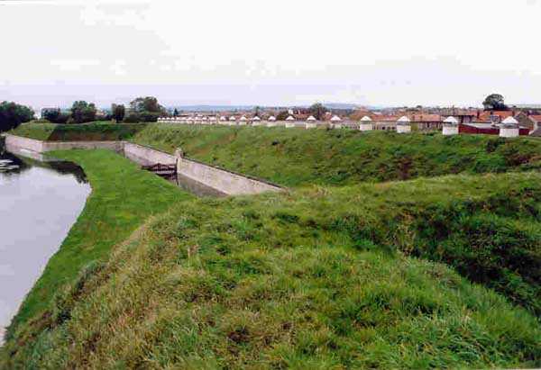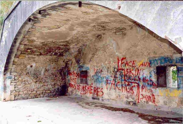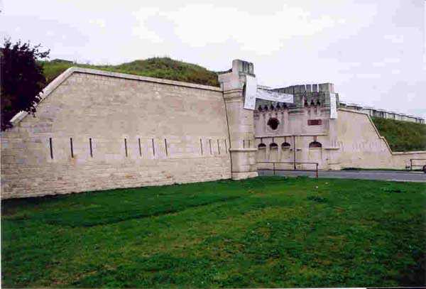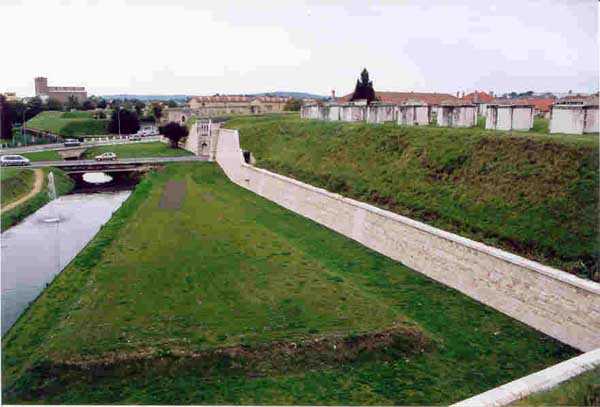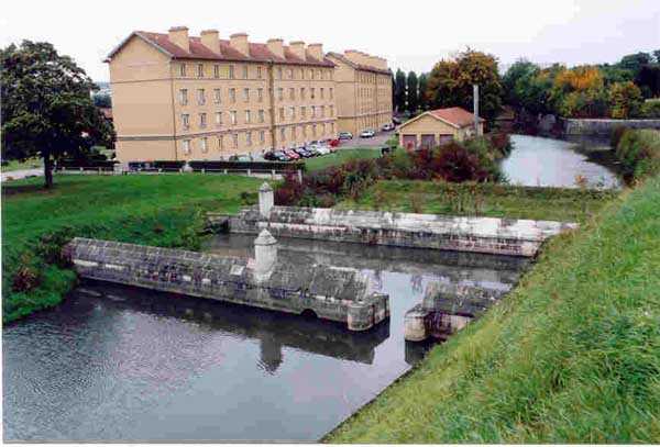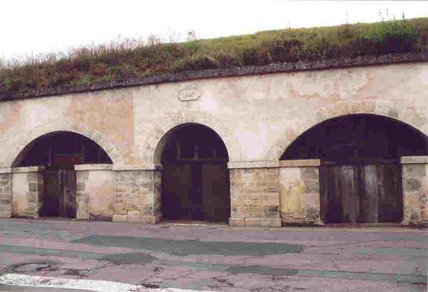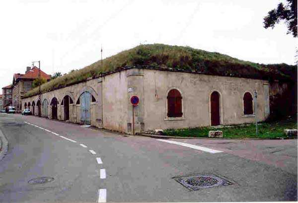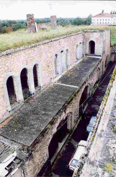 Toul Fortified Camp. The central core of the fortified camp, the city began to be surrounded by a fortified wall in 1700. Although this wall was never provided with the seven planned ravelins, it was nevertheless enclosed by a rampart comprising nine bastions and as many curtain walls and equipped with three gates, of which only the Metz gate remains today. For the period of interest to this index, the city of Toul contains several fine barracks that were put to the test, a total of five. Clockwise, starting from the west, we find successively: the Saint-Léon casemates (1867 - about twenty bays transformed into private garages), those of the rue de la porte de Metz (1876 - twice about ten bays), the Forey-Curial casemates (1875-1878 - about twenty bays, but quite dilapidated, those to the north being surmounted by premises for the firefighters), those of Rigny (1875-1878 - on two levels, 22 bays, dilapidated) and finally those of the Moselle gate (called Chatelet?) (1882-1883, the bays to the east superbly restored - media library - the 8 bays to the west of the gate abandoned, but provided with very beautiful cast iron plaques with the casemate number). At bastions 38 and 45 we will note an old barracks that has been updated and whose faces are arranged as light wells facing new casemates of the Séré de Rivières type, two-story casemates, the upper one being set back, forming a terrace in front of the barracks. Most of the bastions have hollow crosspieces and covered passages, but there are some with chronograms 1829 or 1830. The old gates of France to the west and Moselle to the south-east were rebuilt, the first in 1874 and the second, with many beautiful flourishes, in 1882-1883. The porch of the Moselle gate protected a laterally retractable rolling bridge. To the south-west, the Jeanne d’Arc gate was the last to pierce the wall, having only been built in 1900. It should be noted in passing that the bridge at the Metz gate was a clapboard bridge and is still visible and relatively complete. Not far from this gate, on the outside, there is a fortified bridge spanning the canal (a casemate with an open back, 10 m long and 4 m wide, with two embrasures 80 cm high and 40 cm wide) bearing a chronogram for 1846 on the inside and another one for 1877 on the outside. Bastion 38 (SSE) still had its handling, while the powder magazine to the right of the Moselle gate was covered with earth in 1877.