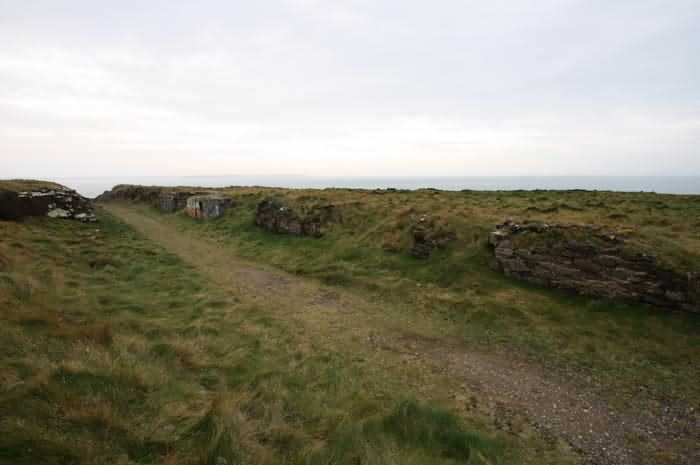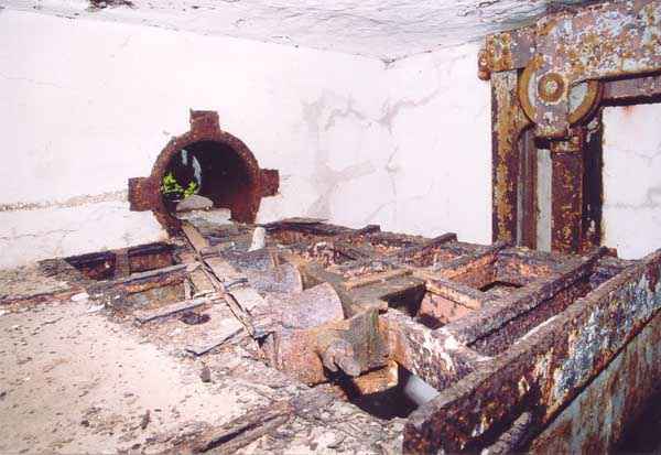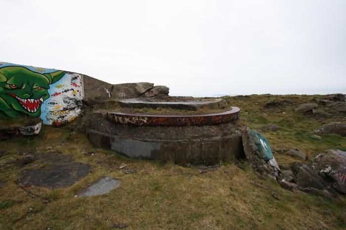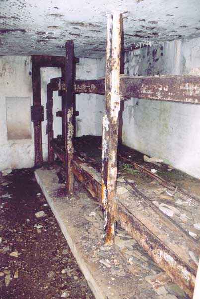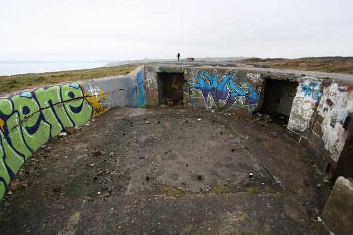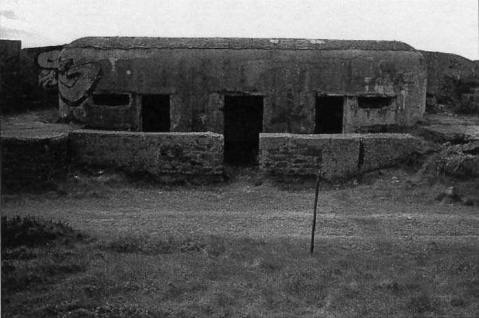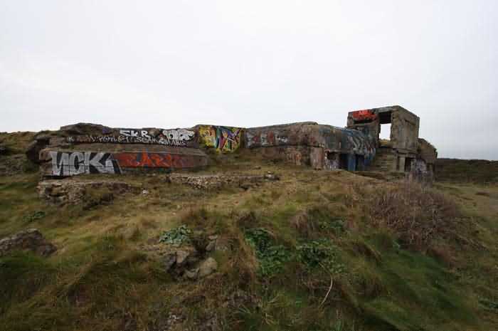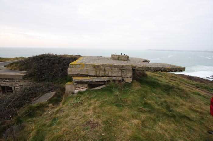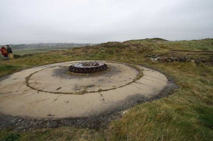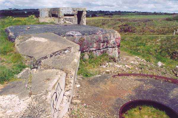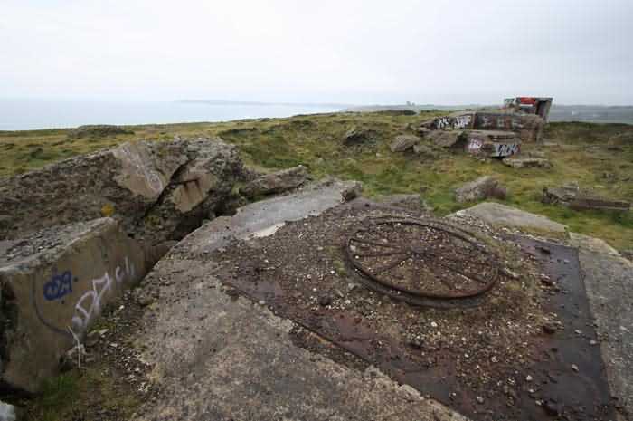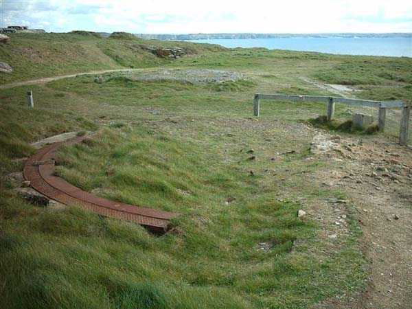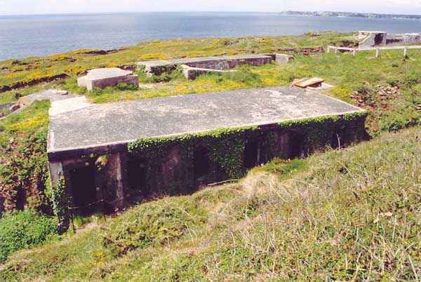 Place de Brest, nord du goulet, 1904-1905. Cette batterie en montre en réalité deux. Une batterie de 194 mm sera, début du XXème siècle, désarmée et partiellement détruite au profit Les 4 canons M de 19 c modèle 1870 sur affûts M mle 1884 P.A. de la batterie de l'Ouest, repris à l'état d'armement de 1900, sont, à celui de 1914, remplacés par 4 canons G de 240 mm modèle 1903 T.R. sur affûts G mle 1903. En fait ce sera une toute nouvelle batterie que l'on coulera directement sur les arrières de celle de 19 c. Elle alignait alternativement un abri soute (2 simples et 3 doubles) et un emplacement de tir, tandis que chaque extrémité comportait un poste d'observation. L'abri double sis le plus à l'ouest a explosé, endommageant les pas de tir qui lui étaient contigus. De nos jours, côté ouest, sur les avants et légèrement en contrebas de la batterie, on peut voir, outre un abri à personnel jouxté d'un autre observatoire, vestiges de la batterie de 19 c, un curieux pas de tir comprenant trois sous-sellettes d'affût différentes séparées par une dizaine de mètres, mais inclues dans un même quadrilatère. Nous avons pensé à un polygone d'essai car outre trois pièces différentes, il n'y a aucun parapet protecteur ni soute ou abri. Il n'est même pas exclu que ce soit une installation allemande. On peut aussi distinguer les restes arasés de deux magasins bétonnés du début et de la fin des années 1890 ainsi qu'une citerne. Côté Est, très proche de la batterie de 240 mm, se trouvent les vestiges d'une autre batterie française, de moindre calibre. Cette batterie de 240 mm, est très intéressante à visiter car, nonobstant les inévitables tags, les soutes disposent encore de leur système de manipulation des projectiles (berceaux, manivelles, chemins de roulement en galets, etc.). Voir position de Toulbroc'h.