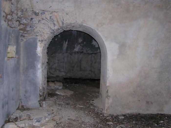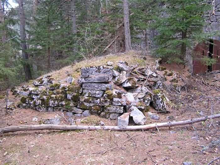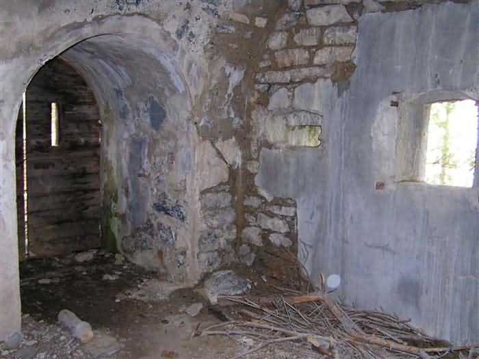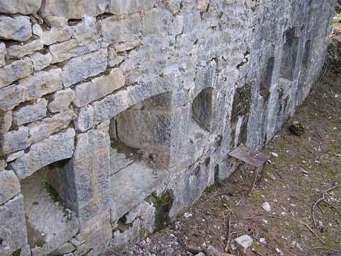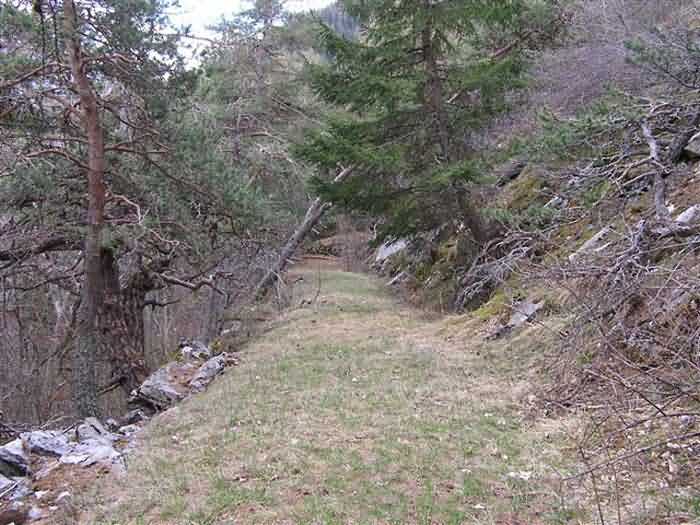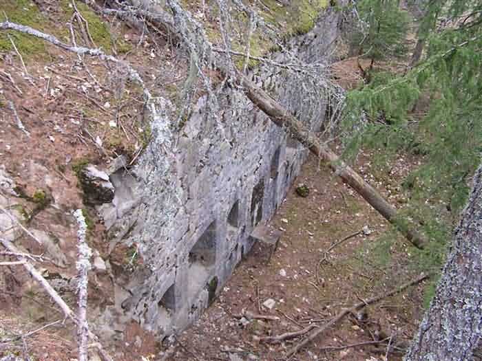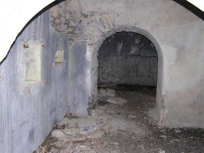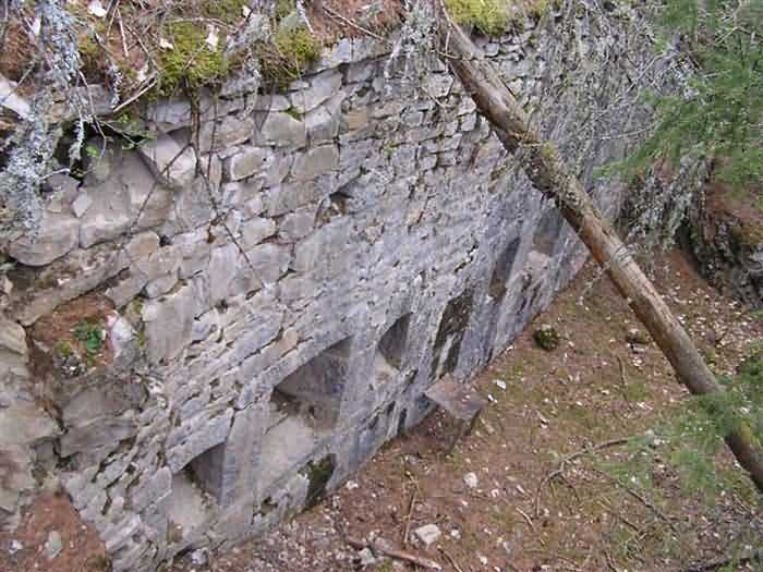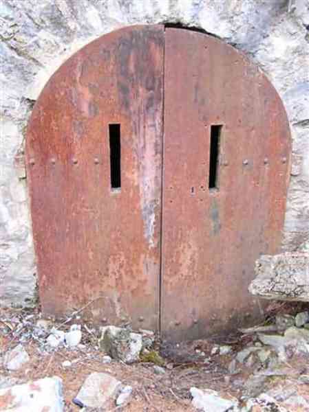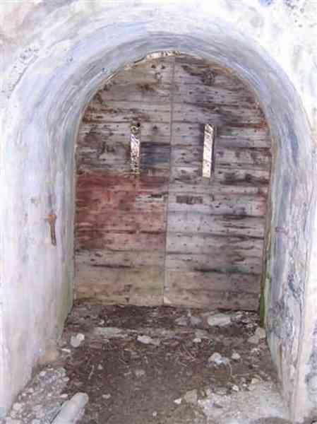 Fortress of Saint-Vincent, southeast of the fortress, 188? 1272 m/alt. Located 3200 m southeast of Saint-Vincent Fort, this post constitutes the most advanced element of the fortress. Rather surprising for those who don't know what to expect, it is only a simple parallelepiped casemate backed against the rock. With embrasures, two for guns framed by four for musketry fire, its facade resembles a caponier flank. Externally, this block has approximate dimensions of 9 x 5 x 4 m. Its wooden entrance door is covered with thick metal sheets. It is preceded by a sunken path for a few meters. The interior is that of a caponier, without the slightest frill, in which two 90 mm guns were placed that had only one objective, the bridge on the current D 900 (immediately upstream from the intersection with the D 954) whose destruction by plunging fire would have blocked any penetration downstream. We are however skeptical about the destruction capacity of an engineering structure with 90 mm shots but the fact remains that this is what was planned. Was there a mine device and were these guns only there to protect the destruction? That is more likely. The target was located 800 m from the post and nearly 400 m lower. Note that the bridge is not that of the current road which cut off the curve initiated by the road of yesteryear, but, although no longer in use, it was not destroyed and still remains. The work is in relatively good state of preservation (06/2006) and freely accessible.