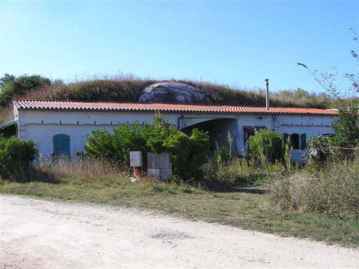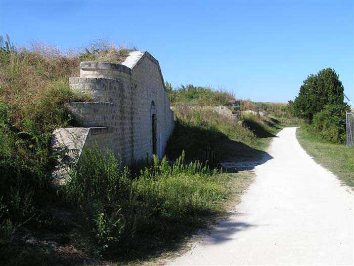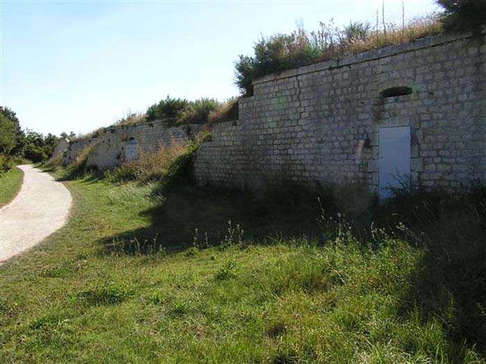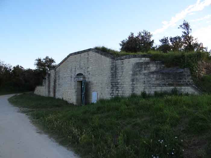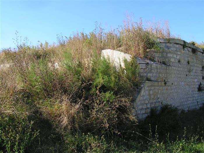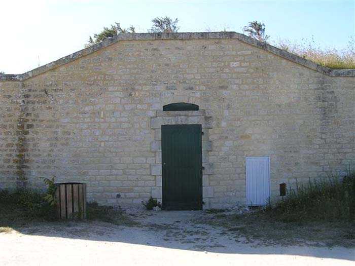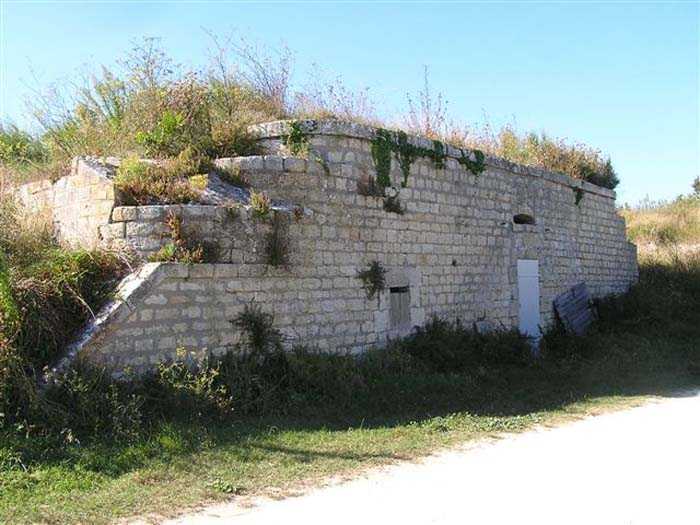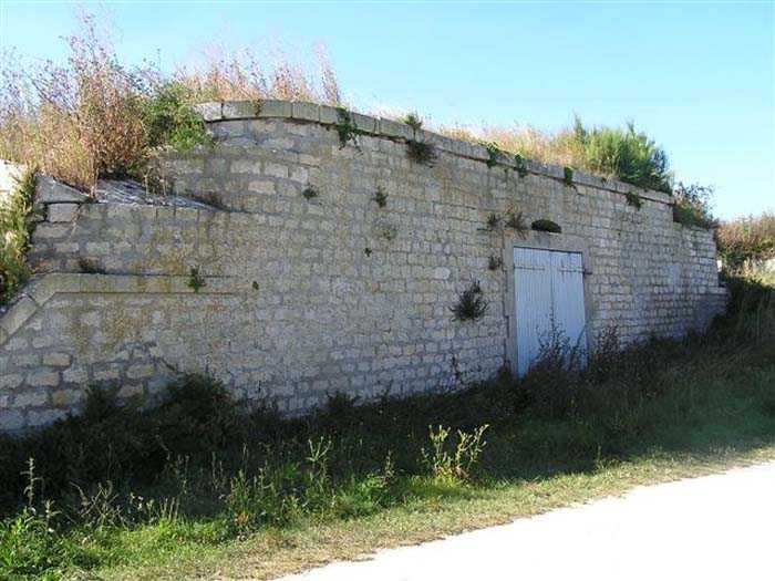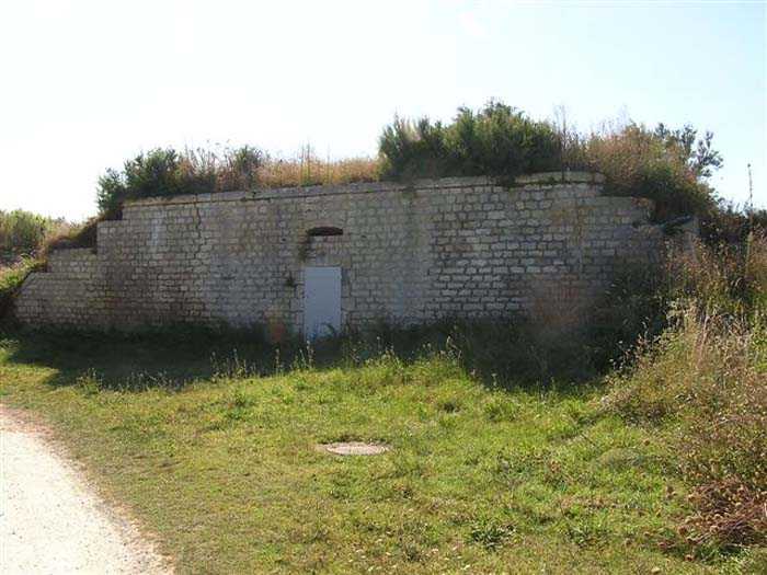 Fortress of Rochefort, Île d'Aix, 1878-1880. Located about one hundred meters north of the ditch of the La Rade village, on the site of a battery already existing in 1756. The initial project gave it exactly the same layout as the Fougères battery. It was a battery with dry ditches and an almost complete enclosure leaning against the seafront. The front, broken into a widely open "V", would have had at its center a powder magazine covered with earth or sand. On each side, two artillery emplacements would have been, themselves, separated by a more modest traverse. Each end of this front would have been delimited by a longer merlon. The gorge, at its center, would have possessed a triangular projection, like a bastion in whose left flank the entrance would have opened. A series of rooms, barracks and magazines, would have backed onto this gorge, on either side of the entrance tunnel. The realization turned out significantly more modest; no more ditch, no more bombproof rooms except for the traverses separating the four emplacements for 24-c guns, no more central magazine,… This battery, which is very rarely mentioned, was probably reorganized after 1889. Its four traverse-shelters, approximately twice as wide as the firing steps and with wing walls having stepped returns, are slightly staggered relative to each other. Its concrete magazine is now preceded by a modern construction in lightweight materials. Today (03/2008) freely accessible.