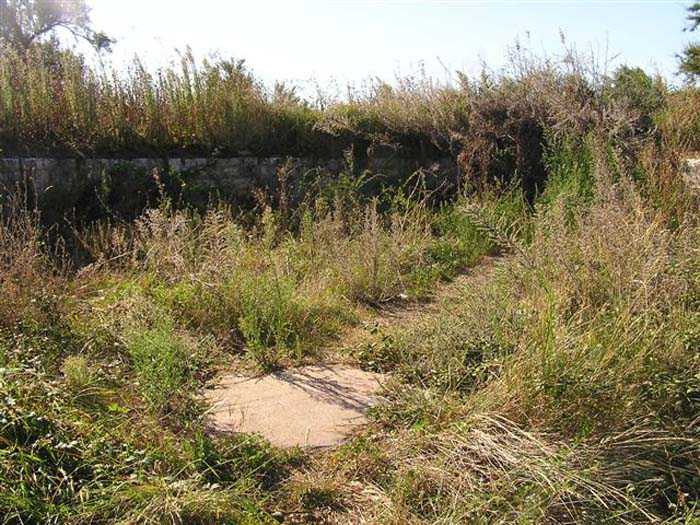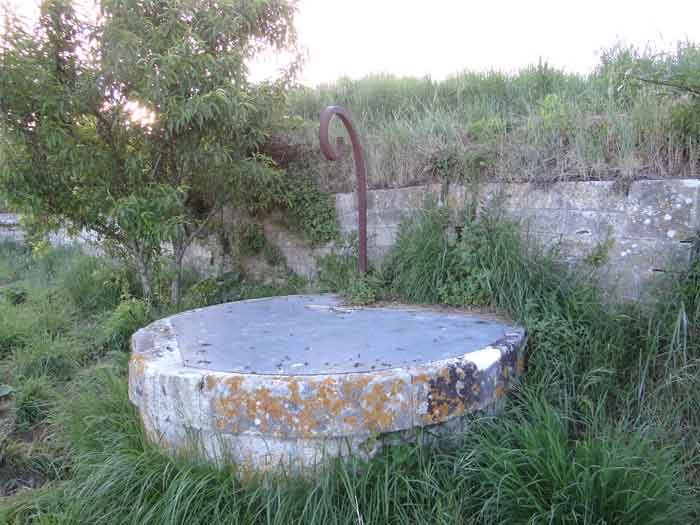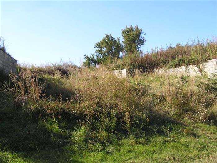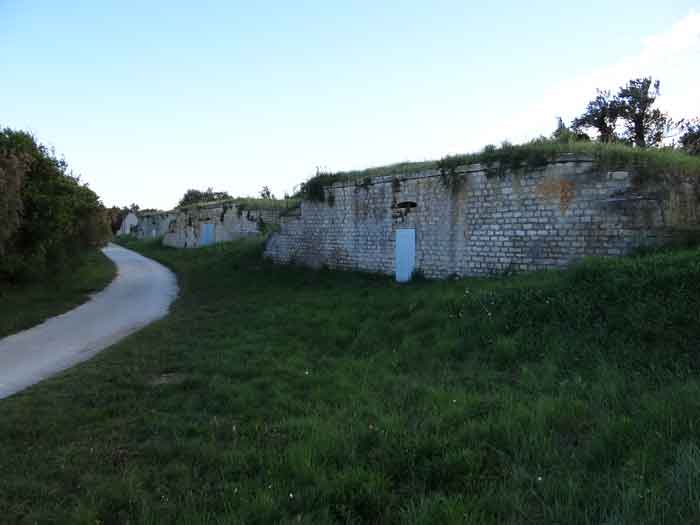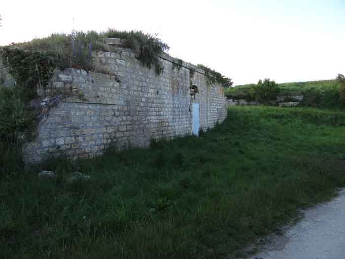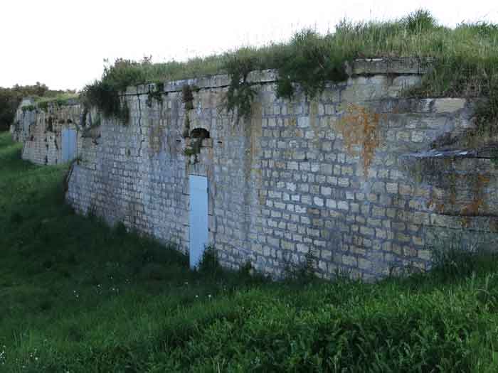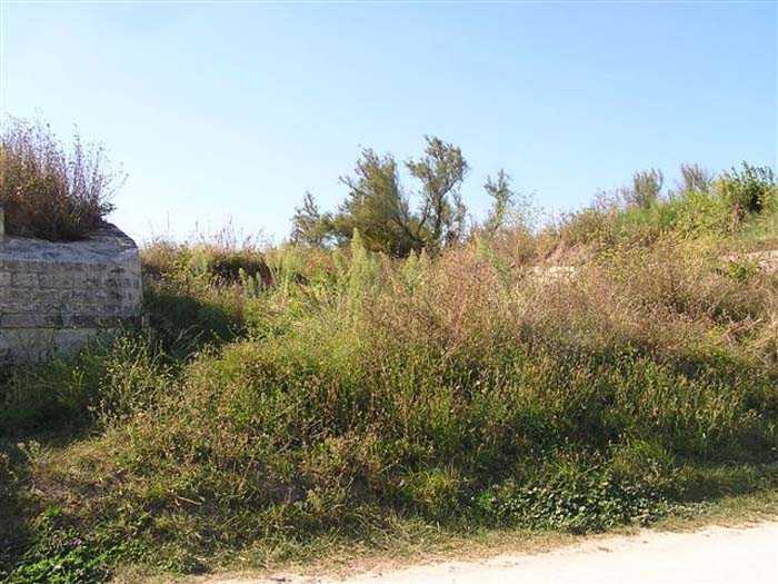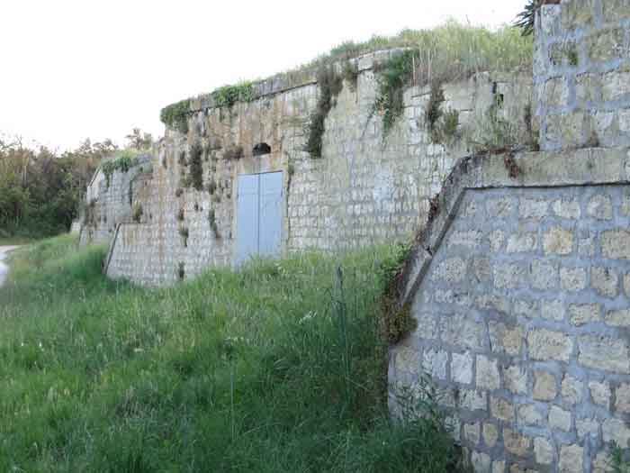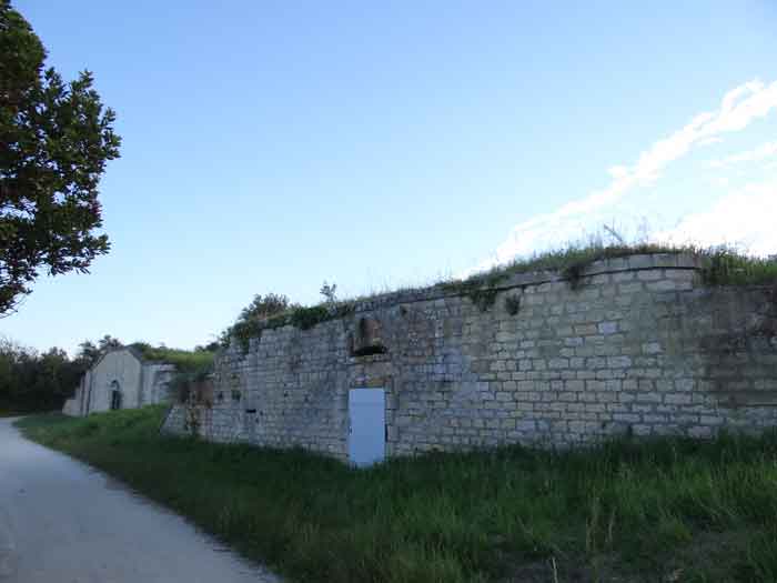 Fortress of Rochefort, Île d'Aix, 1878-1880. Located about one hundred meters north of the ditch of the La Rade village, on the site of a battery already existing in 1756. The initial project gave it exactly the same layout as the Fougères battery. It was a battery with dry ditches and an almost complete enclosure leaning against the seafront. The front, broken into a widely open "V", would have had at its center a powder magazine covered with earth or sand. On each side, two artillery emplacements would have been, themselves, separated by a more modest traverse. Each end of this front would have been delimited by a longer merlon. The gorge, at its center, would have possessed a triangular projection, like a bastion in whose left flank the entrance would have opened. A series of rooms, barracks and magazines, would have backed onto this gorge, on either side of the entrance tunnel. The realization turned out significantly more modest; no more ditch, no more bombproof rooms except for the traverses separating the four emplacements for 24-c guns, no more central magazine,… This battery, which is very rarely mentioned, was probably reorganized after 1889. Its four traverse-shelters, approximately twice as wide as the firing steps and with wing walls having stepped returns, are slightly staggered relative to each other. Its concrete magazine is now preceded by a modern construction in lightweight materials. Today (03/2008) freely accessible.