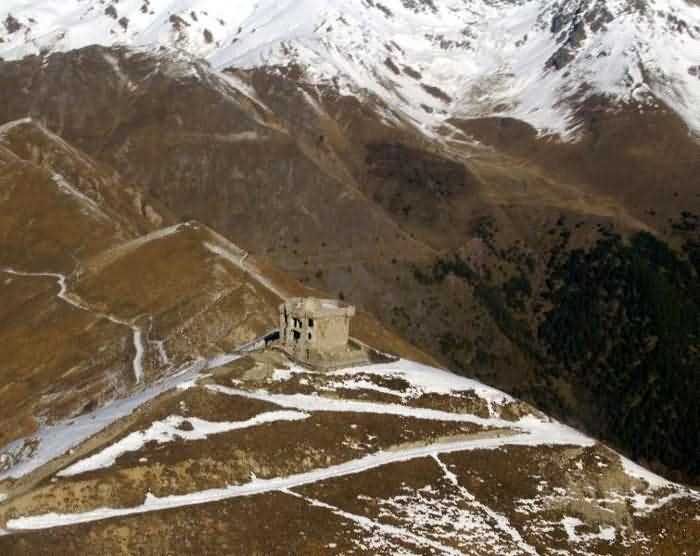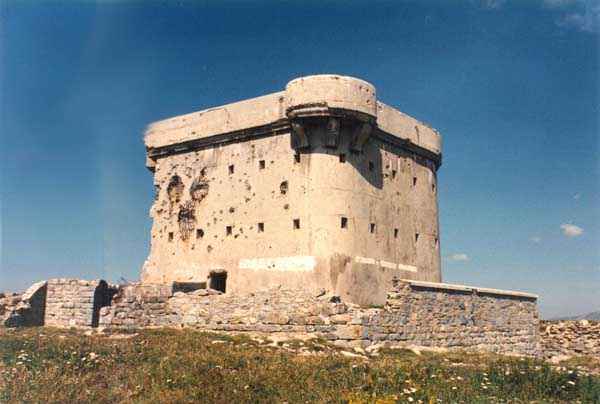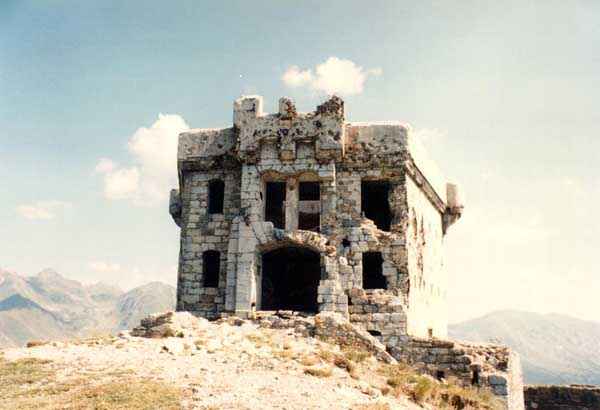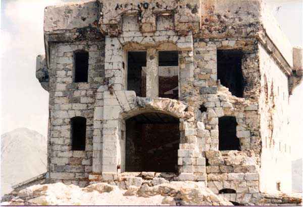North-eastern avancées of Nice, 14,000 m north of Sospel, 1897-1900. 2080 m/alt. 60 men. Occupying the summit at the very north of the Authion massif, this redoubt takes on a somewhat feudal appearance. It was the first work to be built in reinforced concrete (except its rear facade). Of pentagonal shape, it has a drawbridge crossing the ditch that encircles it on all sides. It experienced its baptism of fire in 1945 and the blows fell obviously on the weakest side, that is the gorge. The front of the head, in reinforced concrete, is intact. Sometimes called "redoubt of the Pointe des Trois Communes".