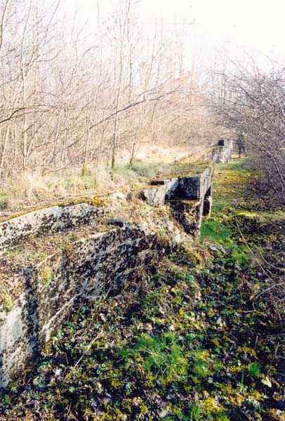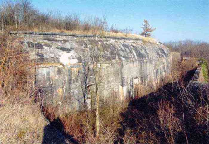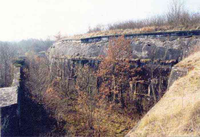 Toul fortified camp, northeast of the city, 1875-1878. 350 m/alt. 192 men and 16 guns. To occupy the western end of the plateau of Lucey, what was initially called "the western battery of Lucey" was built. Shaped like an irregular trapezoid, its dry ditches were defended by a double caponier at salient II and a wing at salient III. The defense of the gorge was carried out from the battlements of the semi-detached escarpment surmounting the sides of a small curtain wall specially built for this purpose. The entrance to the fort, framed by two pilasters supported by the counterweights of a Poncelet bridge, immediately faced the nine bays on a single level of a barracks with the particularity of having its sides folded back towards the front of the head. Thus, seen from above, it takes the form of a "V" whose each branch plus the base comprise three bays. The central bay of the base houses the stairs leading to the basement of the cisterns of the structure. Originally, the small fronts of the battery included two shelter traverses each, while the front of the head was furnished with three others. The battery had a powder magazine with a capacity of 50,000 kg. In 1889, near salient I, a powder magazine was dug under its glacis, connected by a freight elevator to the mass of the battery. It was not until 1906 that a thorough overhaul was carried out. It will last until 1909 and the western battery of Lucey will be named "fort de Trondes". The barracks will be preserved, but surrounded by a concrete shell. Concrete tentacles will be grafted onto it, which will allow access without going into the open air from the double counterscarp box, which replaced the double caponier in salient II, to the single box in salient III. To the left of the barracks, a machine gun turret will be grafted onto the access shaft to the box, and towards salient III, a block for a 75 Mle 05 turret will be cast. Each lateral front will be provided with a concrete picket shelter, just like the front. Two armored observation posts will complete the complex, one behind the 75 turret and the other, attached to the machine gun turret and located about fifteen meters behind the latter. The firing positions on the flanks of the gorge curtain wall will receive a concrete roof. Visiting it in February 2001, we were surprised by the good state of preservation of the premises, the latter not suffering a priori from humidity and their whiteness not having yet excited the devastating neurons of a youth in need of artistic expression. In the vaults, the tables of the rear sights for the 12-breech guns were still very clear. The fort was stripped of all its metal, including the ventilation grilles in the vaults of which only one or two examples remained. Some rooms dating from the first battery are ogival and the facade of the barracks, in cut stone with its door and window bays highlighted by terracotta bricks, still had a very proud appearance. The concrete shell created a circulation corridor in front of these barracks and the play of light, when the sun is out, allows for beautiful photos. It's also worth noting the embellishments of the cement film around the entrance postern gate at the bottom of the gorge ditch. The fort was then open to all winds and we have no recent information on the evolution of its condition. With Toul slowly acquiring the sinister reputation of having the most tagged forts in France, we fear that our immaculate photos now have archival value.