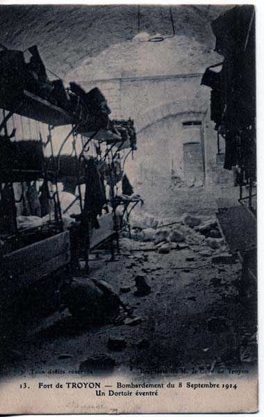Rideau défensif des Hauts de Meuse, 1877-1880. 264 m alt. Originellement pour 751 hommes, 42 pièces. Dénommé fort d'Essling. « C’est le même que celui de Génicourt ! » Nous ne comptons plus le nombre de fois où l’on a entendu cette assertion. Les similitudes sont grandes certes, mais ne pas visiter l’un sous prétexte d’avoir vu l’autre est une erreur à ne surtout pas commettre. Dans les grandes lignes, mission, périmètre, ravelin, disposition du casernement, des magasins à poudre, des caponnières, des bonnettes d’infanterie et de la rue du rempart, y compris le nombre de traverses-abris, il n’y a rien à redire, c’est exact, les deux forts sont identiques. Dès que l’on entre dans le détail, les différences se font jour. Le ravelin, une pure merveille, comprend aussi six casemates à tir indirect. La défense de ses fossés s’effectue cependant depuis une petite caponnière aux maçonneries très soignées placée à la tête du ravelin. Ici, point d’écuries ni de poste optique dans le ravelin. Le pont-levis de l’entrée est du type Devèze et l’association en place en a retrouvé les contrepoids circulaires. Pour rappel, ce type de pont est relativement rare et il n’en subsiste qu’un seul en parfait état, à la batterie de Sanchey à Épinal. Le cartouche au fronton du fort a, lui aussi, été dégagé des gravats. En capitale, le passage dans la cour du casernement de la troupe s’effectue à ciel ouvert, il n’y a pas de travée centrale. Les fours à pain, presque moitié plus petits qu’à Génicourt puisque la fiche technique du génie n’indique que deux fours de 180 rations pour deux fours de 300 rations au fort voisin, sont disposés longitudinalement dans la manutention (latéralement à Génicourt). Les casemates à tir indirect sont plus excentrées. Les magasins à poudre sont légèrement ogivaux. Les clefs de voûte aux croisements de galeries sont réellement particulières. Elles adoptent une figure géométrique dont le seul angle aigu indique systématiquement la direction d’un poste de combat. Les creux des orillons des caponnières comptent parmi les plus esthétiques de France. De façon plus générale, le travail des tailleurs de pierres et des maçons a été ici bien plus soigné qu’à Génicourt, lequel ne démérite pourtant pas en la matière. C’est ainsi qu’à Troyon les casemates des casernements ont plus de reliefs, les piédroits ayant des bossages. Les caponnières possèdent une large ouverture dans leur voûte, parallèlement et presque contre le mur des embrasures à canon. Les magasins creusés vers 1889-1890 n’ont pas leurs entrées dans le fossé du ravelin, mais bien dans la contrescarpe de la gorge, l’un entre l’entrée du fort et le saillant I, l’autre entre l’entrée et le saillant V. Troyon a subi de plein fouet l’attaque allemande début septembre 1914 et les destructions subies sont plus que conséquentes. Ainsi que nous avons l’habitude de le dire en pareil cas (Cerfontaine, Nogent-l’Abbesse, Manonviller, Camp des Romains, Tavannes…) paradoxalement, le fort est beau d’être détruit. Ses blessures béantes dévoilent ses structures mais, au-delà de l’aspect architectonique, c’est aussi un formidable témoin de la confrontation entre une arme nouvelle (l’obus-torpille) et un bouclier suranné. Les quelques modernisations n’interviendront que durant le conflit. Sur les glacis, on va couler une casemate pour deux canons de 75 mm qui ne sera pas sans rappeler les casemates de Bourges. Ses chambres de tir sont côte à côte et non en échelon refusé ; elles paraissent aussi plus étroites et semblent plus destinées à recevoir du 95 mm sur affût crinoline, mais pour trancher la question, nous devrons y retourner, n’ayant visité Troyon qu’en mai 1996 et mai 1999, alors que nos acquis de l’époque n’étaient pas ceux du moment où nous couchons ces lignes sur le papier, c’est-à-dire juillet 2008. À l’arrière de la casemate, une entrée étroite était protégée par un créneau de tir. Deux cloches Pamart à deux créneaux (dont une dont le bloc a une sortie de secours !) seront, comme cette casemate, reliées au réseau de travaux 17. Celui-ci, raccordé aussi aux magasins de contrescarpe, est en grande partie interdit d’accès pour la protection des chauves-souris. Nous n’en avons jamais vu de plan, ni n’en avons parcouru la totalité, mais il semble bien qu’une très longue galerie file vers la Meuse. Un autre aménagement, moins connu, est l’installation d’un observatoire cuirassé sur les dessus du casernement. Ce cuirassement fut retiré durant l’Entre-deux-guerres pour être replacé sur le fort de Vaux dont les casemates de Bourges avaient été restaurées et remises en état opérationnel. Toujours pendant le premier conflit mondial, dans le ciment au sol de certains passages, des obus, insignes et compas d’artilleur ont été gravés. Haut lieu de la résistance devant l'invasion en septembre 1914, alors que les Allemands perçaient les Hauts de Meuse par la trouée de Spada, Troyon fut bombardé avec des pièces allant jusqu’au calibre 305 mm. Ces mortiers venaient de participer aux sièges de Namur et de Charlemont. En août 1914, Troyon n'était armé que de 4 × 120 L, 12 × 90 mm et 4 mitrailleuses en plus des 12 pièces de flanquement. Malgré cela, par la volonté du capitaine Heym et le courage de la garnison, le fort fit obstacle à un encerclement de Verdun. Un premier combat fut livré du 8 au 10 septembre pendant lequel le fort reçut, estime-t-on, 200 coups de 305 mm. C’est lors de la seconde attaque, du 22 au 27 septembre suivants, le 23 septembre à 15 heures exactement, qu’un projectile creva le plafond du magasin à poudre nord où reposent encore de nos jours 18 braves. Dans une région profondément marquée par le premier conflit mondial, Troyon ne sera représentatif que d’une infime 