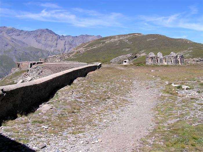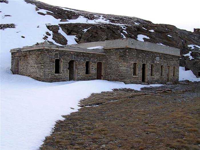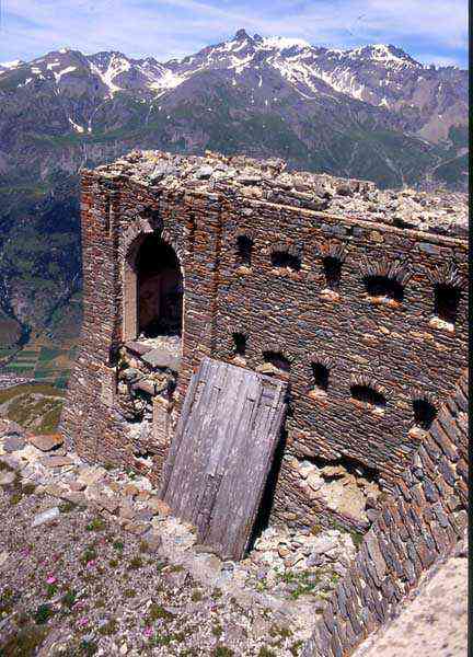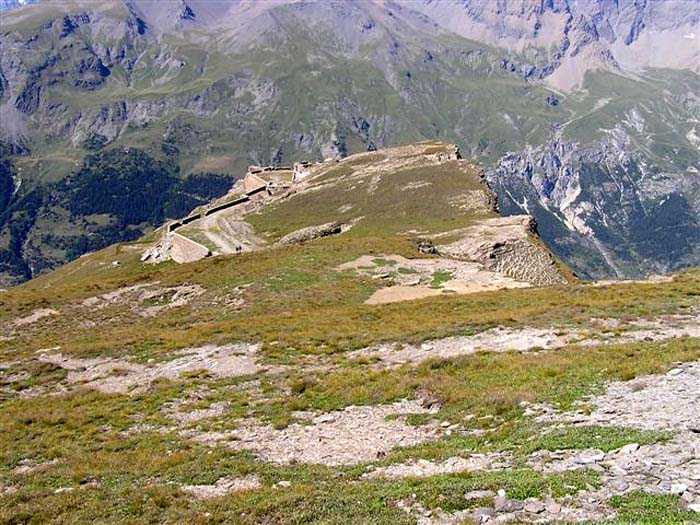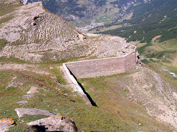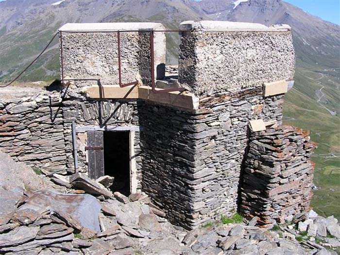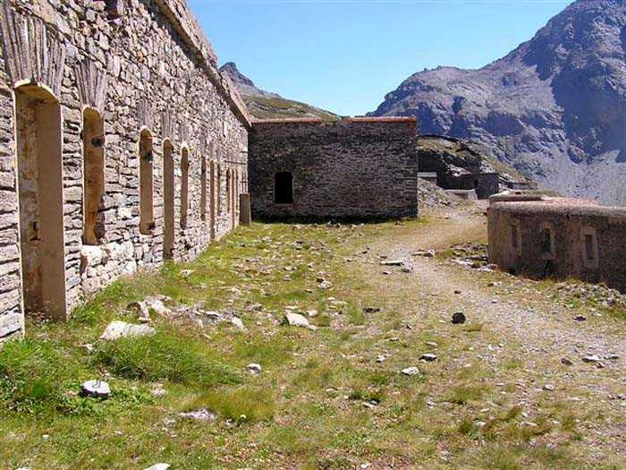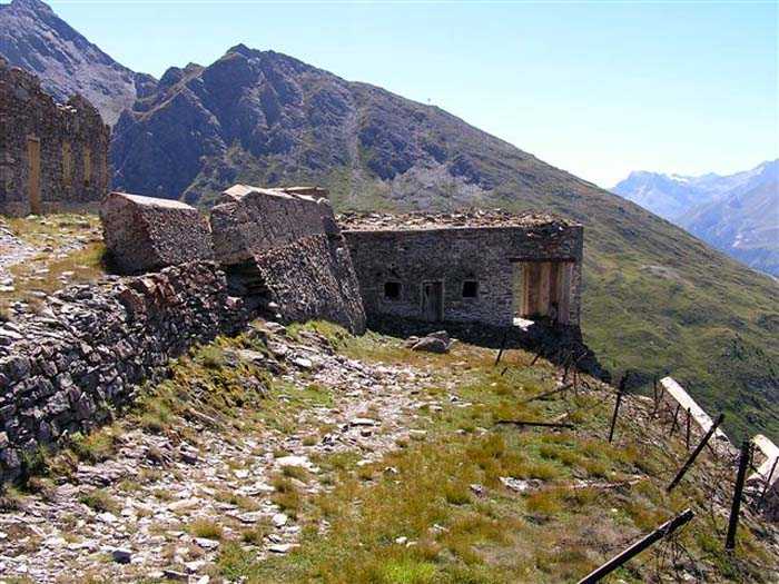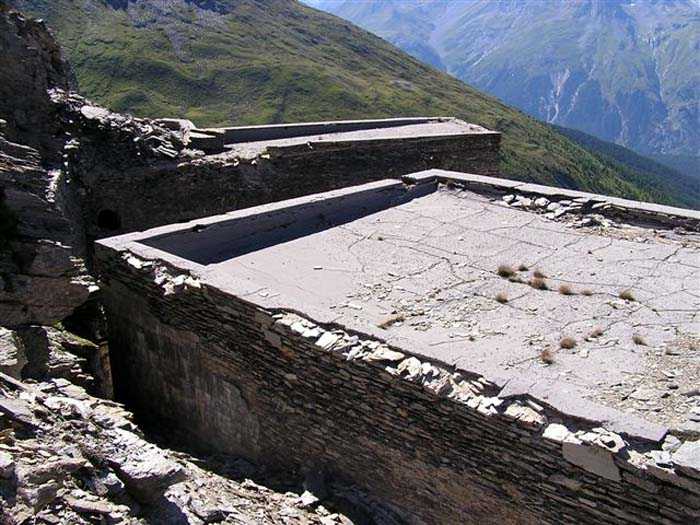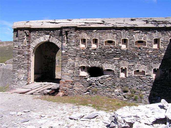Fortress of Lanslebourg, 2,000 m south of the town, 1893-1914. A plaque placed by the municipality gives 1898 as the year of construction. 2507 – 2,529 m/alt. 288 men (157 men in 1900), 15 pieces i.e., 9 x 120 L and 6 x 65 M, including subsidiary batteries, but excluding the four rock-cut casemates, as they were unfinished. It barred with its fire the Col du Mont Cenis and countered the opposing artillery. Located astride the two hillocks that form the Petite Turra, directly above the Col du Mont Cenis which it dominates by 400 m, its situation on the edge of a rocky ridge gives it excellent views of the Mont Cenis plateau and the old Italian forts that blocked the entire hollow where the Lac du Mont-Cenis hides (see Lanslebourg). Moreover, it would be regrettable, if one visits the site, not to at least visit that of Ronce (1877) whose beautiful architecture blends perfectly into a grandiose setting. The views from the Petite Turra also extended over the Haute Maurienne upstream of Lanslebourg. The fort integrates perfectly into the relief by adopting a very elongated shape in the north-south direction; the buildings are built on the reverse slope of the hillocks on a vast platform on the west side. The perimeter is defended by a dry-stone escarpment describing a broken line, surmounted by a parapet of lean concrete pierced with rifle loopholes, benefiting from a single small bastion in the southwest salient; bordered by a precipice on the east side (Col du Mont Cenis); finally by a rough excavation ditch on the north slope (Lanslebourg). Access is via two similar entrances, equipped with a drawbridge crossing a ditch 3 m deep. In the raised position, the drawbridge folded back onto a porch set into a crenellated building forming a guardhouse and constituting the only defence of the access. The north entrance allows access to a subsidiary battery, the south entrance constitutes the main access. It is worth dwelling on the presence of two entrances, apart from the rarity of the thing, nothing on site justifies this option. Indeed, the north subsidiary battery is served by a road grafted onto the access road; therefore, there is no need to pass through the fort. Past the south entrance, one discovers a first barracks, topped with a flat roof forming a terrace; composed of 2 large dormitories and 2 other smaller ones. A corridor at the rear protects from humidity and ensures circulation in case of bad weather. We arrive at the parade ground, an important earthwork located between the hillocks. In the centre stands the officers' hut, an ordinary masonry construction. Next to it a fountain of lean concrete, fed by a spring captured at the foot of the Pas de la Beccia, conveyed by means of a channel and a reinforced concrete pipeline totalling 2000 m in length. To the right, a piece of escarpment closes the only passage offered by the eastern slope. If we continue the visit following the earthwork towards the north, we pass by the entrance to a rock-cut chamber, which the plan indicates as a cistern, but whose collapse prevents any confirmation. A little further on, a building houses the latrines. Then comes the second, larger barracks, taking the shape of an "L". We find there successively 5 dormitories for the troops, 3 rooms for non-commissioned officers, finally 2 other dormitories for the officers. The flat roof collected rainwater to supply an underground cistern of a dormitory. A corridor at the rear of the building facilitated circulation in bad weather. Arriving at the northern end, an ordinary masonry building faces Lanslebourg. It is a magazine, in which a kitchen has been arranged. All the buildings are of jointed dry stones, entrances included. At the summit of the north hillock, a platform accommodated 4 pieces. Another for 2 pieces is located on the flank of the south hillock. Both are intended for mountain pieces whose ballistic capabilities are perfectly suited for firing on the Col du Mont Cenis. They are devoid of parapet and ammunition niches. Access is by a good covered mule track. Intelligence was provided by an observatory, judiciously placed on the southeast salient. This construction of jointed dry stones is surmounted by a platform bordered by a parapet of lean concrete. A trench cut from the rock allowed sheltered access. To complete the position, two subsidiary batteries were built. The first, located on the north slope below the fort, comprises a platform for 3 pieces directed towards the Haute Maurienne. It was served by 2 roads, one descends from the north entrance in many hairpin bends, the other crosses the western flank below the fort to join the strategic road at the Collet. It is at the Collet that the second subsidiary battery is located, comprising 6 platforms staggered in height, aimed at the Mont Cenis plateau. These subsidiary batteries are devoid of parapet and ammunition niches; they are designed to receive 120 L/78 pieces (95 mm guns have also been recorded). Access from Termignon is via a strategic road shared with the Turra barracks. As the pieces were in the open air, and therefore vulnerable, it was undertaken to place them under rock. Four gun casemates are dug under the north hillock. The casemates are connected at the rear by a transverse gallery, a gallery onto which the two entrances are grafted, opening on either side of the north barracks. The work, begun in 1898, remained unfinished in 1914. These casemates were to house 4 pieces of 120 L/78. One must wait for the Interwar period for the work to be completed. The construction site was used to transform the central casemates – No. 2 and 3 – in order to arm them with 75/97 pieces on an Arbel platform. At the same time, emplacements for automatic weapons are built on the south hillock (firing towards the Beccia); small constructions of dry stones covered with a roof of stone slabs on a wooden frame, which, although exceeding the scope of this study, are well worth a look! A cable car 