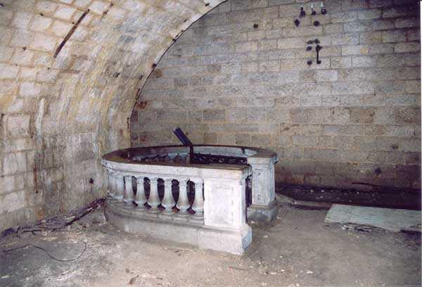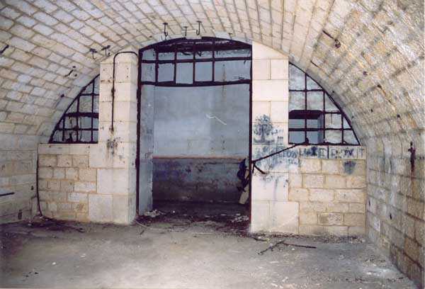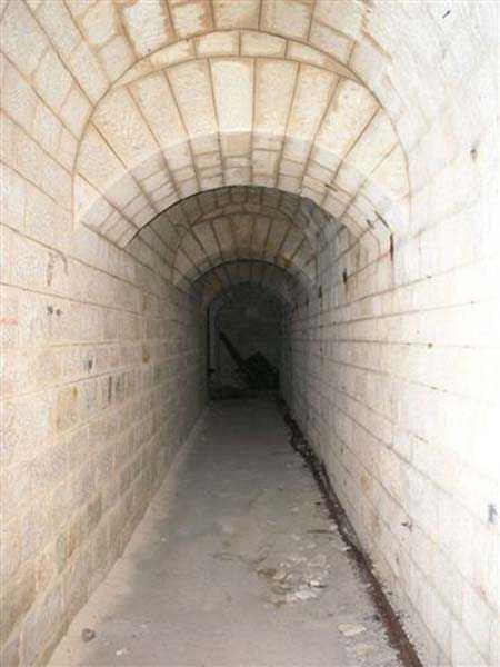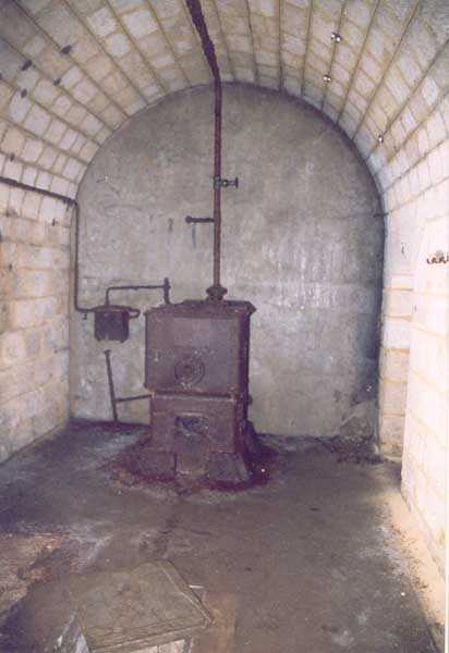 The intermediate-level barracks of Verdun’s citadel, constructed in 1914 based on 1912 plans, lies between the southern casemates and the surface. Partly underground and made of concrete, it was designed to house the governor and his staff. Access is via a 90-step spiral staircase of red bricks, with white brick inlays forming Lorraine crosses at each half-turn. The building also contains a La Gauloise boiler, hot-water coils, and a pump, providing minimal comfort for officers. The internal layout emphasizes security: each room is separated by thick walls and protected corridors, and the structure connects to the citadel’s deep underground galleries. The intermediate barracks illustrate the evolution of underground logistical facilities in the early 20th century, combining protection, functionality, and relative comfort within a heavily fortified environment. Partially accessible today, it remains a rare example of a fully underground command barracks in a French entrenched camp.