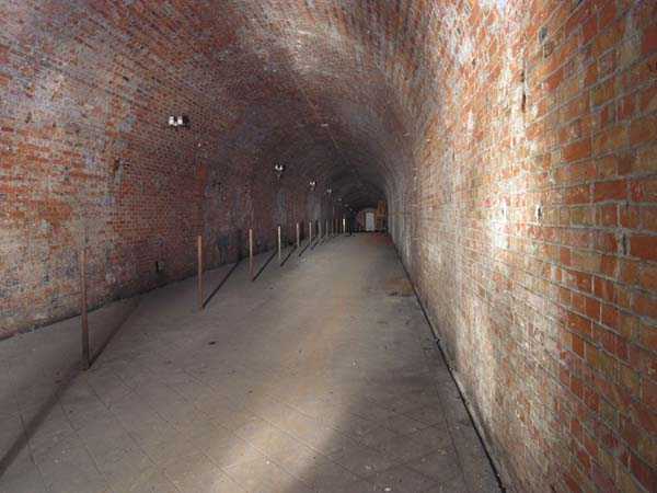 Les magasins souterrains de Verdun constituent l’épine dorsale logistique du camp retranché. Creusés entre 16 et 20 mètres sous la surface, ils accueillent poudres, projectiles, obus et cartouches, dans des salles voûtées et isolées, avec des allées centrales permettant une circulation sûre. Ces magasins sont reliés aux casernements souterrains, dont le plus célèbre est le casernement intermédiaire, conçu pour abriter le gouverneur et son état-major, intégrant chaudières, circulation d’eau chaude, escaliers à vis en briques rouges ornées de croix de Lorraine et passages protégés vers les galeries. L’ensemble forme le réseau de galeries Guinot, plus de 7 km de corridors creusés entre 1890 et 1893, dont certaines étaient destinées à l’acheminement rapide des munitions vers les bastions et les batteries, d’autres servant d’abris pour les troupes. Ces galeries souterraines constituent le plus vaste complexe militaire pré-Première Guerre français, associant sécurité, rapidité de mouvement et protection contre les tirs ennemis. L’architecture respecte les principes Séré de Rivières : voûtes solides, remblai épais, isolation des stocks et ventilation contrôlée, garantissant à la fois fonctionnalité, sécurité et conservation des munitions. Aujourd’hui, seule une infime partie est accessible, mais elle illustre parfaitement la sophistication logistique et défensive de la citadelle à la fin du XIXᵉ siècle.