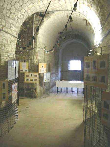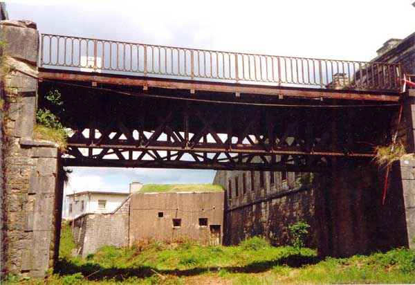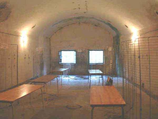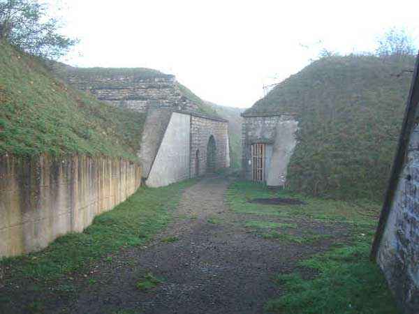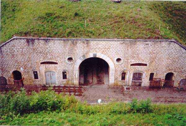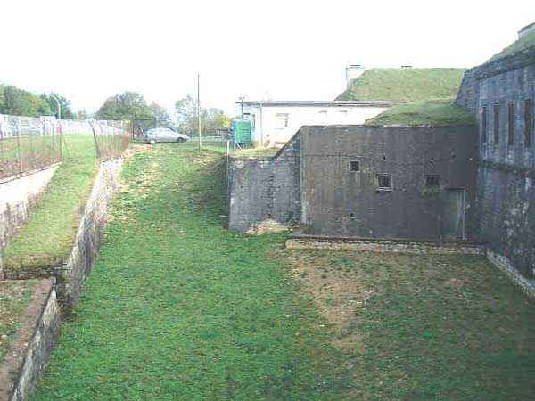 Belfort fortified camp, southeast of the city, 1883-1886. 394 m/alt. ± 500 men and 32 guns. Called Fort Ordener. A large regular pentagon, the Vézelois fort was built on a plan quite similar to that of Bessoncourt. Like it, its ditches were defended by two wings (salients II and IV) and a double caponier (salient III). Like it, the gorge has a wide curtain wall, a central courtyard, and the powder magazines are identically placed. However, the comparisons end there; the fort we are concerned with here is smaller and more compact. In terms of major differences, the Rue du Rempart is much more classic here and lacks the gun shelters and infantry positions that make Bessoncourt unique. The counterscarp vaults that replaced the caponiers during the 1906 modernizations were immediately connected to the central massif by underground galleries, and we do not find any network dug during the First World War. The two vaults of the curtain wall were concreted. The bottom of the latter aligns two times five bays on either side of the entrance porch. The latter bears its baptismal name from the decree of General Boulanger on the pediment. The central courtyard, quite narrow, shows a line of sixteen barracks on a single level, the arch of the vault of which is not emphasized on the facade. The capital passage separating these sixteen barracks into two equal parts was concreted, as were the eight bays on the right. The four barracks located on the far right were even lengthened during a first modernization in 1888. From this right part a ramp descends to the gorge ditch, just in front of the right chest of the curtain wall where, probably also around 1906, a war entrance was concreted. By taking the latter, one passes on the left of the cisterns which, like those of the fort of Mont Vaudois and the work of Monceau, are made up of concrete sarcophagi independent of the side walls. In 1908, armoring was installed. The nine shelter-crossings that made up the rue du rempart were concreted at the level of their arms, retaining only part of their premises. A concrete covered passage with double access folded towards the central massif will join the former traverse no. 7 to the concrete barracks of 1888. A block for a 75 turret will take the place of the axis of the old shaft leading to the wing of salient II, a shaft filled over the rest of its length. The other shafts, towards salients III and IV, will be similarly filled, but in front of a machine gun turret. Finally, a Bourges casemate flanking the interval towards the Méroux work will take place in the center of front IV-V. A nice wall sketch of a colonial troop insignia can still be seen in one of its firing chambers. Visited in August 2000, the Vézelois fort had just been ceded by the army, which until then had maintained an ammunition depot there. Immediately taken over by a very dynamic association, the fort has not suffered the pangs of abandonment. Since then, there has been very little damage apart from the reinforcement of all the armor, including the four armored observation posts. Many rooms were covered with lightning cables, and part of the ditch at the head front and the left side of the gorge front was filled in. Today (08/2007), the scene of numerous events, the Vézelois fort is open to the public. Two annex batteries are known to exist and, to its rear, 150 m to the northwest, a small intermediate magazine.