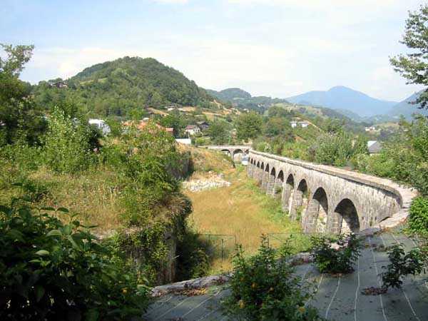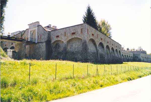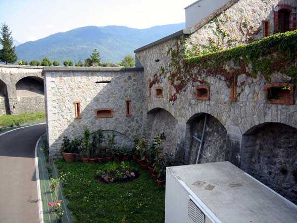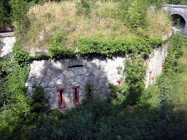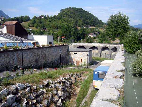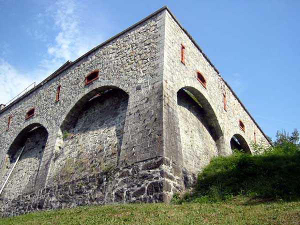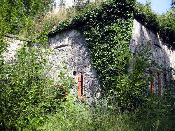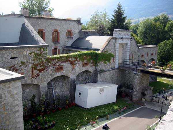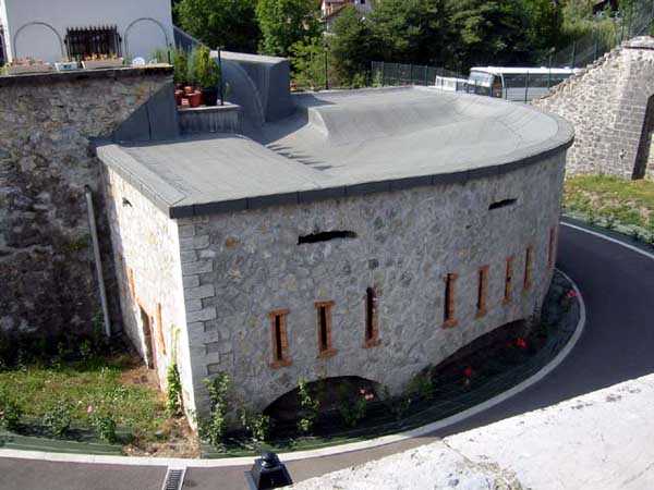 Fortress of Albertville, west of the town, 1875-1880. 420 m above sea level. Named fort Marchand. 411 men, 10 guns, all on the rampart of the cavalier. Large fort, particularly well cleared, with a rectangular shape, the entrance being in the middle of one of the short sides. It lacks a ditch on its northwest front, front equipped with foot and rifle loopholes, while the southeast front shows, at each of its salients, a defense of two fronts, thus either a double caponier or a small bastion. The powder magazine had a capacity of 45,000 kg. The barracks had an oven for 250 rations. Like fort Lestal, rubble masonry is combined with fired brick masonry, making it a very aesthetic fort. A very rare example of an internal hoist in a traverse is said to still be there. This fort is located barely 500 m from Albertville. Sometimes called "fort de Villard-dessous". Sometimes reported as completed in 1878, which is contradicted by the technical sheet of the Engineering Corps written in 1881. In perfect state of maintenance. Private property.
