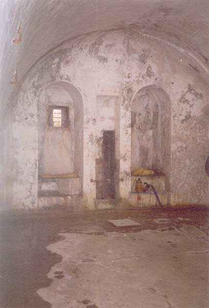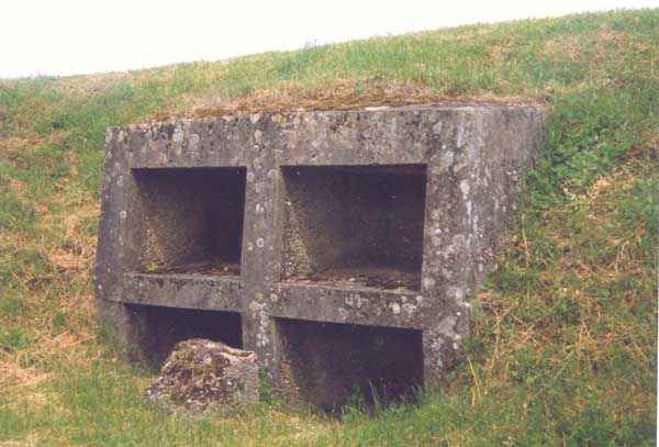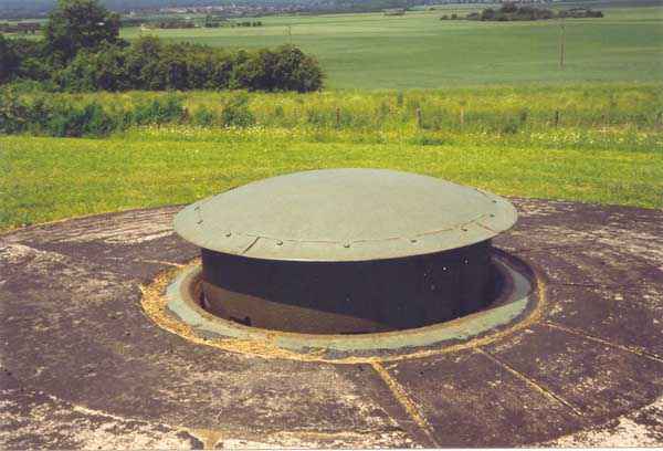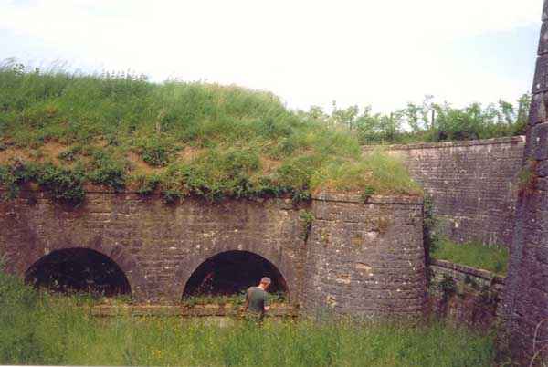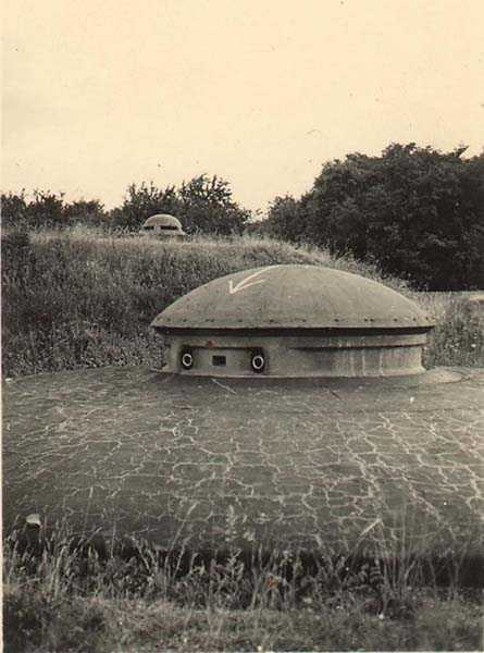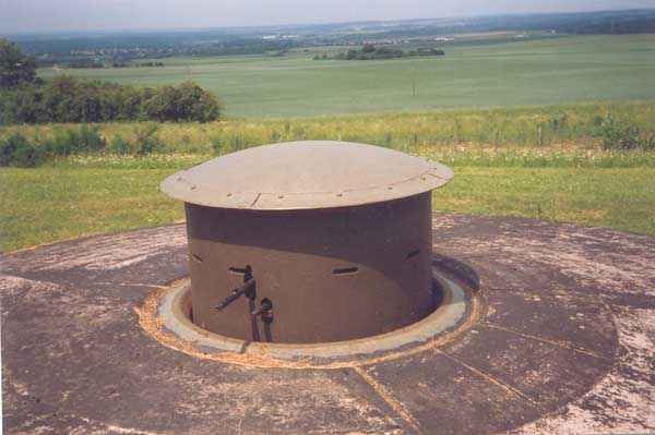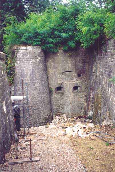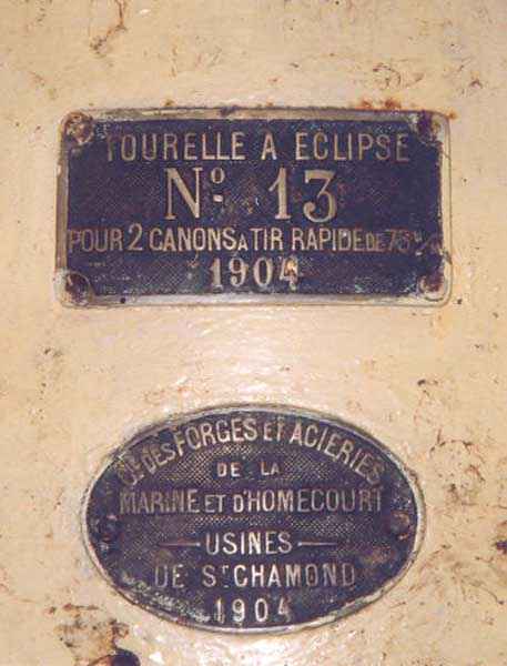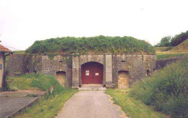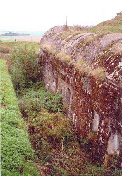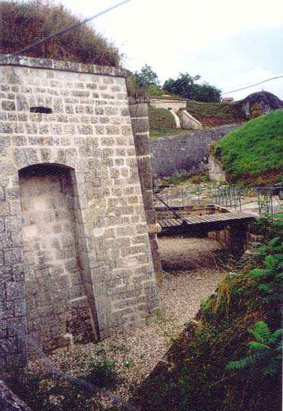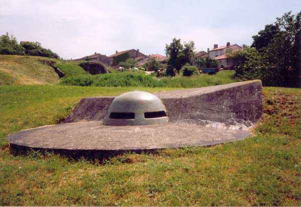 Toul fortified camp, ESE of the city, 1875-1877. 310 m/alt. This battery was included in the list of our first visits, but we were unable to fully appreciate the many peculiarities it concentrated on a rather modest surface area. In the shape of a chevron, its two branches are almost identical, with a length of 160 m and a width of 60 m, including ditches. The entrance building appears very small and isolated. It is located in the hollow of the chevron and includes a porch with an Ardagt and Pilter drawbridge. The block protrudes forward into the ditch so that its sides can beat against the two branches of the gorge ditch. Apart from two guardhouses, no other premises are attached to it. The only walls that touch it are those of the semi-detached escarpment and the fact that it only has protective earth on its tops, added to its recessed outlet, giving the whole a "V" shape, makes it a unique case in all of France. Arriving inside the enclosure, the visitor can, due to modernizations, only refer to old plans to imagine the initial configuration. In the capital, a gallery leading straight to the double caponier of salient III was offered to him. Beforehand, it would have run along its left a housing casemate, a small powder magazine and, above all, would have passed under a casemate, most likely a direct fire casemate. The bulk of the garrison was therefore supplied by the redoubt. The left branch aligned four hollow traverses. The closest to the capital rested against the casemate intended for housing and the other three had the particularity of having their entrance parallel to their single arm. This was the method chosen to ward off blows likely to come from the south; traverse No. 2 was also rooted in a low massif resting on the escarpment. From the first platform ran the sheath serving the wing of salient II. This wing had actions well beyond salient I since the ditch extended in front of it to the road entering the village from the west. Beyond the latter, the defense of the same axis was then entrusted to the detached box of the redoubt. The right branch aligned four coated traverse-shelters. All were angled so as to orient their entrance to the west. All also had two arms, the right being systematically set back except at the southernmost traverse where the left was in turn set back. The battlements of the double caponier which faced south were equipped with small visors and the counterscarp wall of front III-IV was, alone, provided with relieving arches. In 1890, roughly in the center of the right half of the gorge, a barracks was cast in special concrete. It had three barracks plus a small officer's quarters. It had an entrance at the ditch and an outlet into the battery itself. In 1907, the battery received its armor. In the capital, the adjacent rooms were removed to install a machine gun turret. To its left, a very small block received an armored observation post. The four traverses of the left branch were removed, either filled or remodeled. Two artillery platforms with concrete parapet and unique ammunition niches (a square block of four boxes) installed back to the east. In place of the leftmost platform, a block was cast for a 75 Mle 05 turret and its armored observation post. The fin, like the double caponier, will remain as is. The four traverses on the right side were preserved, except for the third, for which there was no longer any space due to the war barracks. All the arms and bottoms of these traverses were filled in and the vaults replaced with a concrete slab. The association "La Citadelle" has done a tremendous job here. The armor is in perfect condition. The tubes of the 75mm turret were recovered from the Mordant fortification and restored. Visitors have the chance to see the two turrets being put into action and withdrawn, and even witness blank firing (08/2007).