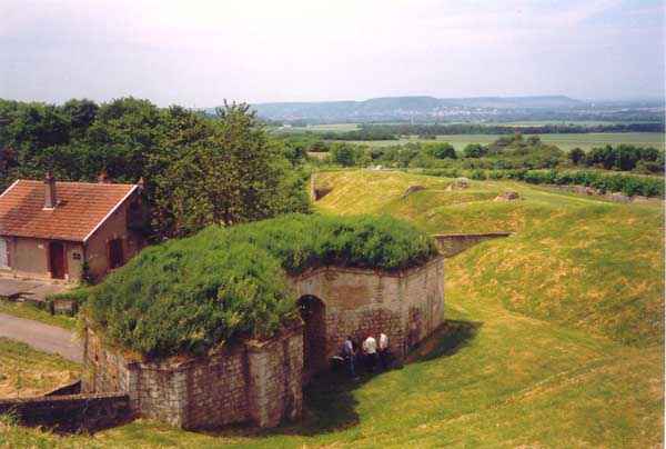 Befestigtes Lager Toul, ostsüdöstlich der Stadt, 1875–1877. 310 m ü. M. Diese Batterie stand auf der Liste unserer ersten Besuche, aber wir konnten die vielen Besonderheiten, die sie auf einer eher bescheidenen Fläche konzentrierte, nicht vollständig erfassen. Die beiden Arme der winkelförmigen Anlage sind nahezu identisch und messen einschließlich Gräben eine Länge von 160 m und eine Breite von 60 m. Das Eingangsgebäude wirkt sehr klein und isoliert. Es befindet sich in der Senke des Winkels und verfügt über einen Vorbau mit einer Ardagt- und Pilter-Zugbrücke. Der Block ragt nach vorne in den Graben hinein, sodass seine Seiten gegen die beiden Arme des Schluchtgrabens schlagen können. Abgesehen von zwei Wachhäusern sind keine weiteren Gebäude daran angeschlossen. Die einzigen Mauern, die ihn berühren, sind die des Doppelsteilhangs, und die Tatsache, dass er nur auf seinen Spitzen Schutzerde hat, die zu seinem zurückgesetzten Auslass hinzugefügt wurde und dem Ganzen eine V-Form verleiht, macht ihn zu einem einzigartigen Fall in ganz Frankreich. Im Inneren der Anlage angekommen, kann sich der Besucher aufgrund von Modernisierungen nur noch anhand alter Pläne ein Bild von der ursprünglichen Konfiguration machen. Im Kapitell bot sich ihm ein Gang, der direkt zur Doppelkaponiere des Frontbogens III führte. Zuvor verlief er links davon an einer Wohnkasematte, einem kleinen Pulvermagazin und vor allem unter einer Kasematte hindurch, höchstwahrscheinlich einer Kasematte mit direktem Feuer. Der Großteil der Garnison wurde somit von der Redoute versorgt. Der linke Arm war mit vier hohlen Traversen verbunden. Die dem Kapitell am nächsten gelegene grenzte an die für die Wohnbewachung vorgesehene Kasematte, und die anderen drei hatten die Besonderheit, dass ihre Eingänge parallel zu ihrem einzigen Arm lagen. Diese Methode wurde gewählt, um Angriffe abzuwehren, die aus dem Süden kommen könnten; Traverse Nr. 2 war ebenfalls in einem niedrigen Massiv verankert, das auf der Böschung ruhte. Von der ersten Plattform verlief die Ummantelung, die dem Flügel des Frontbogens II diente. Dieser Flügel hatte weit mehr Wirkung als Frontbogen I, da sich der Graben davor bis zur Straße erstreckte, die von Westen ins Dorf führte. Jenseits davon wurde die Verteidigung derselben Achse dann dem abgetrennten Kasten der Redoute anvertraut. Der rechte Arm war mit vier beschichteten Traversen-Unterständen ausgerichtet. Alle waren so angewinkelt, dass ihr Eingang nach Westen zeigte. Alle hatten außerdem zwei Arme, wobei der rechte systematisch zurückgesetzt war, außer an der südlichsten Traverse, wo der linke wiederum zurückgesetzt war. Die Zinnen der nach Süden ausgerichteten Doppelkaponiere waren mit kleinen Visieren ausgestattet und nur die Kontereskarpe der Front III-IV war mit Entlastungsbögen versehen. Im Jahr 1890 wurde etwa in der Mitte der rechten Hälfte der Schlucht eine Kaserne aus Spezialbeton gegossen. Sie bestand aus drei Baracken und einem kleinen Offiziersquartier. Sie hatte einen Eingang am Graben und einen Ausgang in die Batterie selbst. 1907 wurde die Batterie gepanzert. Im Kapitell wurden die angrenzenden Räume entfernt, um einen Maschinengewehrturm zu installieren. Links davon erhielt ein sehr kleiner Block einen gepanzerten Beobachtungsposten. Die vier Traversen des linken Arms wurden entfernt, entweder zugeschüttet oder umgestaltet. Zwei Artillerieplattformen mit Betonbrüstung und einzigartigen Munitionsnischen (ein quadratischer Block mit vier Kisten) wurden im Osten wiederaufgebaut. Anstelle der linken Plattform wurde ein Block für einen 75-mm-Turm Mle 05 und seinen gepanzerten Beobachtungsposten gegossen. Die Finne bleibt ebenso wie die Doppelkaponniere erhalten. Die vier Traversen auf der rechten Seite blieben erhalten, mit Ausnahme der dritten, für die aufgrund der kriegsbedingten Kasernen kein Platz mehr war. Alle Arme und Böden dieser Traversen wurden zugeschüttet und die Gewölbe durch eine Betonplatte ersetzt. Der Verein „La Citadelle“ hat hier hervorragende Arbeit geleistet. Die Panzerung ist in perfektem Zustand. Die Rohre des 75-mm-Turms wurden aus der Mordant-Festung geborgen und restauriert. Besucher haben die Möglichkeit, den Einsatz und Abbau der beiden Türme zu beobachten und sogar Leerschüsse zu erleben (08/2007).