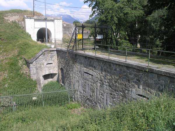 Festung von Bourg-Saint-Maurice, westsüdwestlich der Stadt, 1890–1891 (1893?). 1065 m ü. M. Zusammen mit dem Fort Truc und dem Blockhaus Platte sperrte er die Straße zum Petit-Saint-Bernard-Pass. Er hat eine trapezförmige Form. Die Stirn- und Seitenfronten sind mit einem Graben versehen, der durch Kontekarpenkassetten (einfach am Frontbogen II und doppelt am Frontbogen III) geschützt ist. Die Schlucht hingegen verfügt über eine Verteidigungsanlage, die seit der Einführung des polygonalen Systems nicht mehr genutzt wird, nämlich eine doppelte Kaponniere in der Achse der Zugbrücke mit einem Durchgang auf dem Dach. Ungewöhnlicherweise erfolgt der Zugang zu den Kassen über einen Schacht. Die Gräben sind nicht ausgekleidet, und sowohl die Böschung als auch die Kontekarpe bestehen aus bröckelnder Erde. Am Grund des Grabens befindet sich noch ein Verteidigungstor, an das sich ein überdachter Durchgang mit einer Rampentreppe anschließt. Dieses Tor ist daher später als in den ursprünglichen Plänen vorgesehen und stammt sicherlich aus der Umstrukturierung von 1914-1916. Der Steilhangeingang ist leicht zurückgesetzt, sodass die Kaponniere die gesamte Breite des Grabens einnehmen kann. Die darunter liegende Zugbrücke und ihr Mechanismus sind in sehr gutem Zustand. 1914 war die Batterie Vulmix wahrscheinlich das modernste Bauwerk in den Alpen. Ihre gesamte Artillerie befand sich unter Betonkasematten. Ihre Bewaffnung bestand aus 6 x 120-mm-Geschützen und 2 x 95-mm-Geschützen, die alle paarweise auf die 4 Kasematten verteilt waren. Ihre Flanken sind mit zwei Maschinengewehrtürmen (Vorsprünge I und IV) gesäumt, die über keinen gepanzerten Beobachtungsposten verfügen. Ein einziger betonierter Beobachtungsposten, der für alle Kasematten dient, befindet sich zwischen den Kasematten 3 und 4. Sein Zugangsschacht lässt jedoch keinen Zweifel daran, dass ein gepanzerter Beobachtungsposten installiert werden sollte, und der Krieg brach aus, bevor wir Zeit dazu hatten. Diese Kasematte Nr. 4 erregte durch ihre Konfiguration unsere Aufmerksamkeit. Sie weist alle Merkmale einer Bourges-Kasematte auf, abzüglich des Tradittore-Aspekts (obwohl ihre Aufgabe, die Courbaton-Batterien zu flankieren, außer Zweifel steht) und der versetzten Feuerkammern. Ein Projekt zur Installation eines Galopin Mle 1890-Turms für zwei 155-mm-Langgeschütze wird unerfüllt bleiben. Auf dem Glacis, einige Dutzend Meter vom Frontvorsprung IV entfernt, befindet sich eine Betonkasematte für einen 120-cm-Suchscheinwerfer, eine Kasematte, die auch den Tagesschutz des Scheinwerfers umfasst. Seltsamerweise fehlt jede Spur einer verschiebbaren Panzerklappe. Ein am 01.06.1974 aktualisierter Plan der Unterseite verortet die elektrische Anlage im Keller der Kasematte für die beiden 95-mm-Geschütze, d. h. unter der Front III-IV, aber vor Ort lässt sich dies nicht bestätigen. Was dem Besucher von Vulmix auffällt, ist, dass es dort nicht den geringsten „Wohnraum“ gibt. Keine Kaserne, keine Küche, kein Brotbackofen, nicht einmal Latrinen; diese Besonderheit veranlasste den Unterzeichner des Plans von 1974, die Seitenräume der ersten drei Kasematten als Unterkünfte für die Bediensteten zu bezeichnen, obwohl es sich in Wirklichkeit um Munitionslager handelte. Laut einer Studie von Staff Sergeant BICORNE vom 7. B.C.A. aus dem Jahr 2006 wurden die Kasernen hinter der Batterie jedoch erst 1908 gebaut und bis 1910 in Betrieb gehalten. Im Winter 1901/02 gab der Kommandant von Fort Truc an, dass seine Vorräte aus Vulmix stammten… Wo also ist die Lücke? Der Erste Weltkrieg überraschte die Batterie mit einer vollständigen Umstrukturierung. Eine Betonbaracke sollte am Grund des Grabens rechts vom Eingang errichtet werden, und ein Kofferdamm besetzte den Vorsprung IV, um die Kaponniere vor dem Eingang zu ersetzen. Die Geschützkasematten dürften ebenfalls aus dieser Umstrukturierung stammen und haben lediglich einen Wechsel von Feuerplattformen und Schutztraversen ersetzt. Tatsächlich gibt es (bisher) keine Informationen über diese Batterie zum Zeitpunkt ihrer Errichtung. Sehr ungewöhnlich ist, dass es sich wahrscheinlich um die einzige Bergstruktur handelt, bei der nirgendwo ein Felsbrocken sichtbar ist, nicht einmal am Grund der Gräben! Im August 1914, nachdem die Erdarbeiten für die Baracke bereits abgeschlossen waren, wurde diese Lücke so schnell wie möglich durch den Bau einer einfachen Mauer über dem rechten Teil der Schlucht geschlossen. Die ständige militärische Besetzung der Batterie ersparte ihr die üblichen Unannehmlichkeiten wie Graffiti oder vor allem Verstärkung. So bewahrt im Keller der Kasematte Nr. 3 eine Artilleriewerkstatt ein prächtiges Exemplar einer im Stahlwerk Longwy hergestellten Rollbrücke auf. Die Metalltüren der Seitenbunker der Kasematten 1 bis 3 tragen noch immer das Zeichen ihres Herstellers „Serrurerie CHEVASSU Bourg-St-Maurice“, und die Maschinengewehrtürme besitzen noch immer ihren Ventilator aus den Werkstätten von Air & Feu in Argenteuil. Gemäß Ministerialbeschluss vom 25. März 1924 umfasst die Bewaffnung fortan zwei Geschütze 155 L Mle 1877 und vier Geschütze 155 C Schneider sowie die zwei 95-mm-Geschütze und die beiden Maschinengewehrtürme. Über den tatsächlichen Einbau dieser Bewaffnung in die Kasematten können wir keine kategorische Aussage treffen, aber es ist klar, dass die Kasematten 2 und 3 umgebaut wurden, um Lafetten mit Spaten aufzunehmen, die auf einer Art Arbel-Plattform, also mit einem vorderen Drehpunkt, befestigt waren. Die Umbauten der Kasematte 2 sind nicht identisch mit denen der Kasematte 3. Die einzigen Räume in der Schlucht befinden sich im Kellergeschoss und sind über eine Treppe erreichbar, die links im Eingangsbereich öffnet. Diese Treppe umgeht den Raum eines Lastenaufzugs, dessen Winde sich noch im Untergeschoss befindet. Wir befinden uns nun auf der Ebene der Räume für Munition und Treibladungen. Eine Linie zeigt