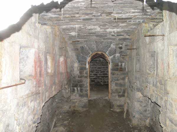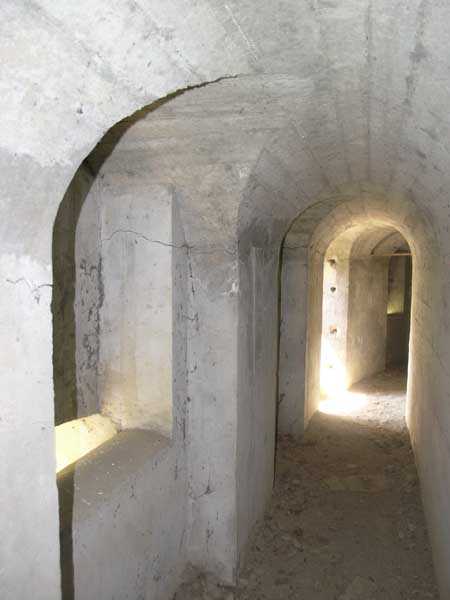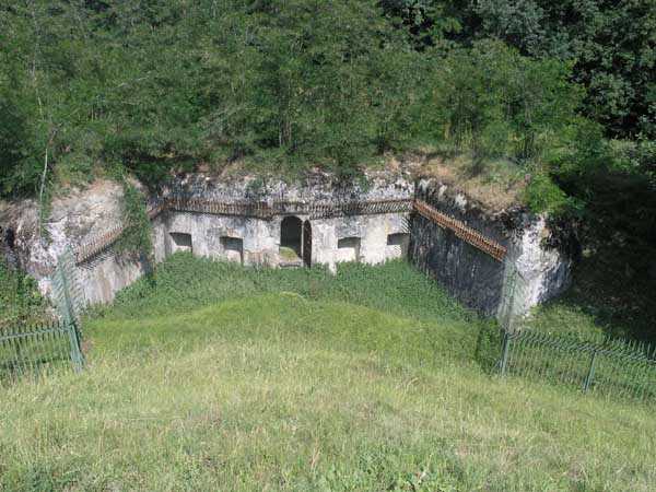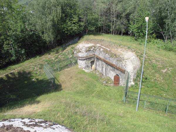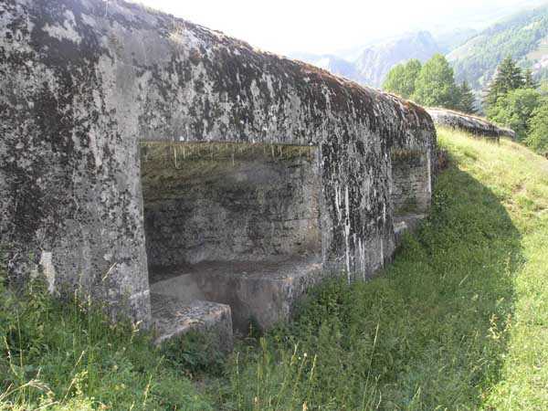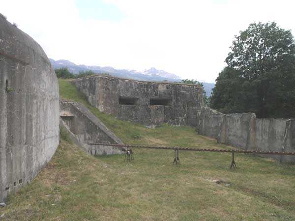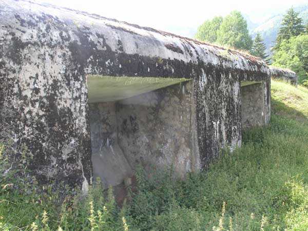 Bourg-Saint-Maurice Square, west-southwest of the town, 1890-1891 (1893?). 1065 m/alt. It blocked the road to the Petit-Saint-Bernard pass in conjunction with the Truc fort and the Platte blockhouse. It has a trapezoidal shape. The head and side fronts have a ditch defended by counterscarp coffers (single at salient II and double at salient III), while the gorge uses a defense that has fallen into disuse since the advent of the polygonal system, namely a double caponier in the axis of the drawbridge with a passage on its roof. Unusually, access to the coffers is via a shaft. The ditches are not lined and both the escarp and counterscarp are made of crumbling earth. At the bottom of the ditch, there remains a defensive gate on which a covered passageway with a ramp staircase is singularly abutted. This gate is therefore later than the initial plans and certainly dates from the reorganization of 1914-1916. The escarpment entrance is slightly set back, which allows the caponier to occupy the entire width of the ditch. The drawbridge below and its mechanism are in very good condition. In 1914, the Vulmix battery was probably the most modern structure in the Alps. All of its artillery was under concrete casemates. Its armament consisted of 6 x 120 mm guns and 2 x 95 mm guns, all distributed in pairs in the 4 casemates. Its flanks are lined with two machine gun turrets (salients I and IV), which do not have an armored observation post. A single concreted observation post, acting for all the casemates, is located between casemates 3 and 4. Its access shaft, however, leaves no doubt that an armored observation post was to be installed, and the war came before we had time to do so. This casemate No. 4, by its configuration, caught our attention. It has all the ingredients of a Bourges casemate, minus the tradittore aspect (although its mission of flanking the Courbaton batteries is beyond doubt) and the offset of the firing chambers. A project to install a Galopin Mle 1890 turret for two 155mm long guns will remain unfulfilled. On the glacis, a few dozen meters from salient IV, there is a concrete casemate for a 120cm searchlight, a casemate also including the searchlight's daytime shelter. Curiously, there remains no trace of any sliding armored shutter. A plan of the underside, updated on 01-06-1974, places the electrical plant in the basement of the casemate for the two 95 mm guns, i.e. under the III-IV front, but, on site, nothing allows us to confirm this. What strikes the visitor to Vulmix is that there is not the slightest "living" room there. No barracks, no kitchen, no bread oven or even latrines; this singularity prompted the signatory of the 1974 plan to refer to the lateral rooms of the first three casemates as being shelters for the servants when in fact they are ammunition stores. However, according to a study in 2006 by Staff Sergeant BICORNE of the 7th B.C.A., the barracks behind the battery were not built until 1908 and continued until 1910. During the winter of 1901-1902, the commander of Fort Truc indicated that his supplies came from Vulmix… So where is the gap? The First World War surprised the battery in a complete reorganization. A concrete barracks was to be placed at the bottom of the ditch to the right of the entrance and a cofferdam occupied salient IV to replace the caponier in front of the entrance. The gun casemates must also date from this reorganization and have simply replaced an alternation of firing platforms and shelter traverses. In fact, information on this battery at the time of its construction is (so far) non-existent. A very unusual thing is that it is probably the only mountain structure where nowhere is a piece of rock visible, not even at the bottom of the ditches! In August 1914, the earthworks for the barracks having already been completed, this breach was remedied as quickly as possible by building a simple wall above the right part of the gorge. The constant military occupation of the battery spared it the usual inconveniences such as graffiti or, above all, reinforcement. Thus, in the basement of casemate No. 3, an artillery workshop preserves a splendid specimen of a rolling bridge manufactured at the Longwy steelworks. The metal doors of the side bunkers of casemates 1 to 3 still bear the mark of their manufacturer "serrurerie CHEVASSU Bourg-St-Maurice" and the machine gun turrets still have their fan from the Air & Feu workshops in Argenteuil. By ministerial decision of March 25, 1924, the armament will henceforth include 2 155 L Mle 1877 guns and 4 155 C Schneider guns as well as the 2 95 mm guns and the two machine gun turrets. We cannot be categorical about the actual installation of this armament in the casemates, but it is clear that casemates 2 and 3 underwent modifications to accommodate carriages equipped with spades fixed on a type of Arbel platform, therefore with a front pivot. The modifications of casemate 2 are not identical to those of casemate 3. The only rooms in the gorge are in the basement, and are accessed by a staircase opening to the left in the entrance porch. These stairs bypass the space of a freight elevator, the winch of which remains on the lower level. We are then at the level of the rooms concerning the ammunition and their propellant charges. A line shows four rooms whose door was surmounted by a lamp crenelation. These crenels were filled in and replaced by others located in one of their corners (exactly as can be seen in the rock magazines of the Truc and Mont forts). This rearrangement will lead to the placement here, side by side, of two battlements illuminating two adjoining rooms; a rare if not unique arrangement. In the second of these rooms, which were none other than loading workshops and projectile depots, a typical telephone exchange from the interwar period has come down to us. Following this alignment is a powder magazine. A remarkable detail, although the windows of the battlements have disappeared