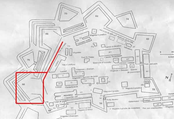 Západní fronta verdunské citadely s bastionem 66 tvoří mimořádně jednotný celek, vycházející z Vaubanova původního návrhu, který byl koncem 19. století výrazně přestavěn vojenskými inženýry. Tento úsek, obrácený k údolí Mázy a silnici na Bar-le-Duc, byl od roku 1878 posílen úkryty pro střelce a klenutým skladem střelného prachu, chráněným silnou vrstvou zeminy. V interiéru bastionu 66 se nachází zděné dvojité prostory, které sloužily jako muniční sklad, dílna nebo ubytování posádky. Příčná galerie spojuje obě čelní stěny a poterna se schodištěm v záhybu ústí do příkopu. V roce 1916 byly do starých střílen vloženy betonové kulometné stanoviště doplněné o střelecké otvory ve vnější zdi. Tento převážně zachovalý komplex názorně ukazuje přechod od bastionového systému k podzemní obraně a dokládá, jak byly Vaubanovy linie přizpůsobeny moderní válce.